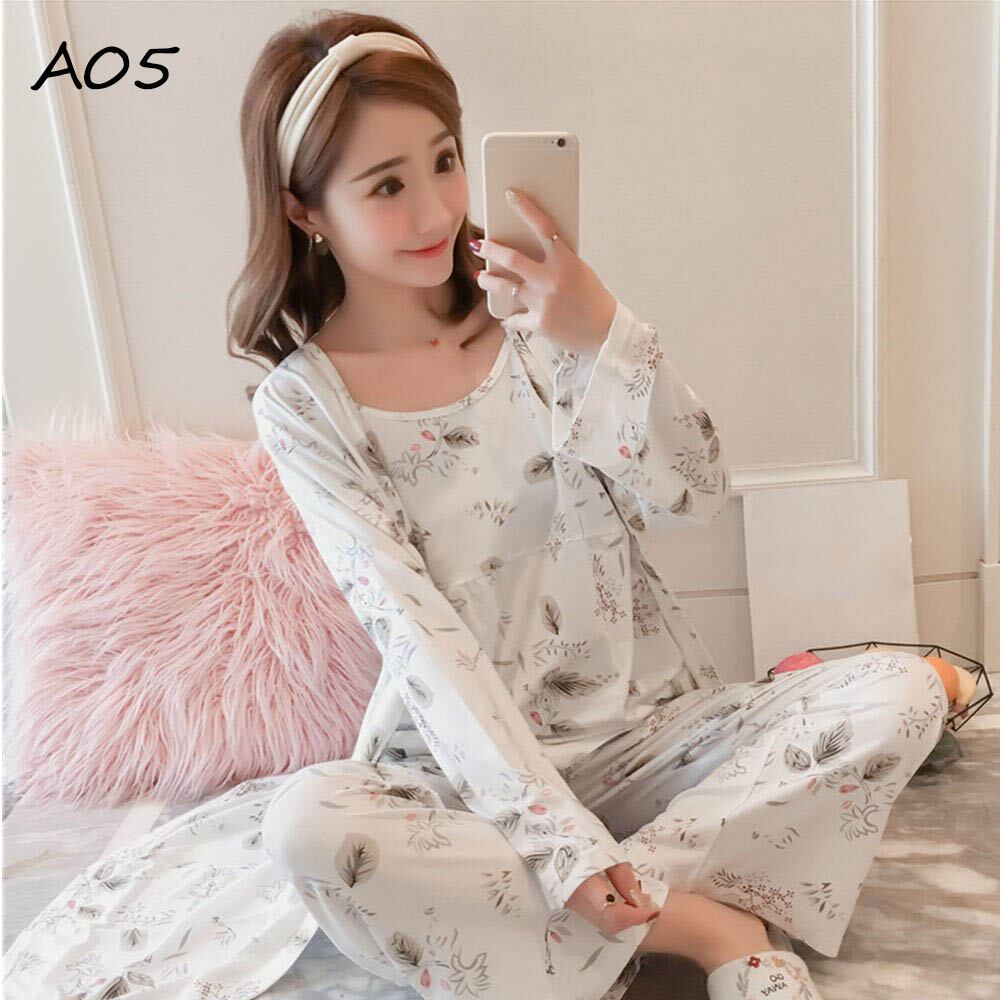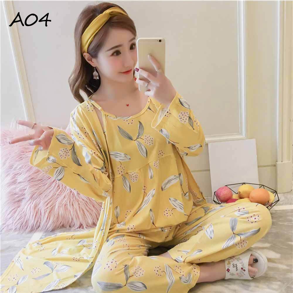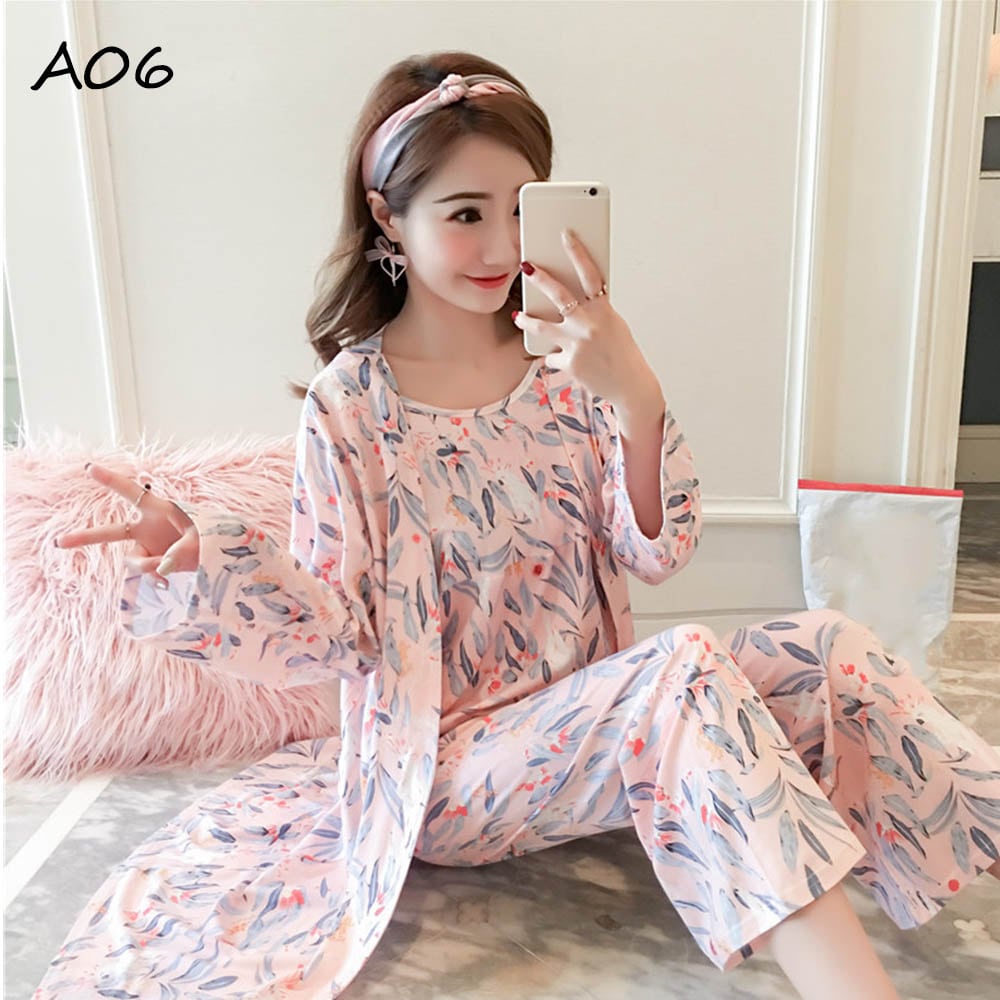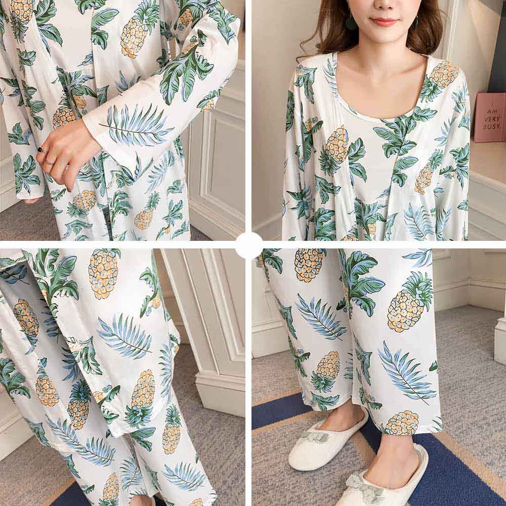 同柄のロングカーディガンとキャミソールとロングパンツがついた便利なパジャマ3点セット