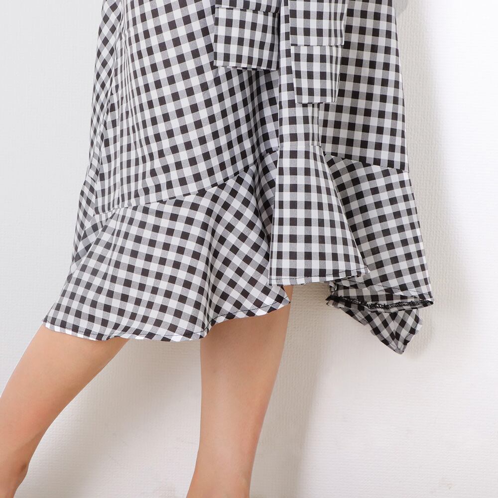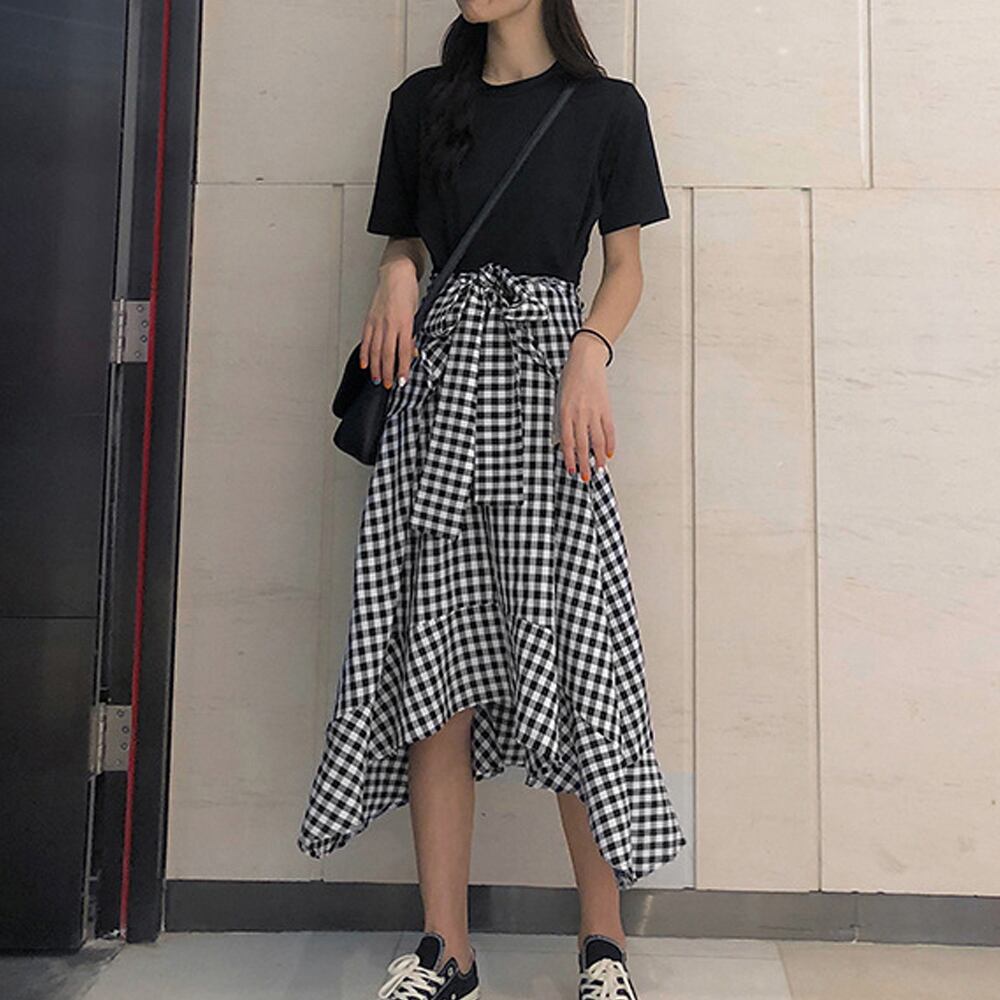 半袖カットソーとイレギュラーヘムラインチェック柄がガーリーで上品さを備えた印象を与えます