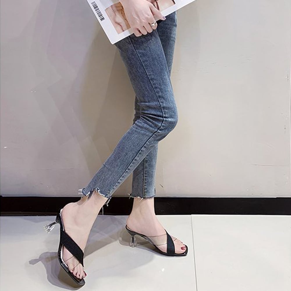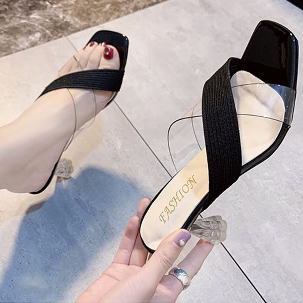 リブベルトとクリア素材を使用し、涼しげな足元に導く異素材mixストラップミュール