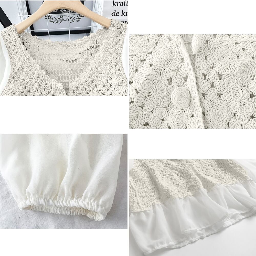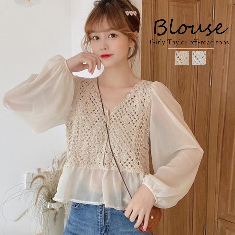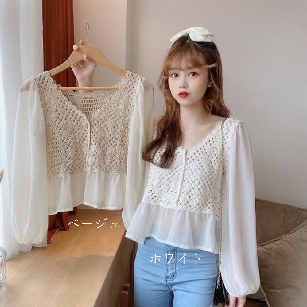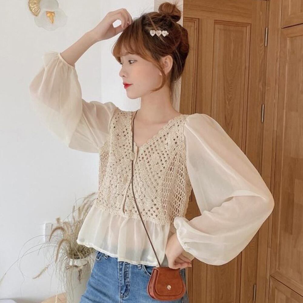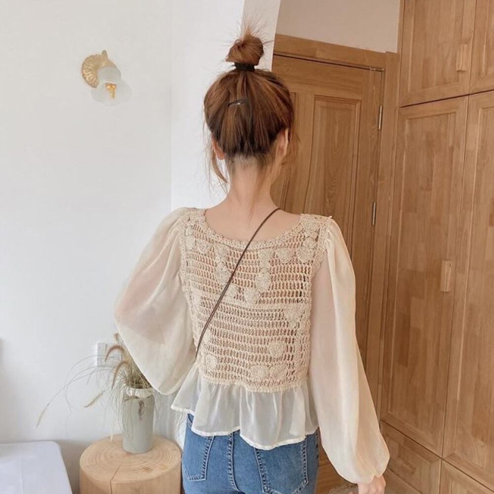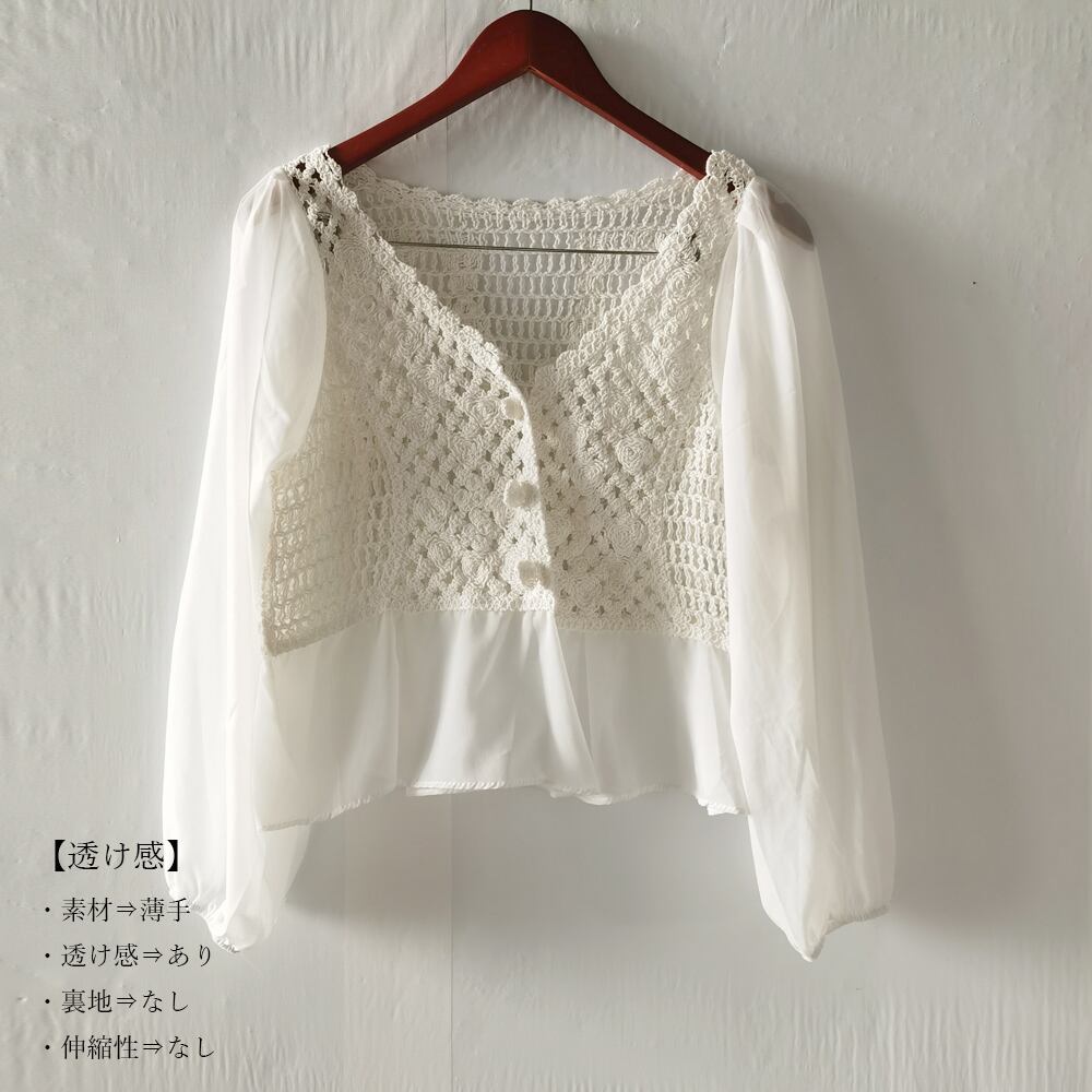 袖部分と裾部分に異素材を重ねてエレガントに仕上げたフェミニンなかぎ編み切替ブラウス