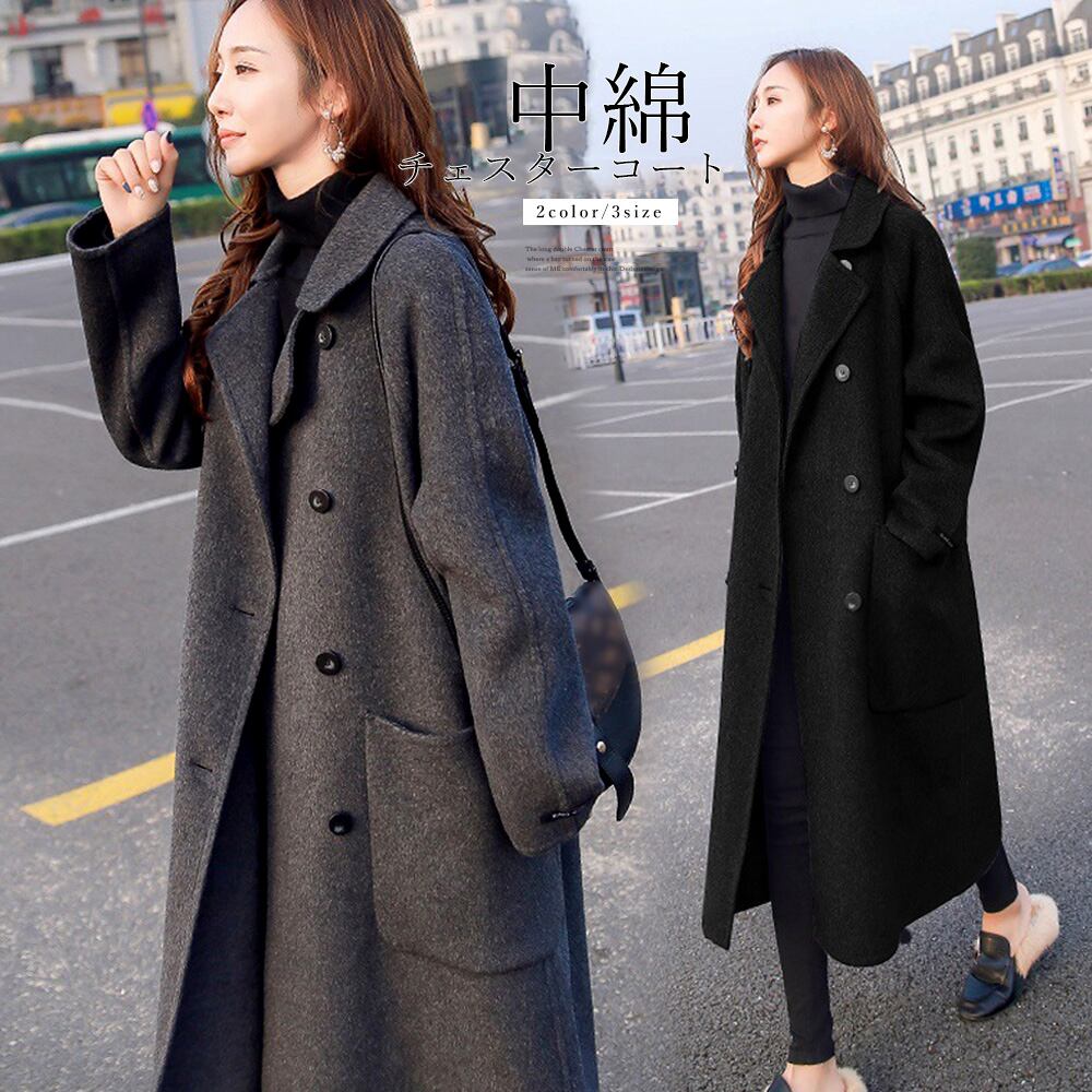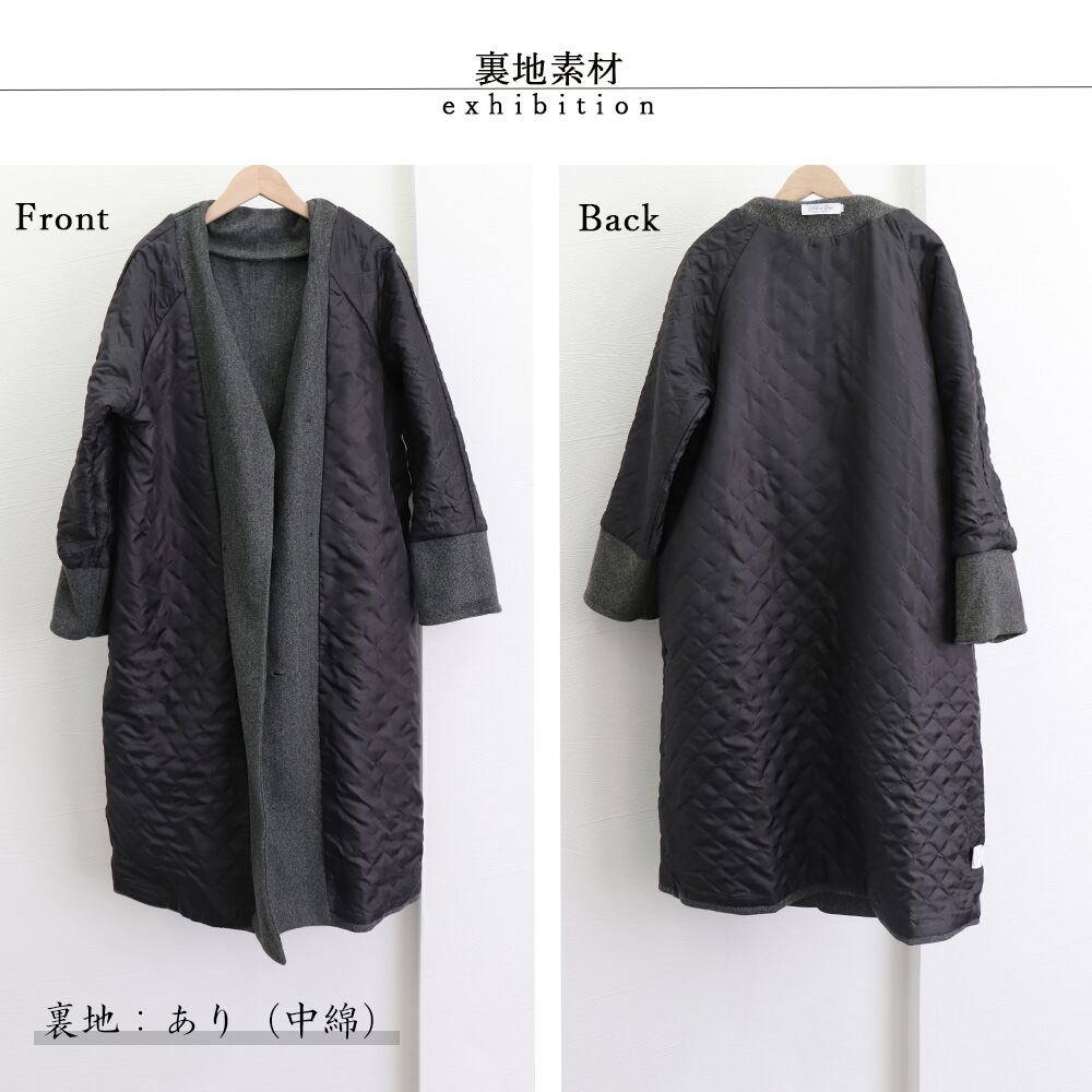 中綿入りのウールタッチの生地感はハリがあって、保温力が高く女性らしさを惹き立て、大きめのポケットは小物などの収納に便利な上着やせにも見える