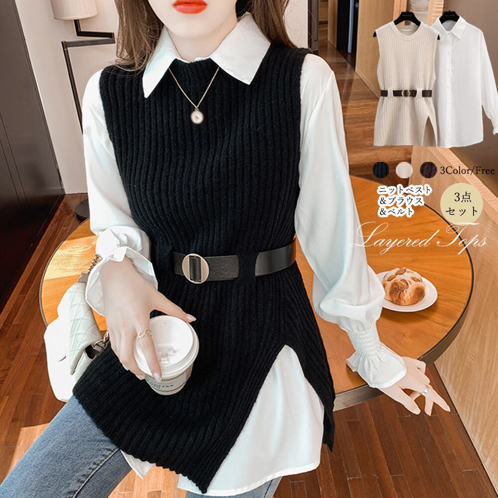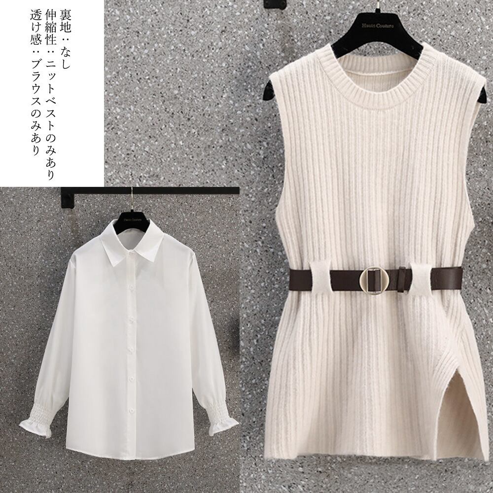 シャーリング袖のブラウス、ニットベストとベルトの3点セットです