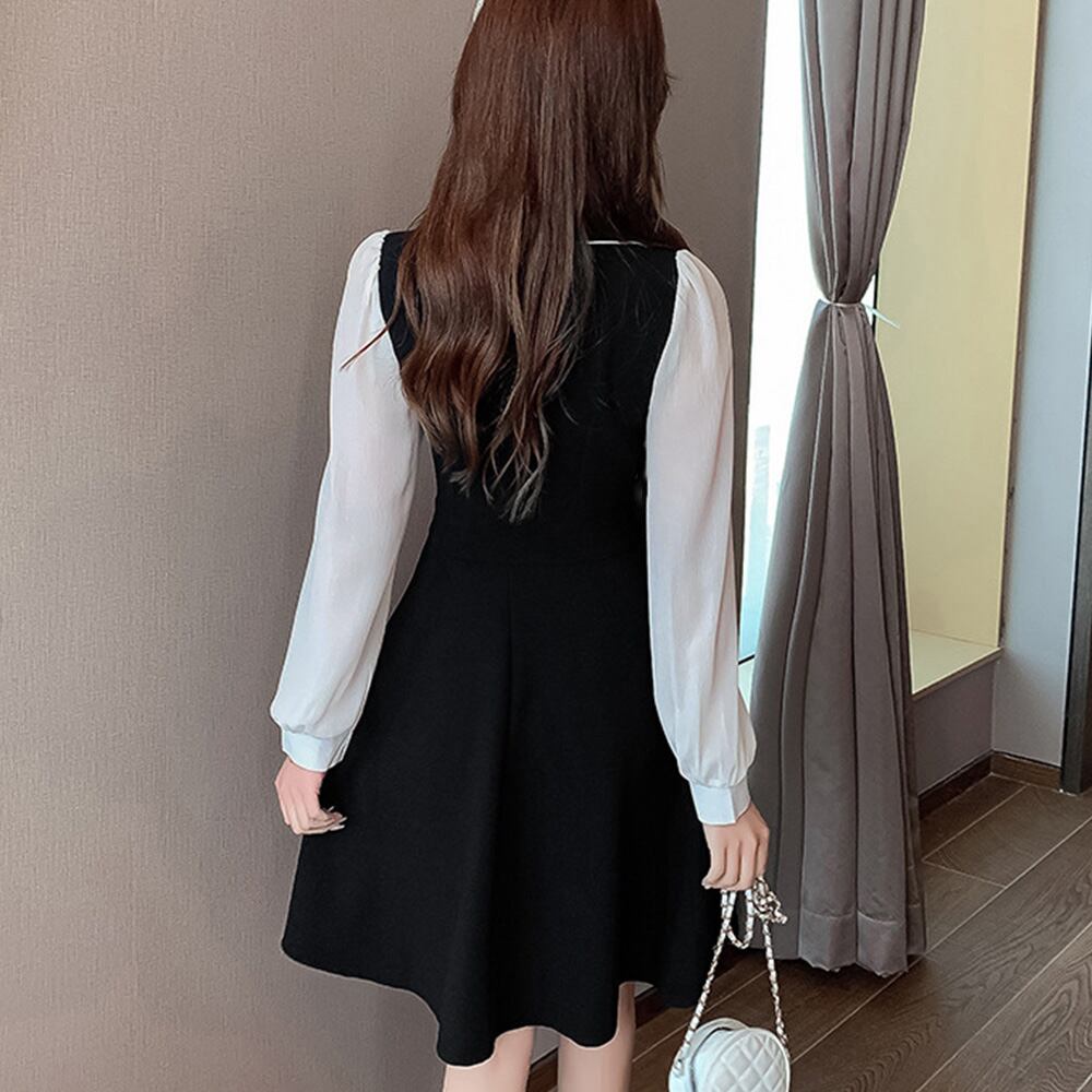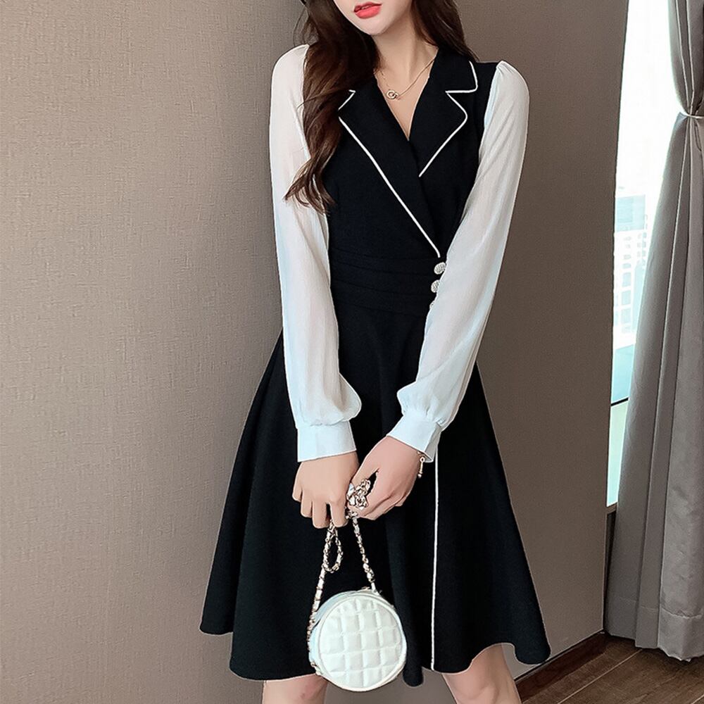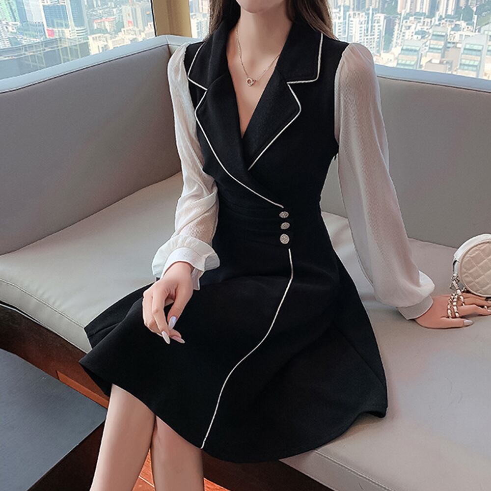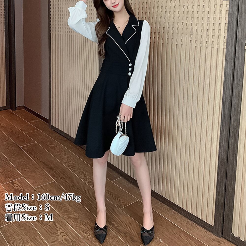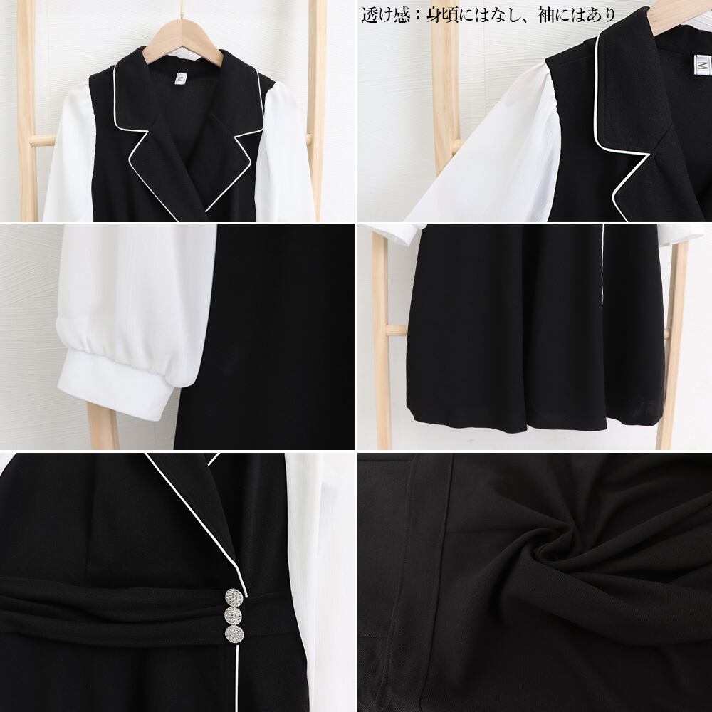 テーラードジャケットのようなきちんと感のあるカシュクール折り襟に袖切り替えを加えてキュートさをプラスした膝上丈ワンピース