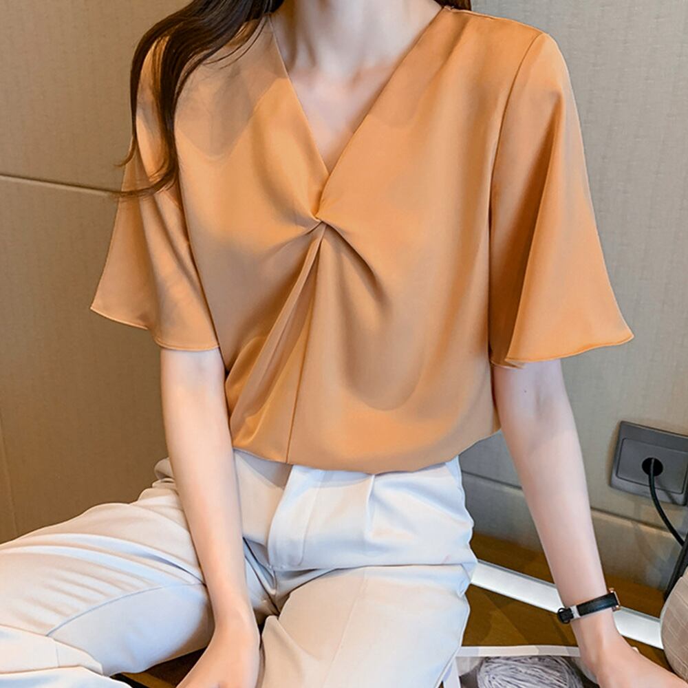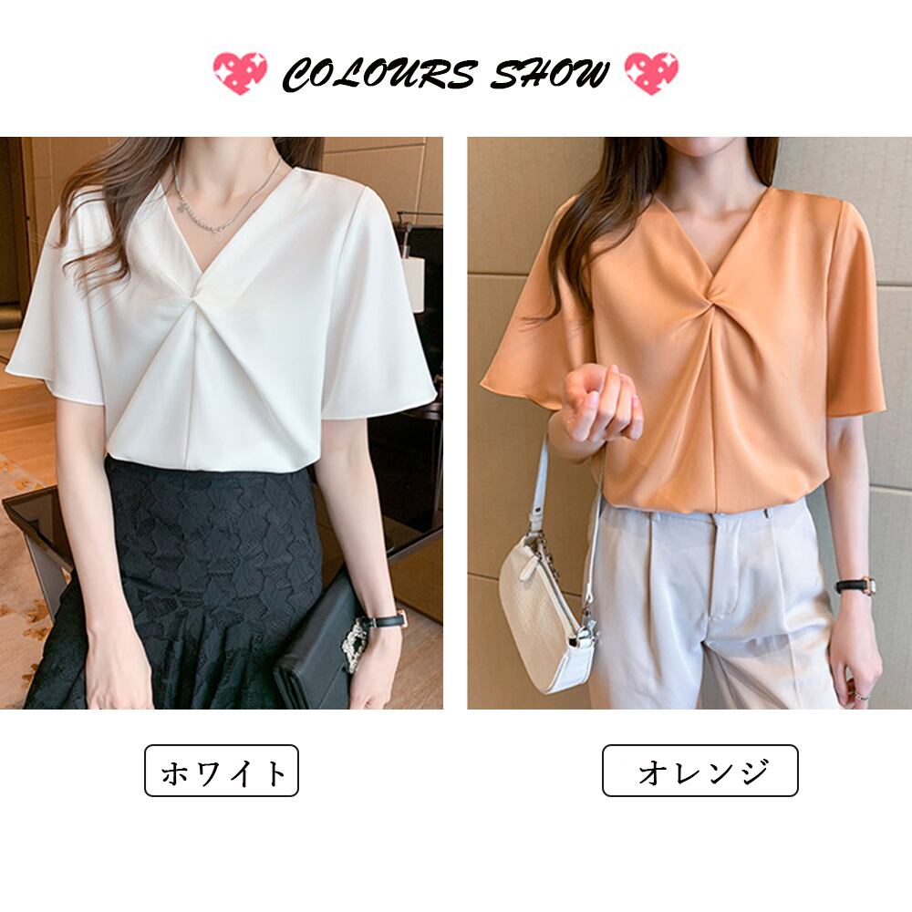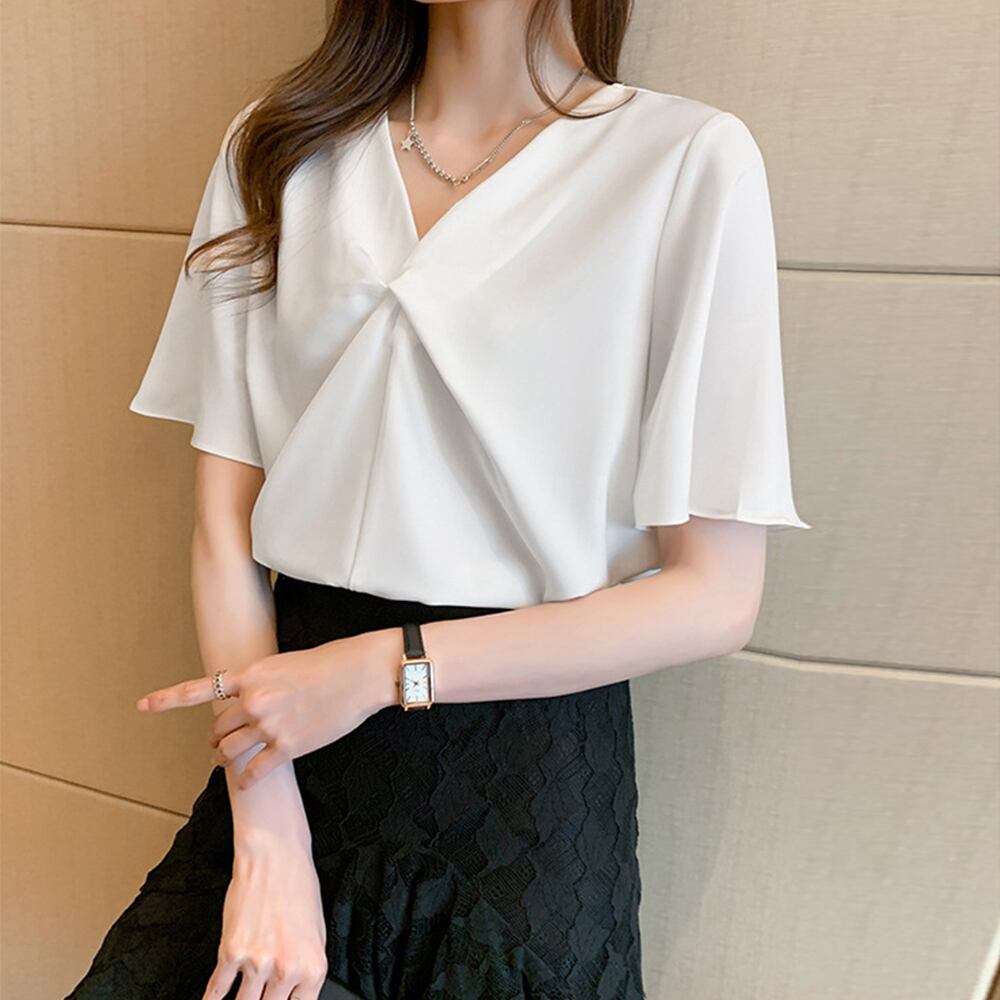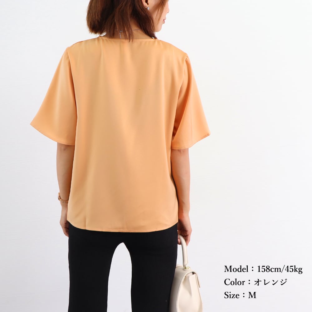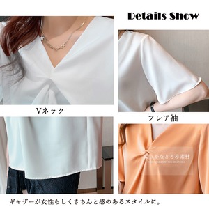 Vネックが顔周りをすっきりと見せてくれるシャツブラウス