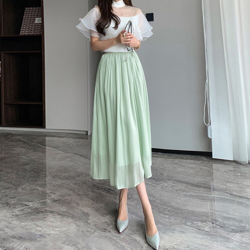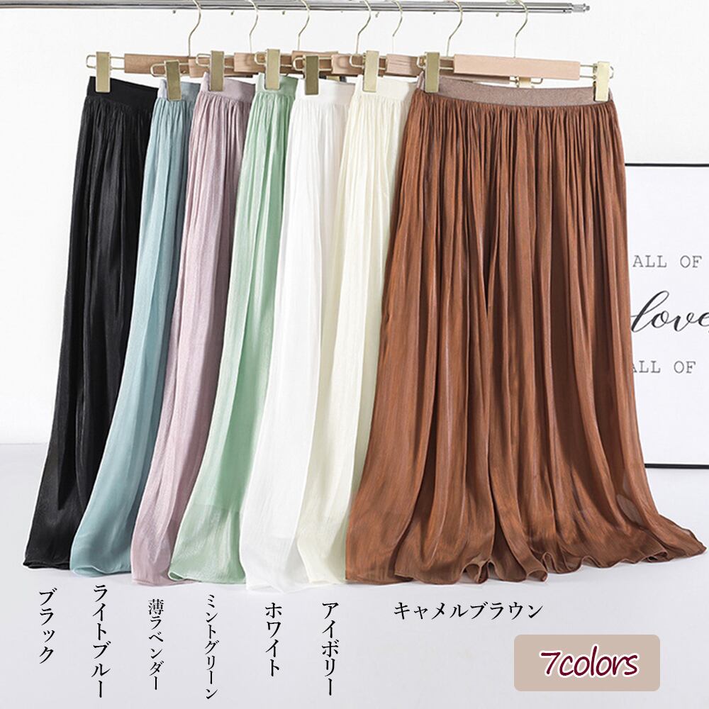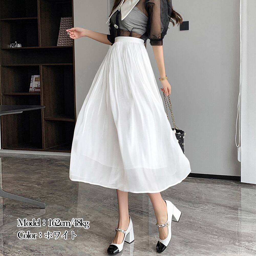 光沢感があり、なめらかな質感が特徴のフレアスカート