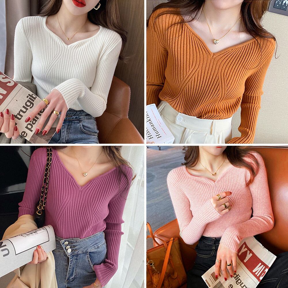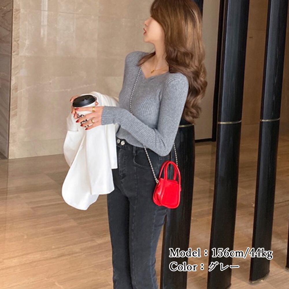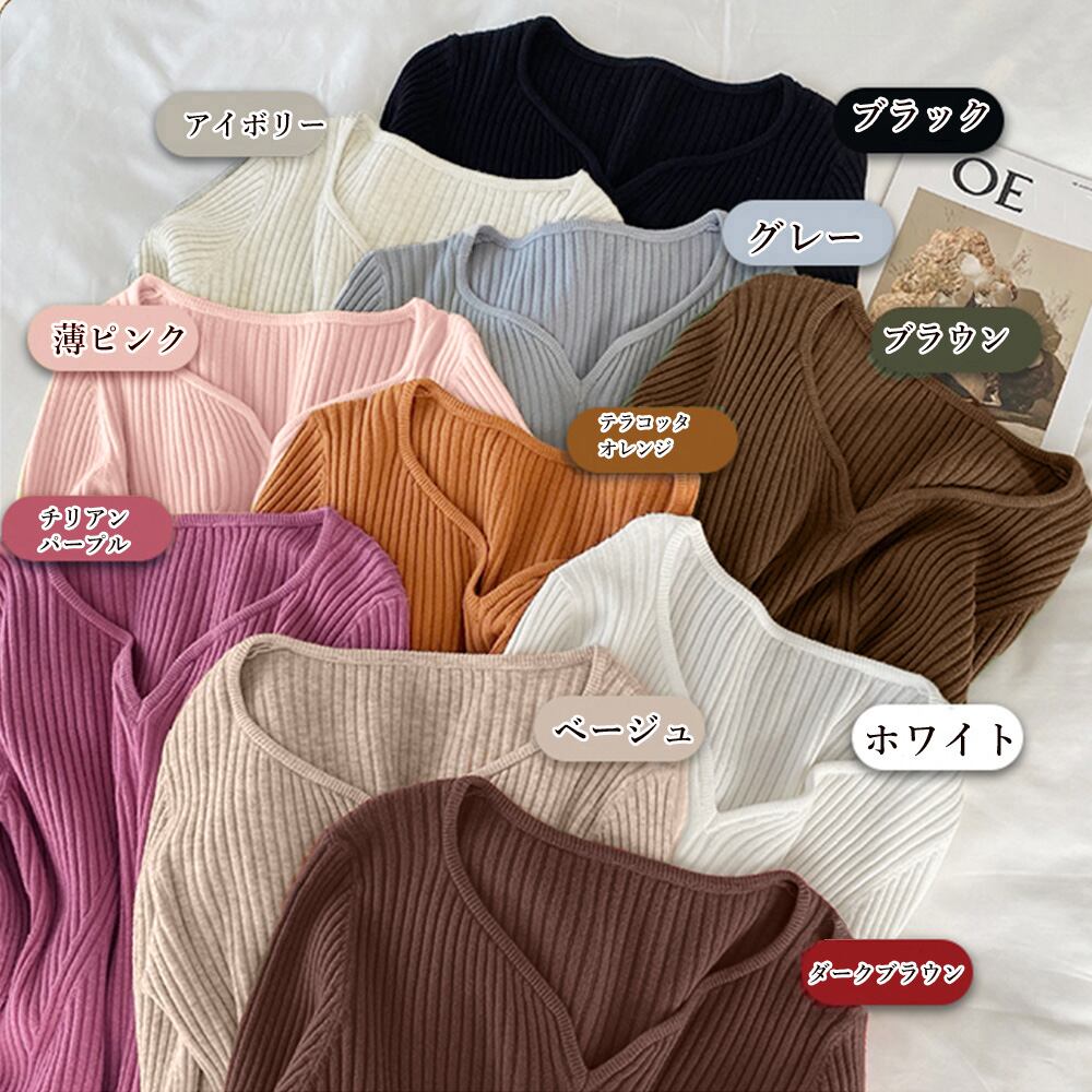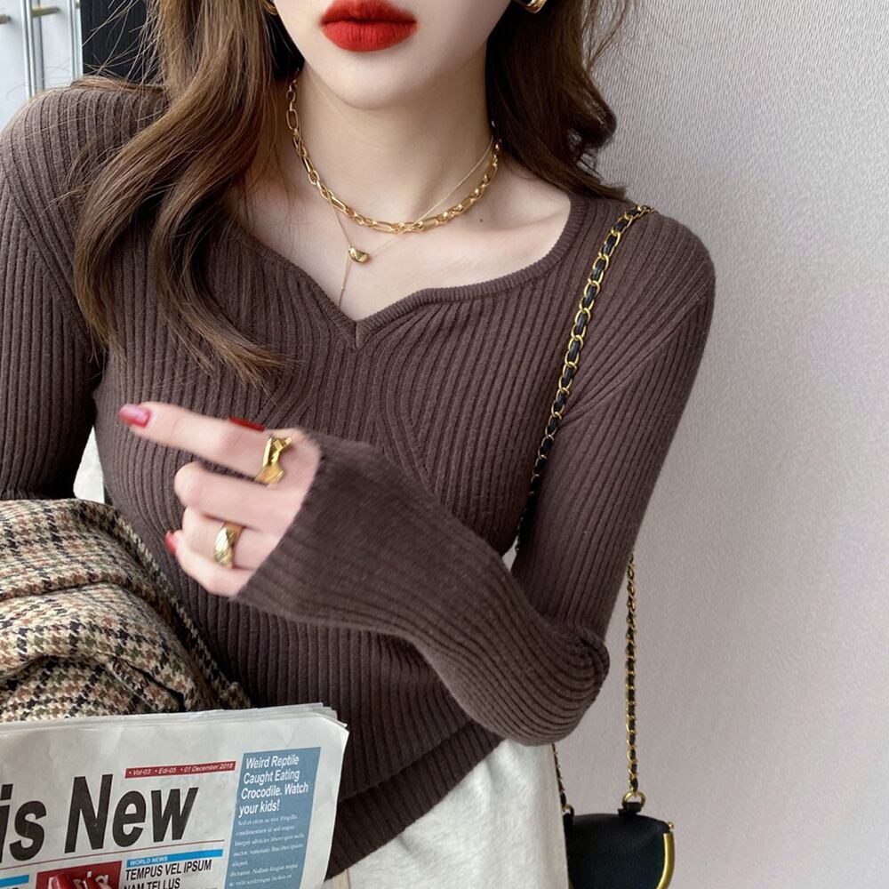 ハートネックで首元がすっきり綺麗に見える長袖タイトニットトップス