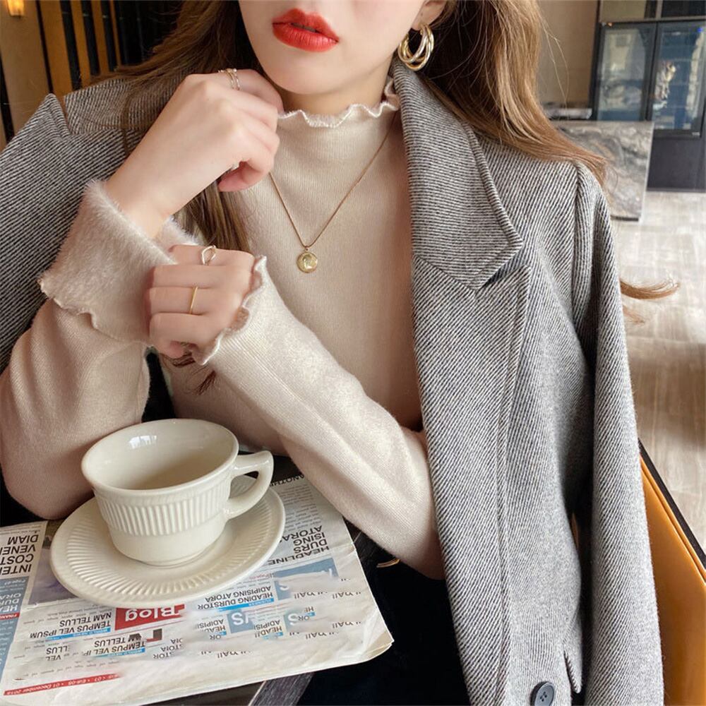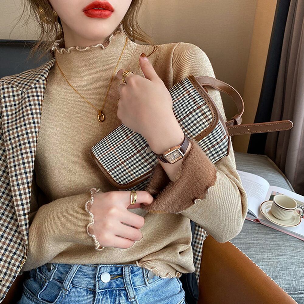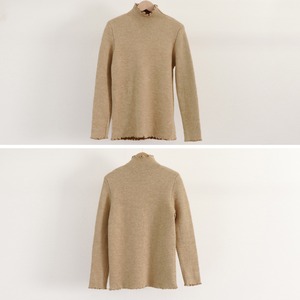 裏面はふんわり柔らかい肌当たりの起毛生地で、熱を逃がさず内側から温もりを与えてくれるハイネックニットトップス