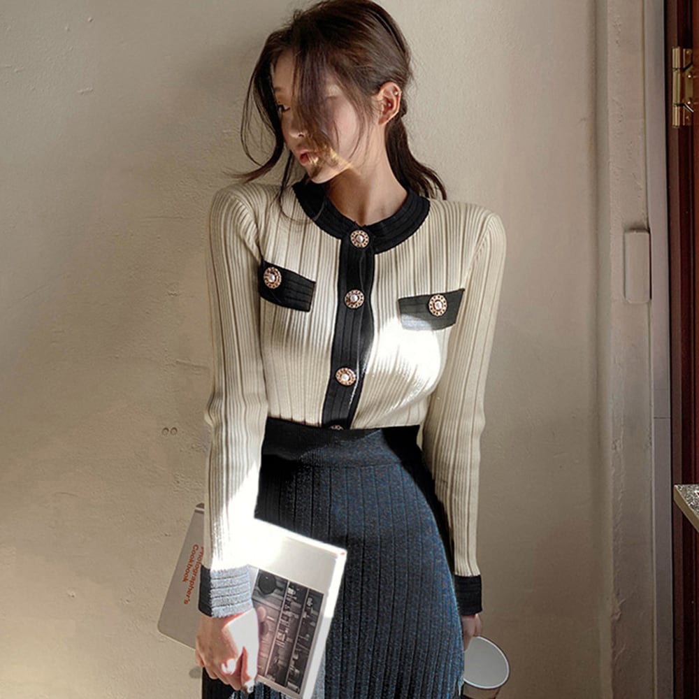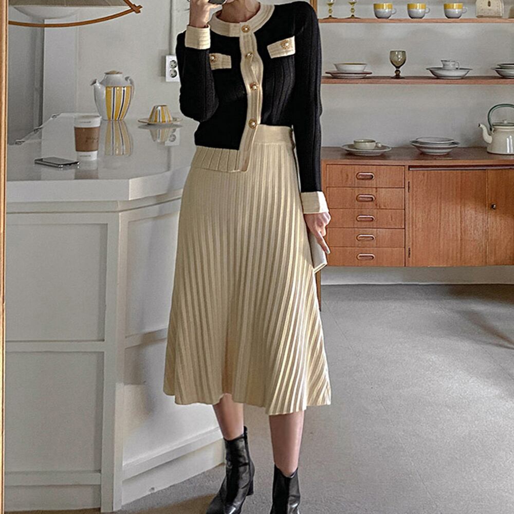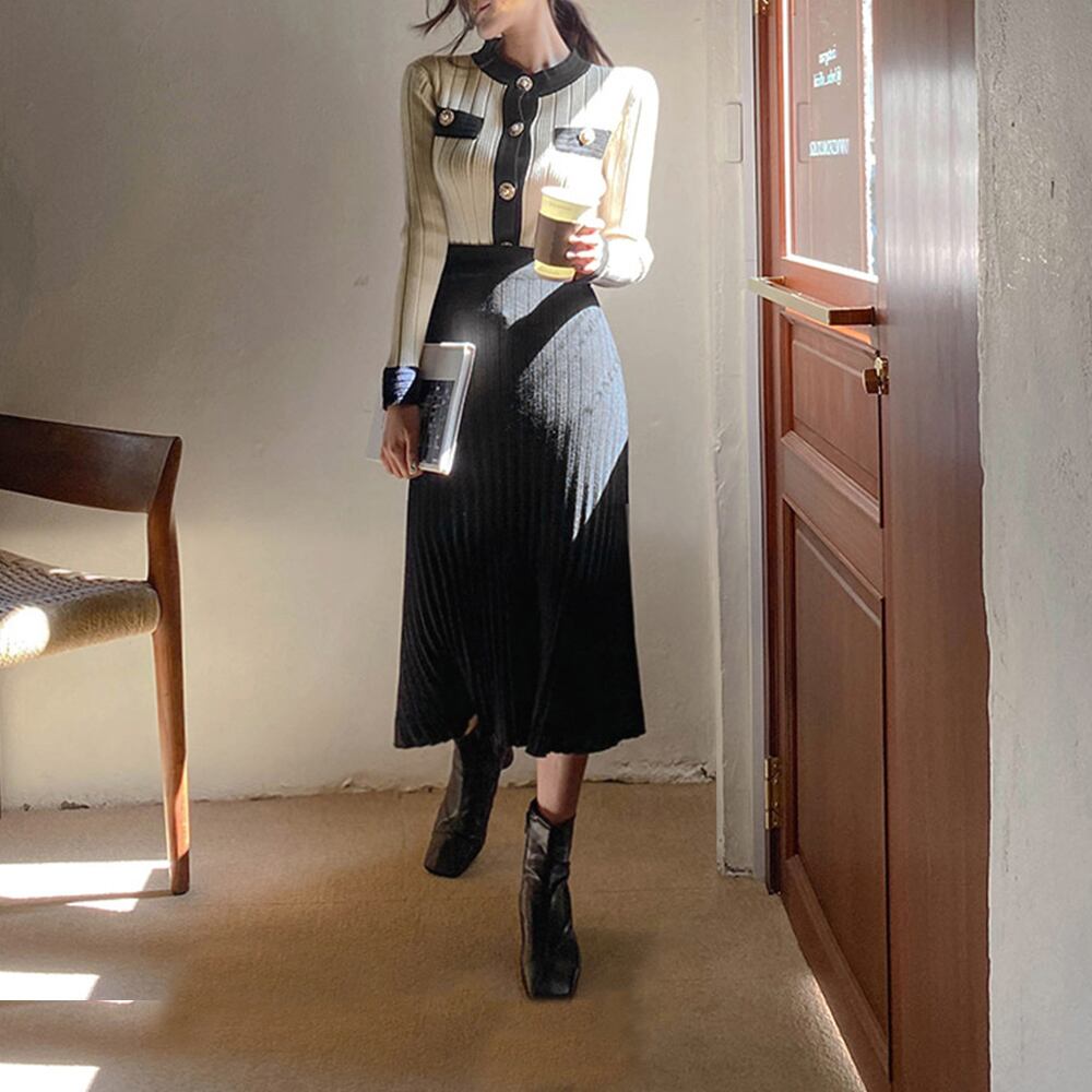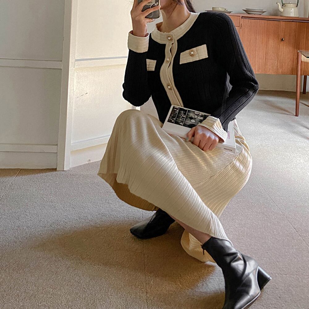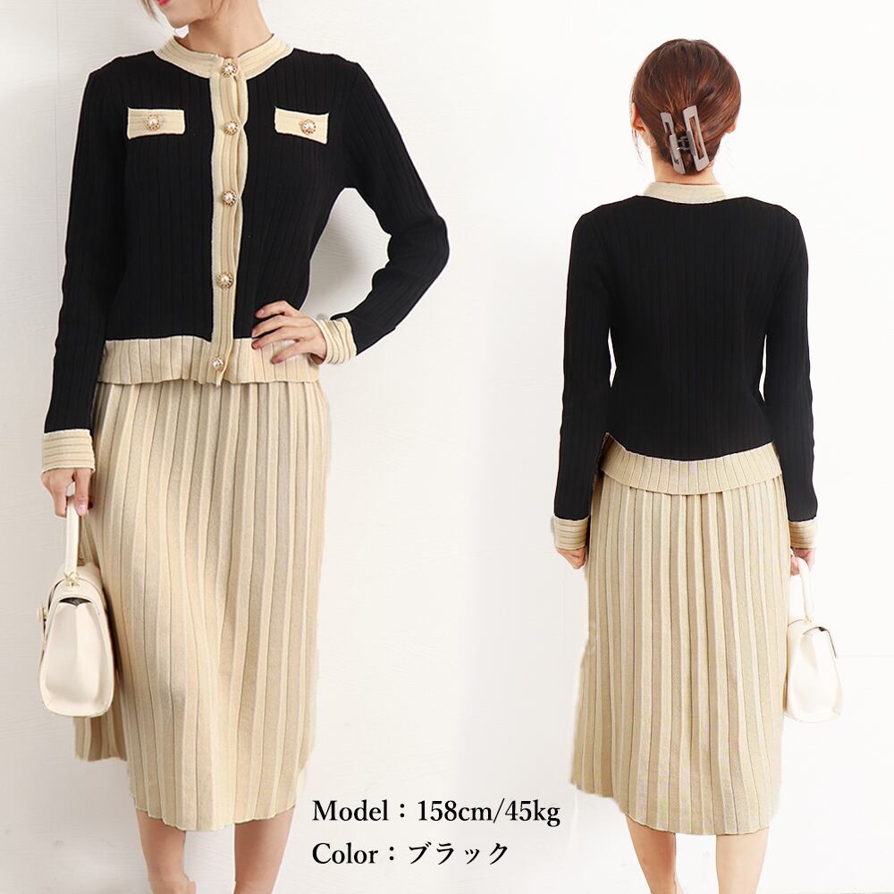 バイカラーでトレンド感があり、落ち着いた色味で万能に着て頂けるクラシカルなニットセットアップ
