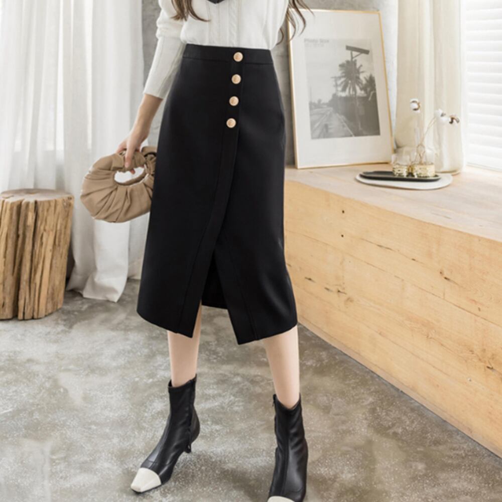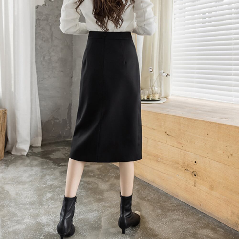 裾に向かって緩やかに広がるAラインデザインで動きやすいミモレ丈スカート