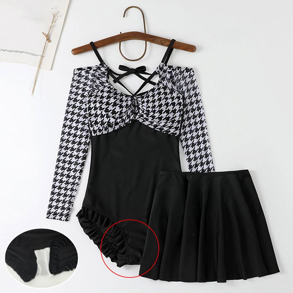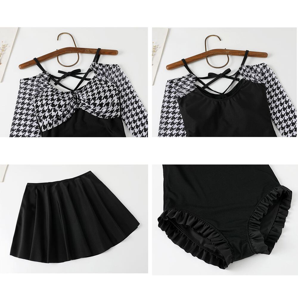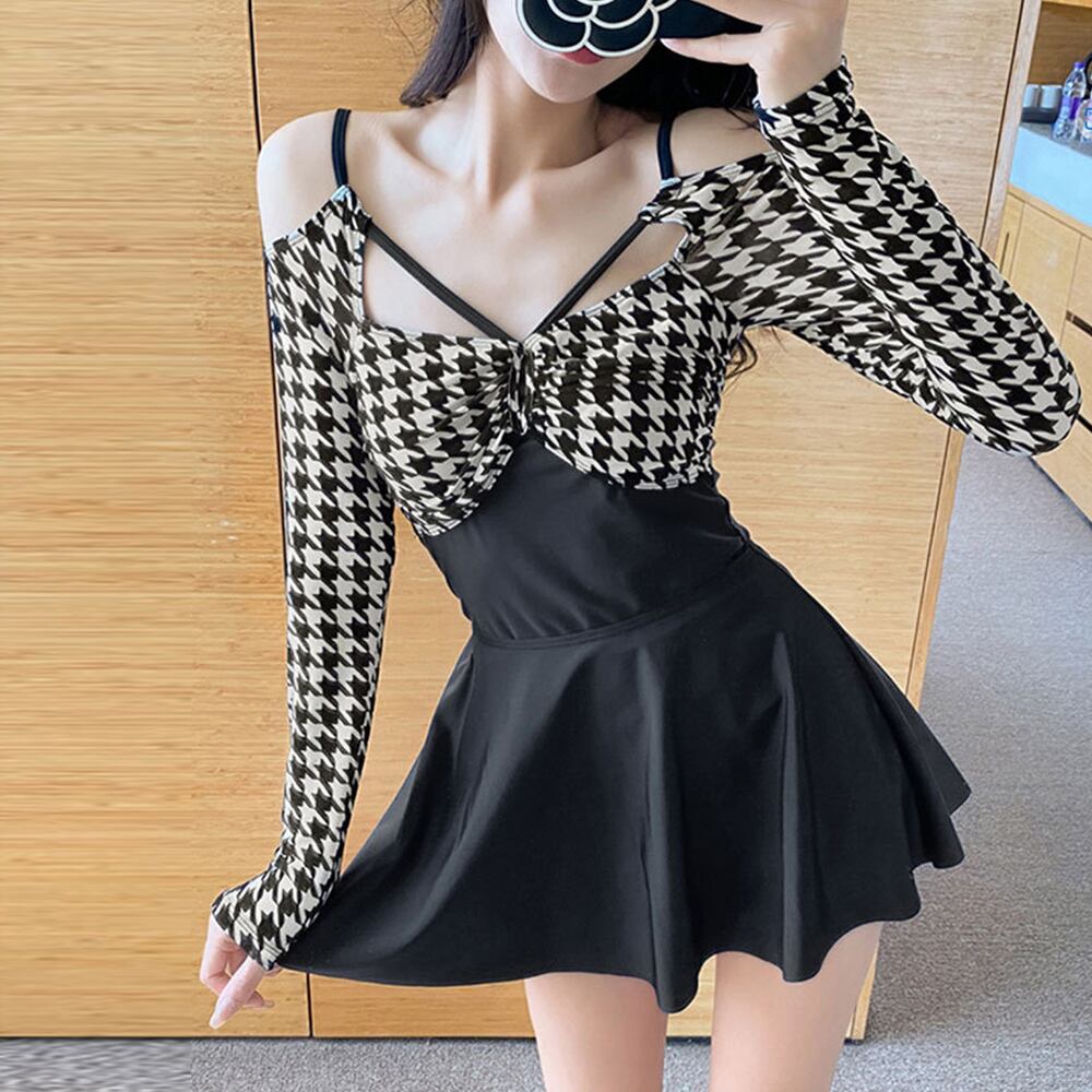 千鳥柄と無地の切り替えがクラシカルなワンピースの水着セット