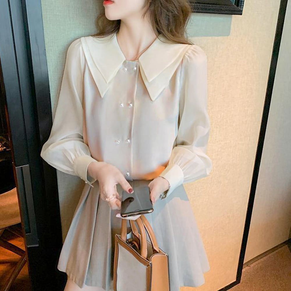 ダブルボタンとダブル襟でデザインされた前立てがお洒落なシフォンブラウス