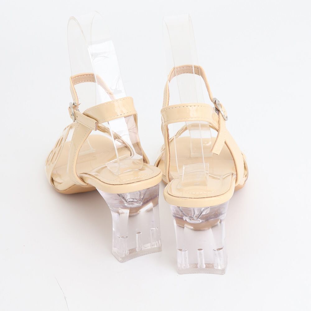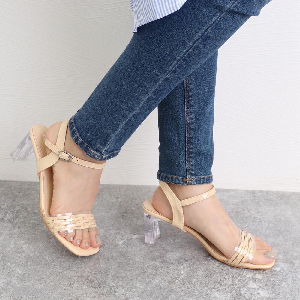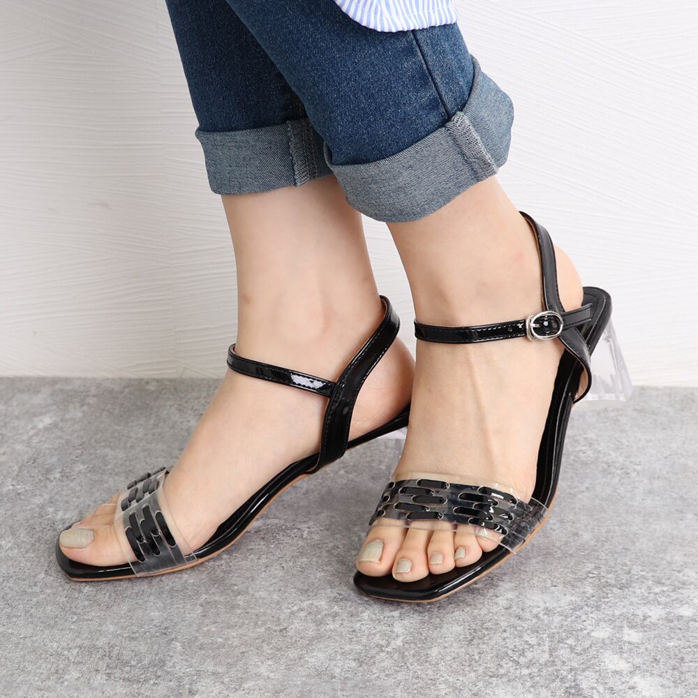 シーズンムード高まるクリアヒールがポイントのスクエアトゥサンダル