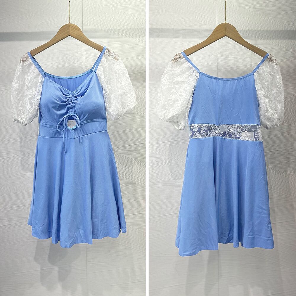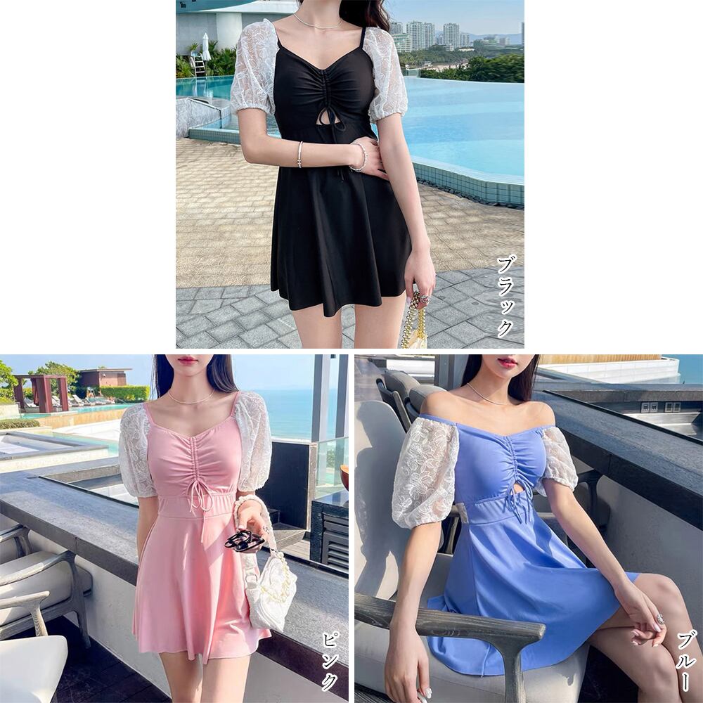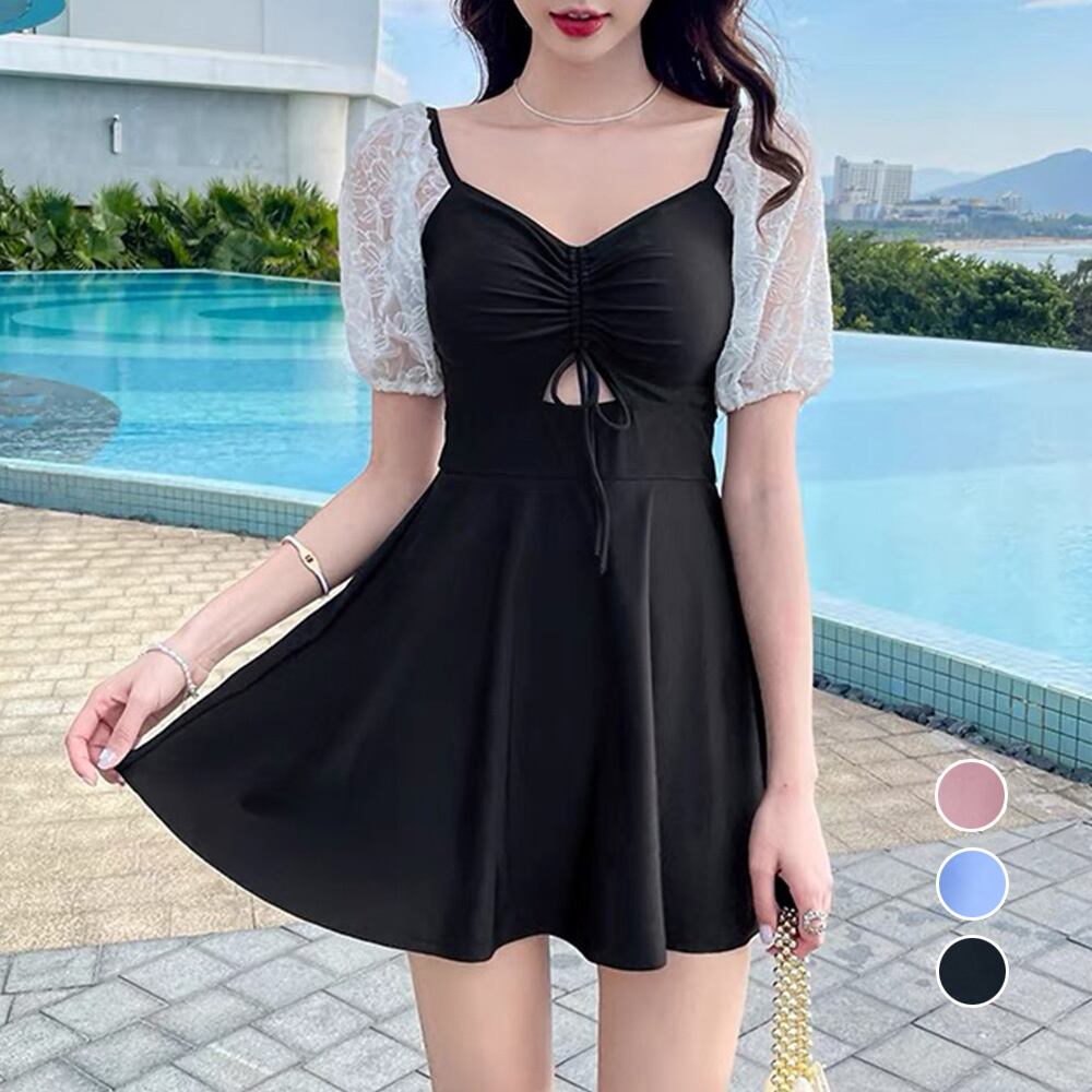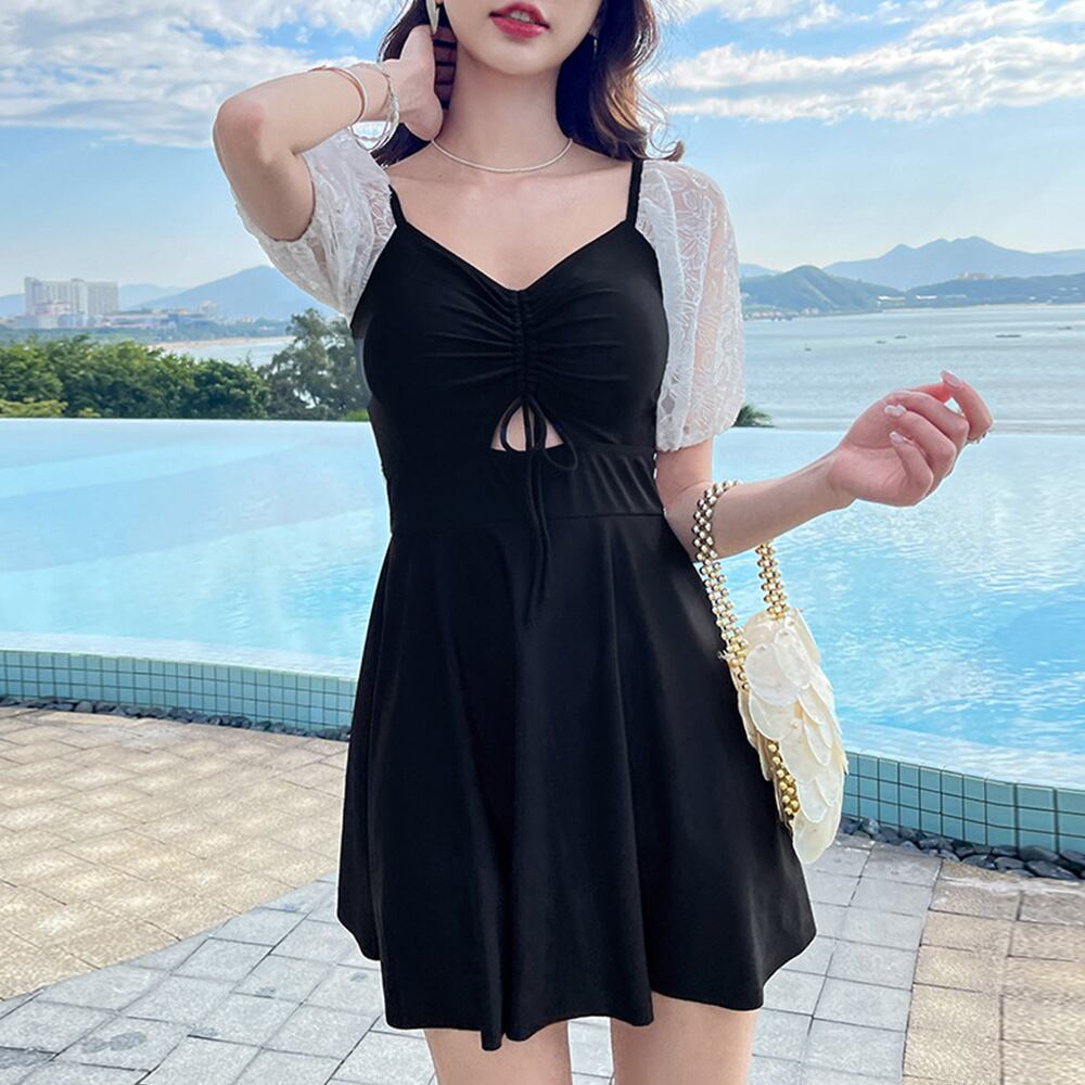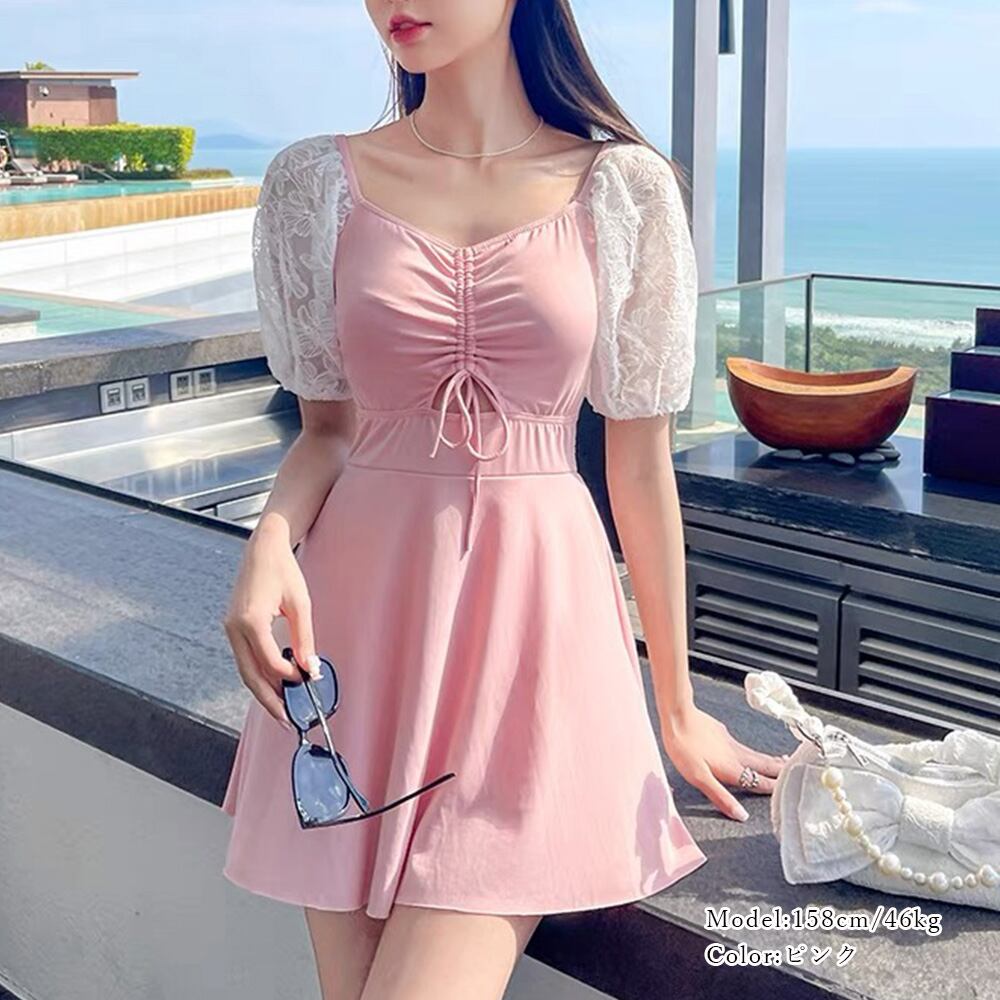 胸元のギャザーはドローストリングスなので、リボンの位置と丈感を自分で調整できるワンピース水着