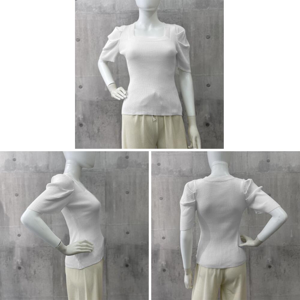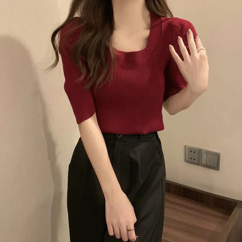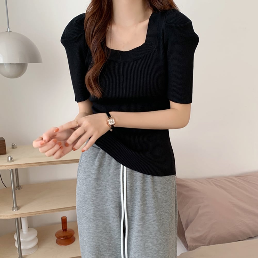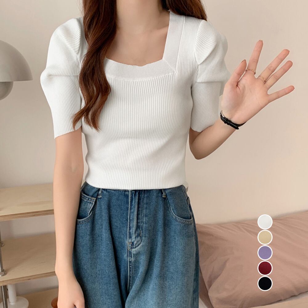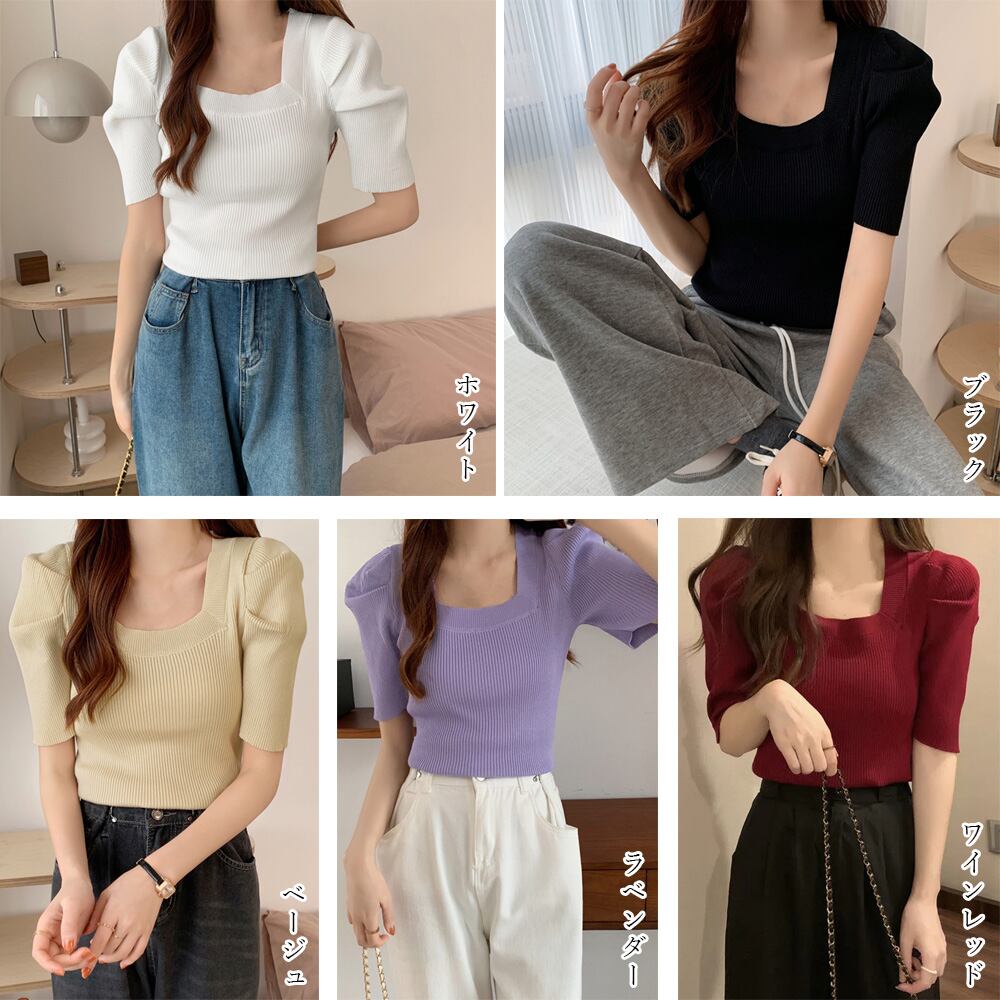 ちらりデコルテ見せのスクエアネックが女性らしさを際立たせるレディライクなカジュアルデザインのリブニットトップス