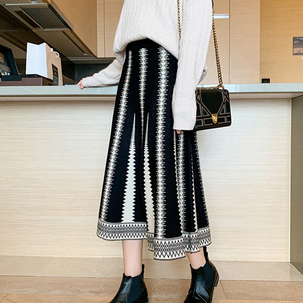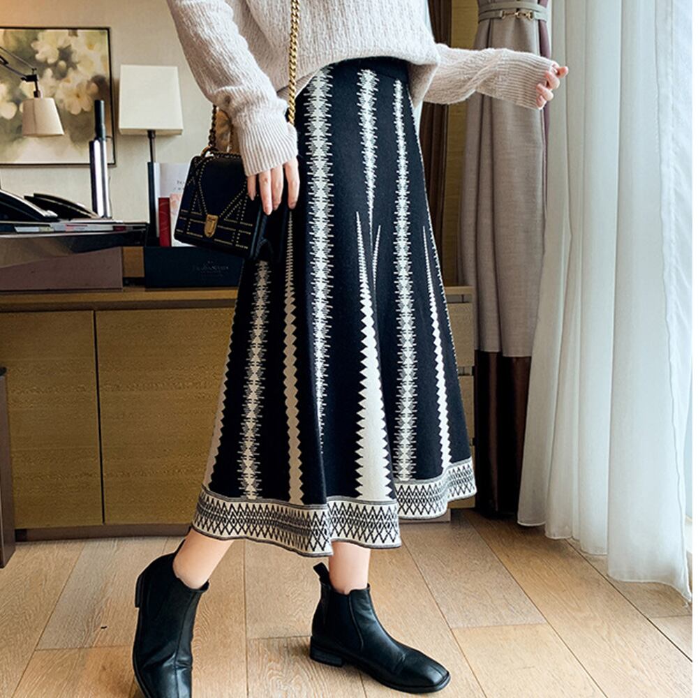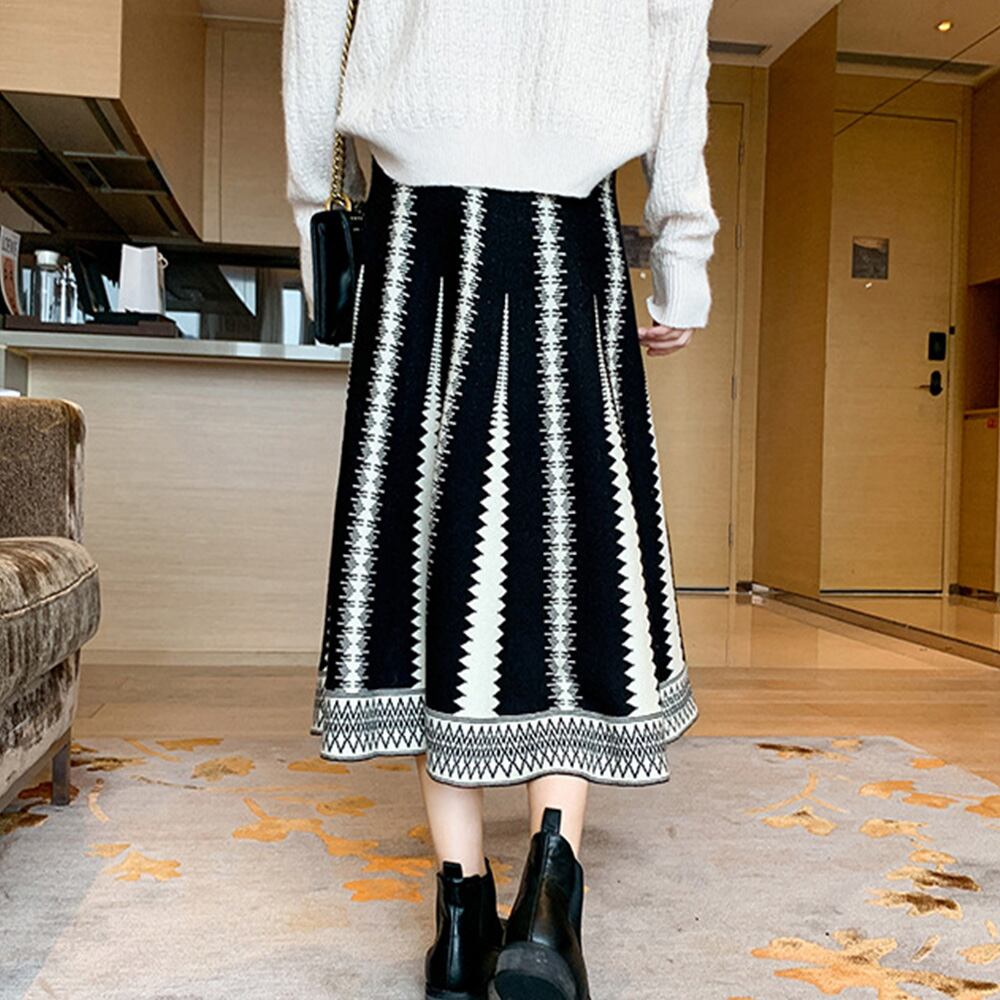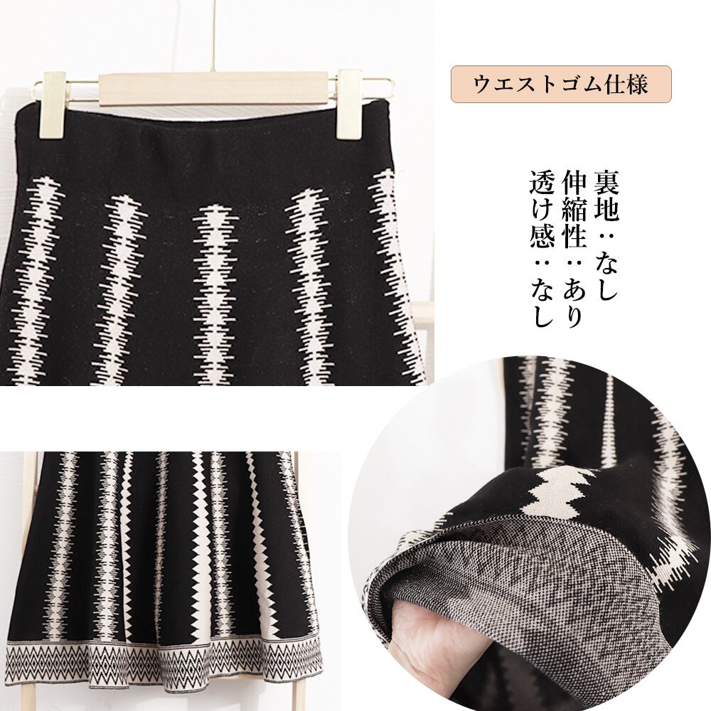 レトロで大人っぽい雰囲気を演出する幾何学柄ニットフレアスカートです
