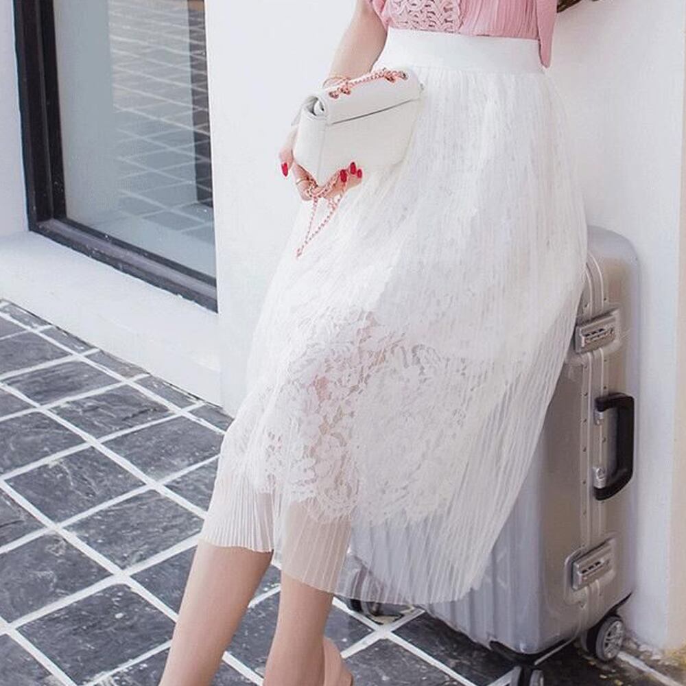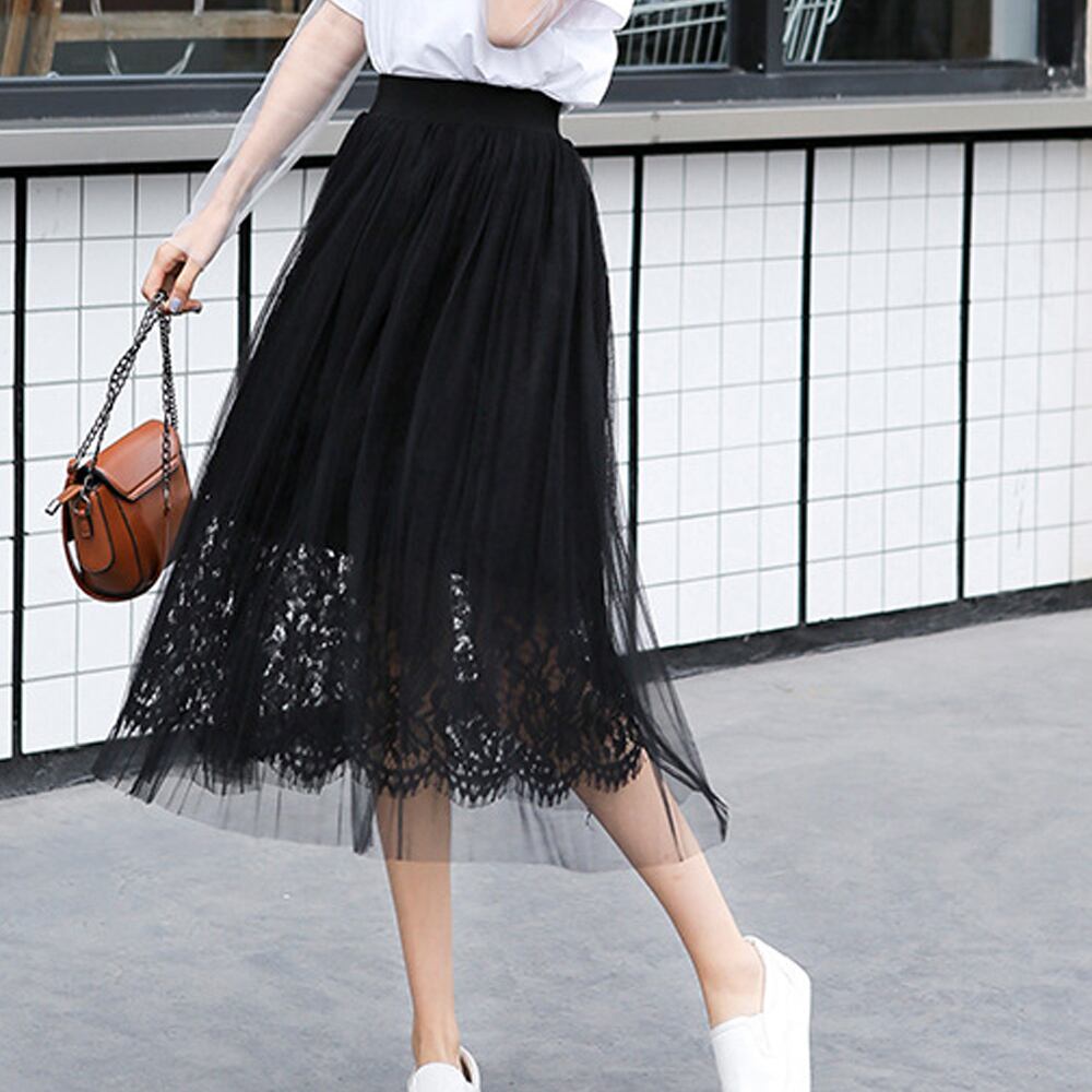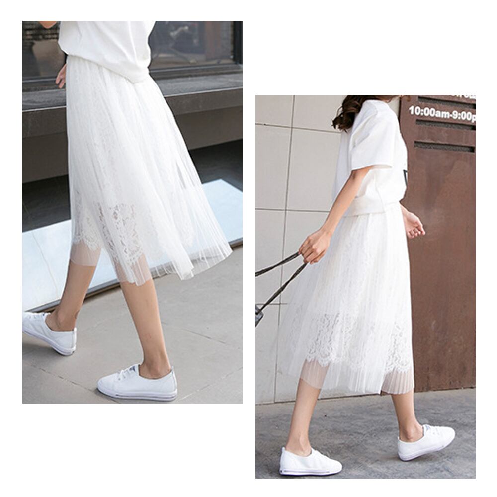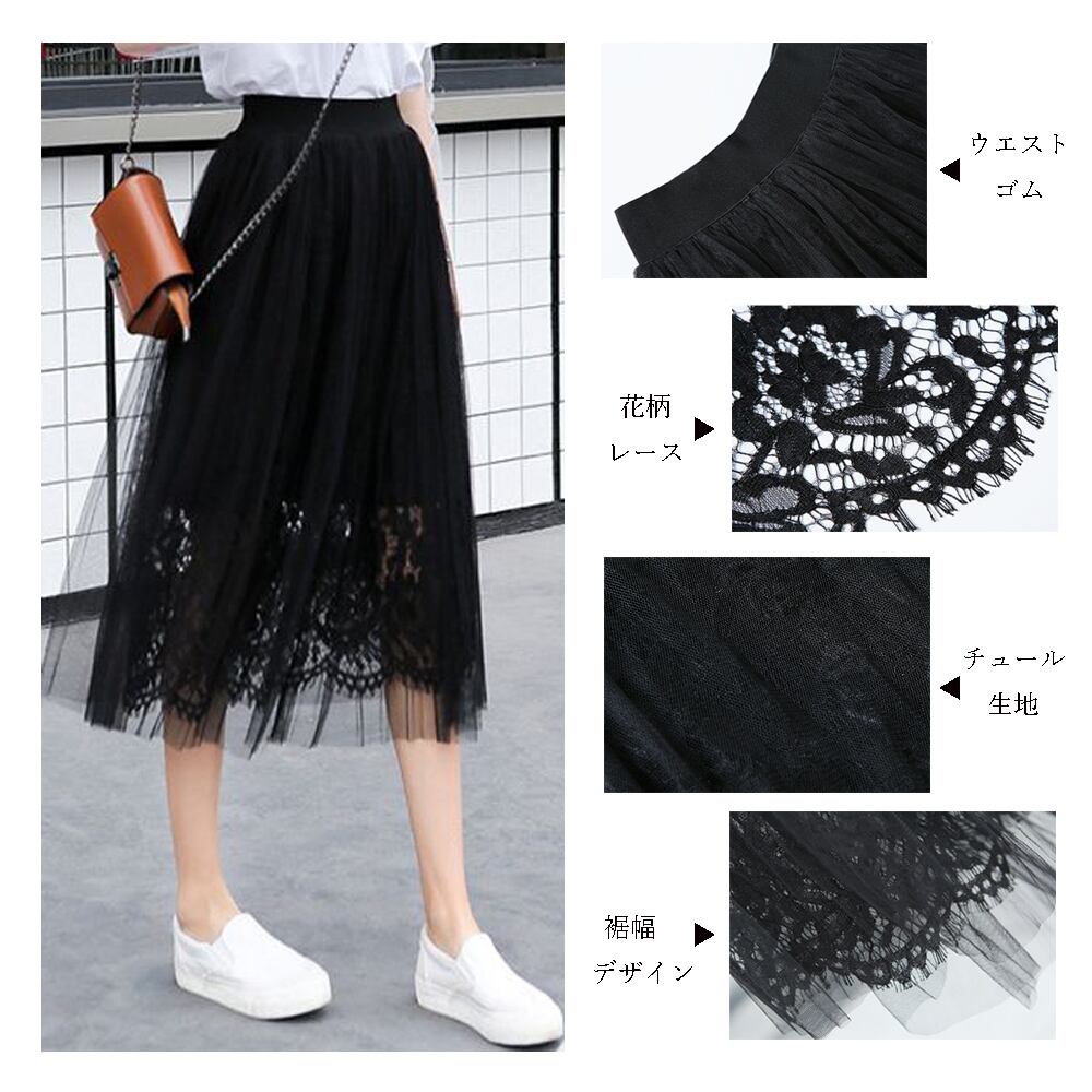 チュールと花柄レース2枚重なるフレアスカート