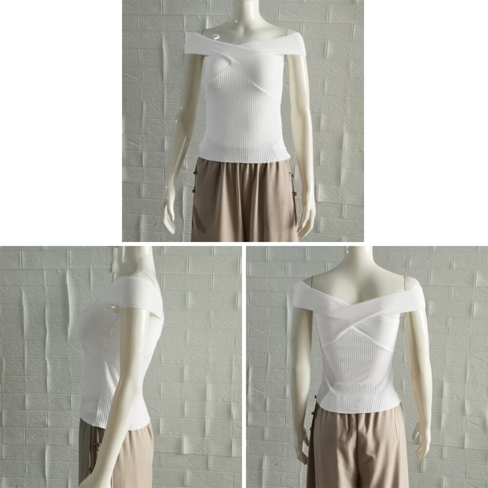 女性らしさのある、オフショルダーのサマーニット