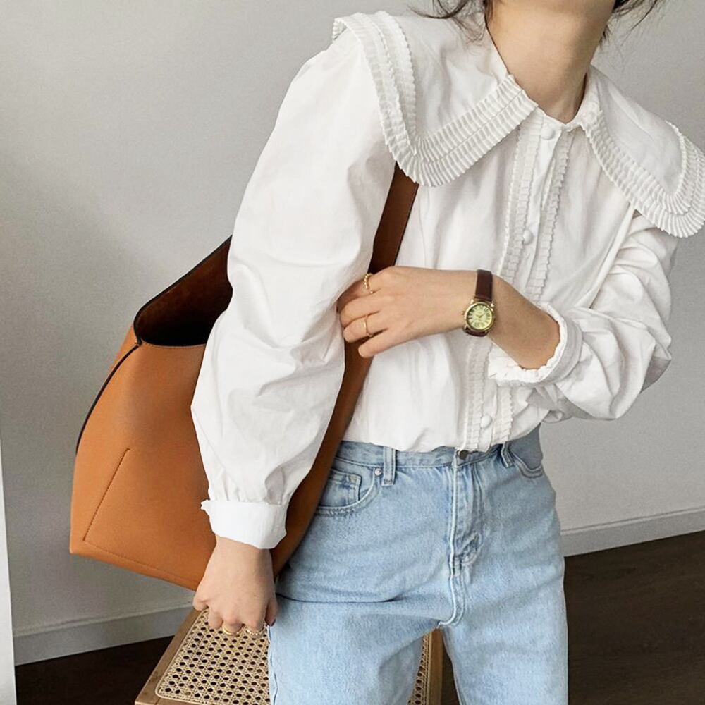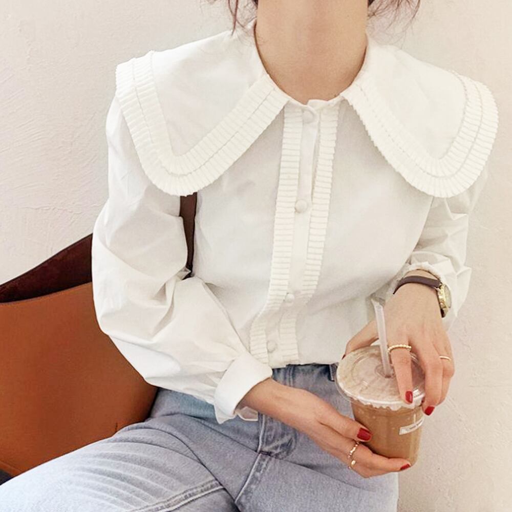 フリルで縁取られた大きめの襟は存在感抜群の長袖シャツブラウス