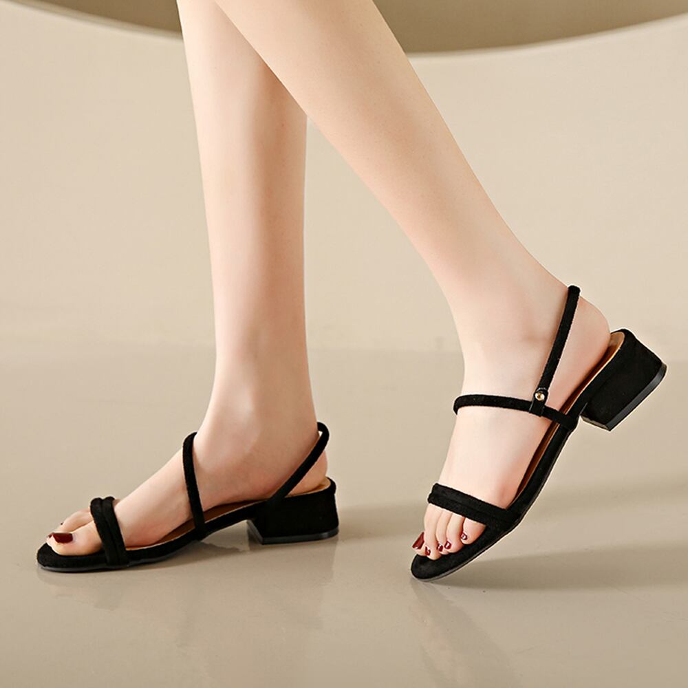 太ヒールとローヒールのデザインで足をキレイに見せる
