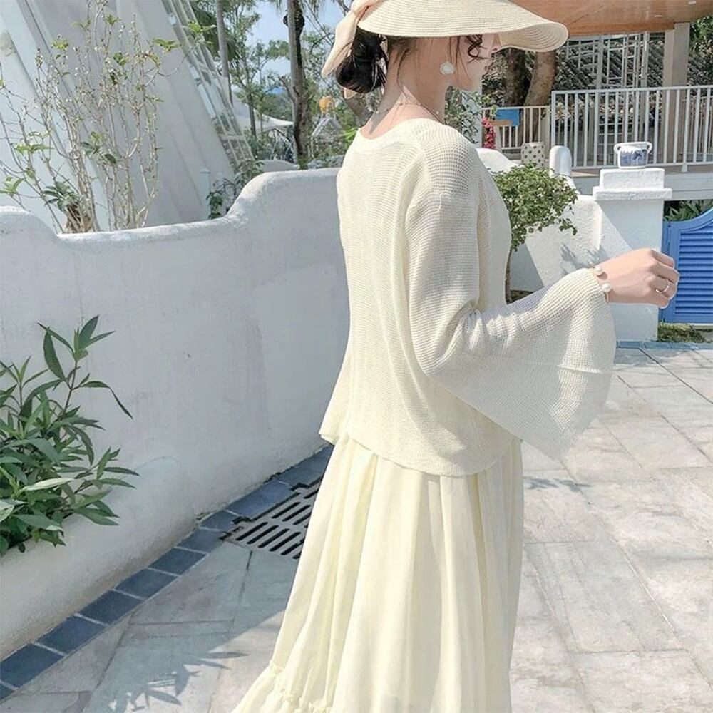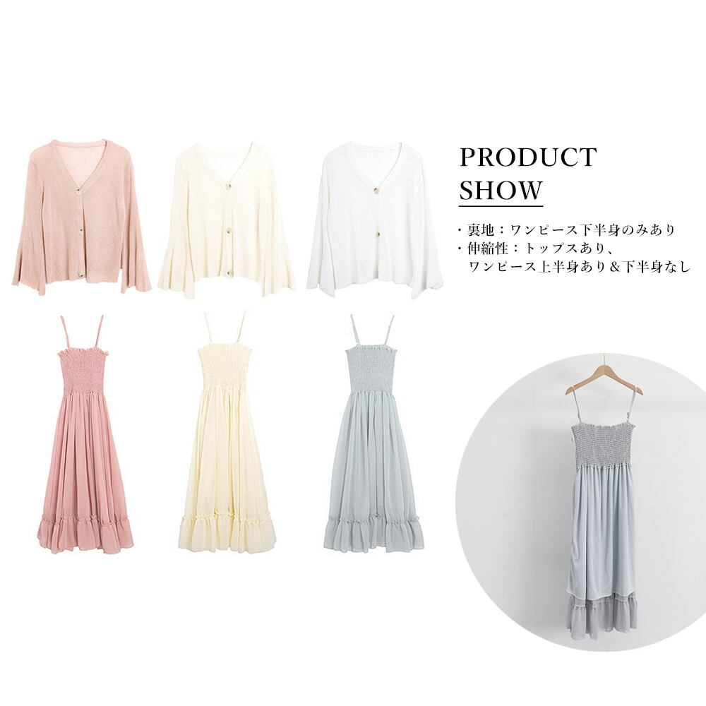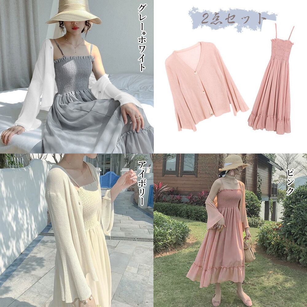 おしゃれで女性らしく優しい印象を与えるキャミワンピースとニットカーディガンのセットアップです