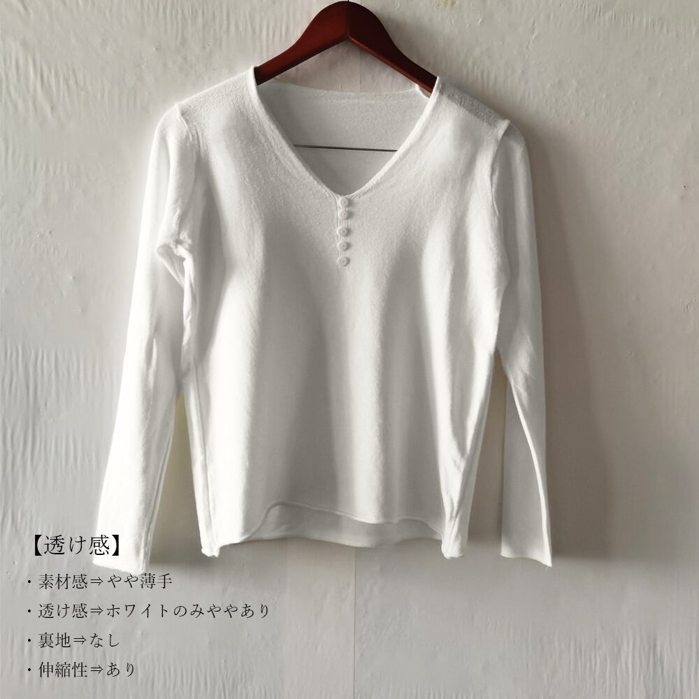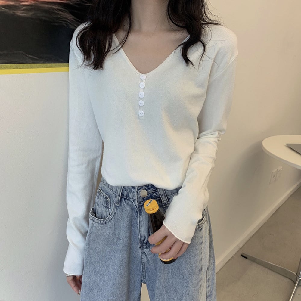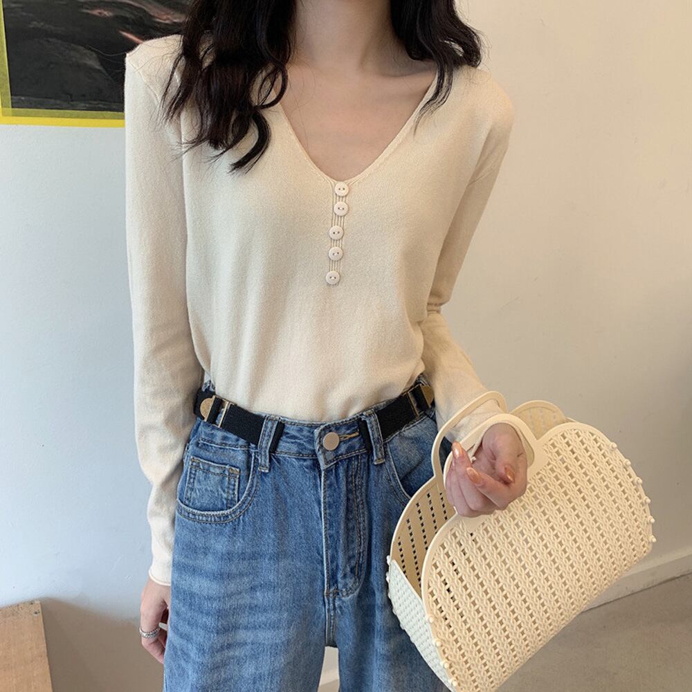 フロントにボタンをあしらった、大人カジュアルなVネックニットトップス