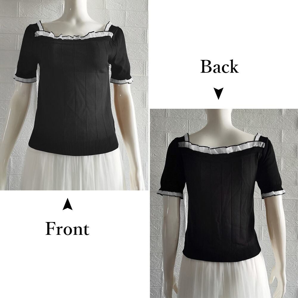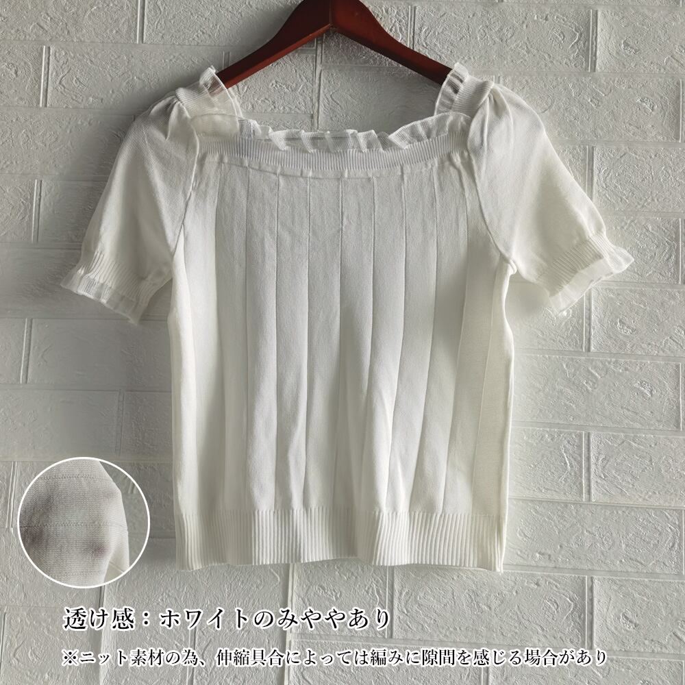 ネックラインと袖口にレース加工がとても女性らしい太めリブのサマーニット