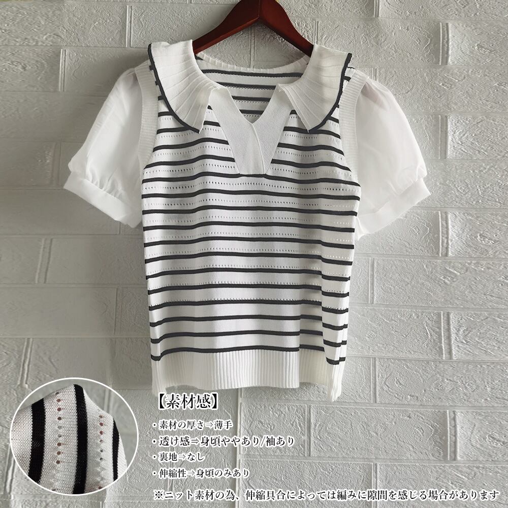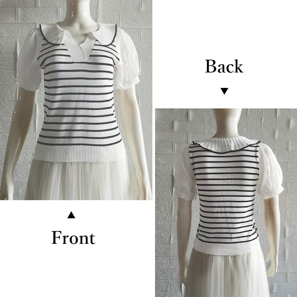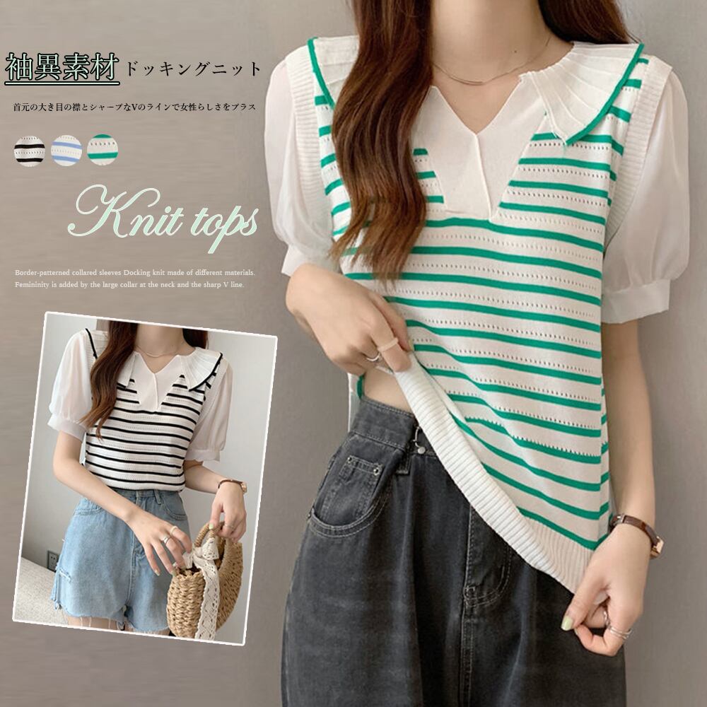 袖部分に異素材を重ねてエレガントに仕上げた襟付きのドッキングニット