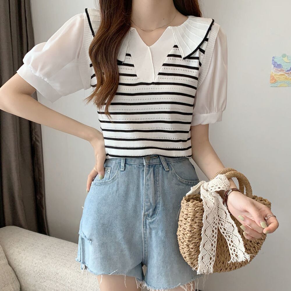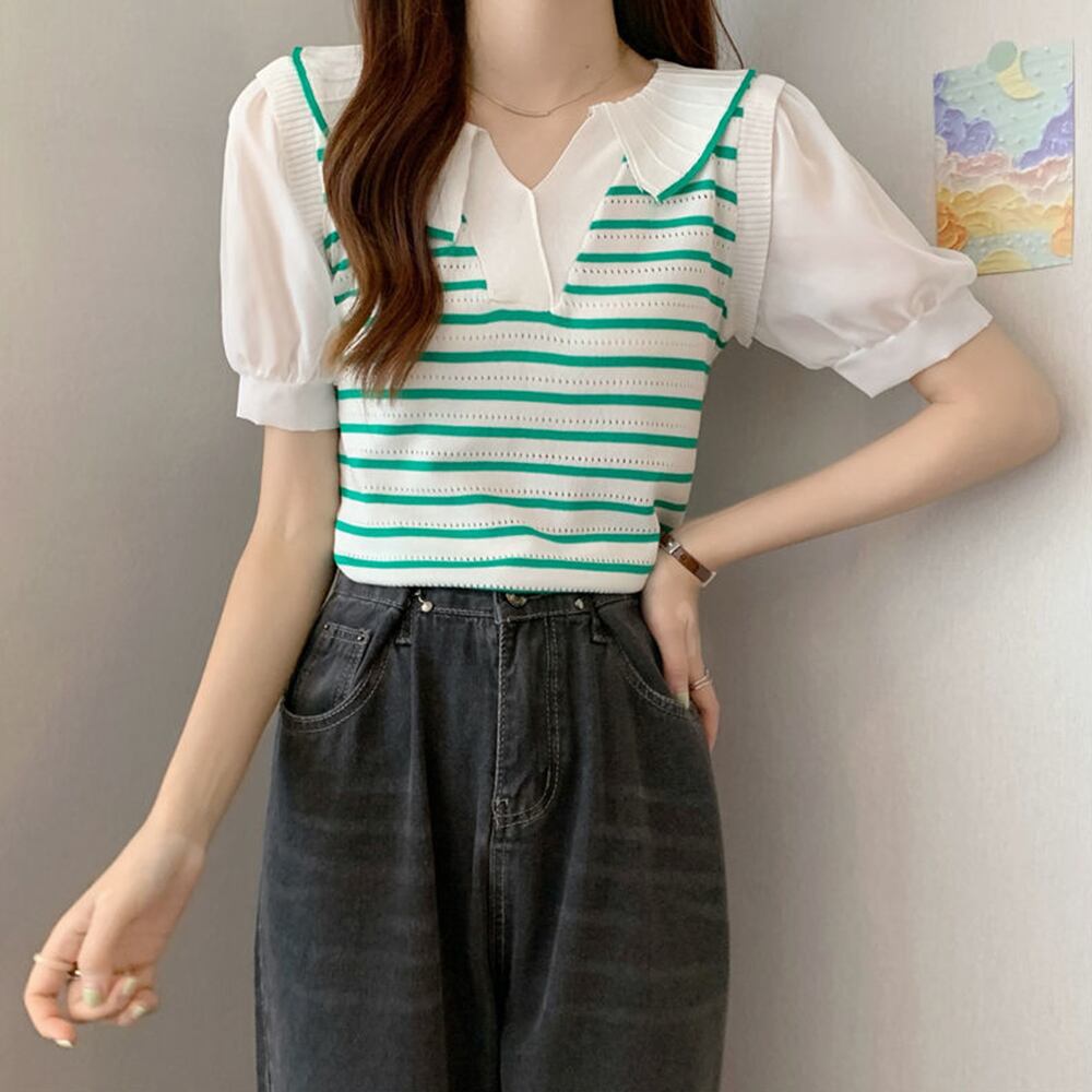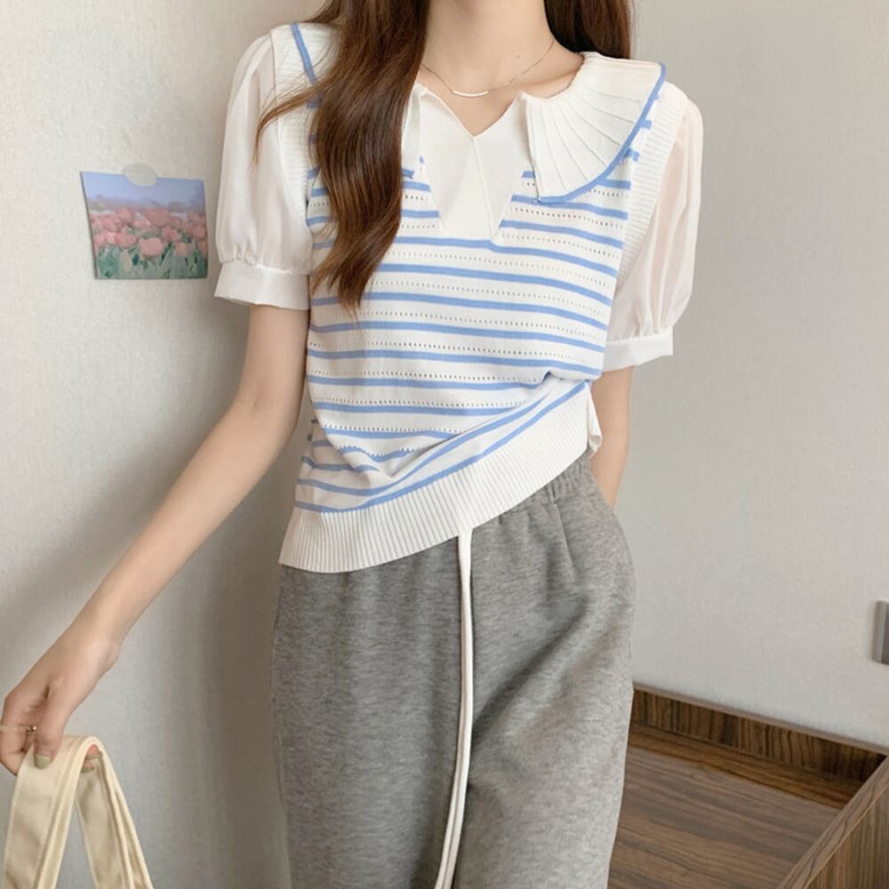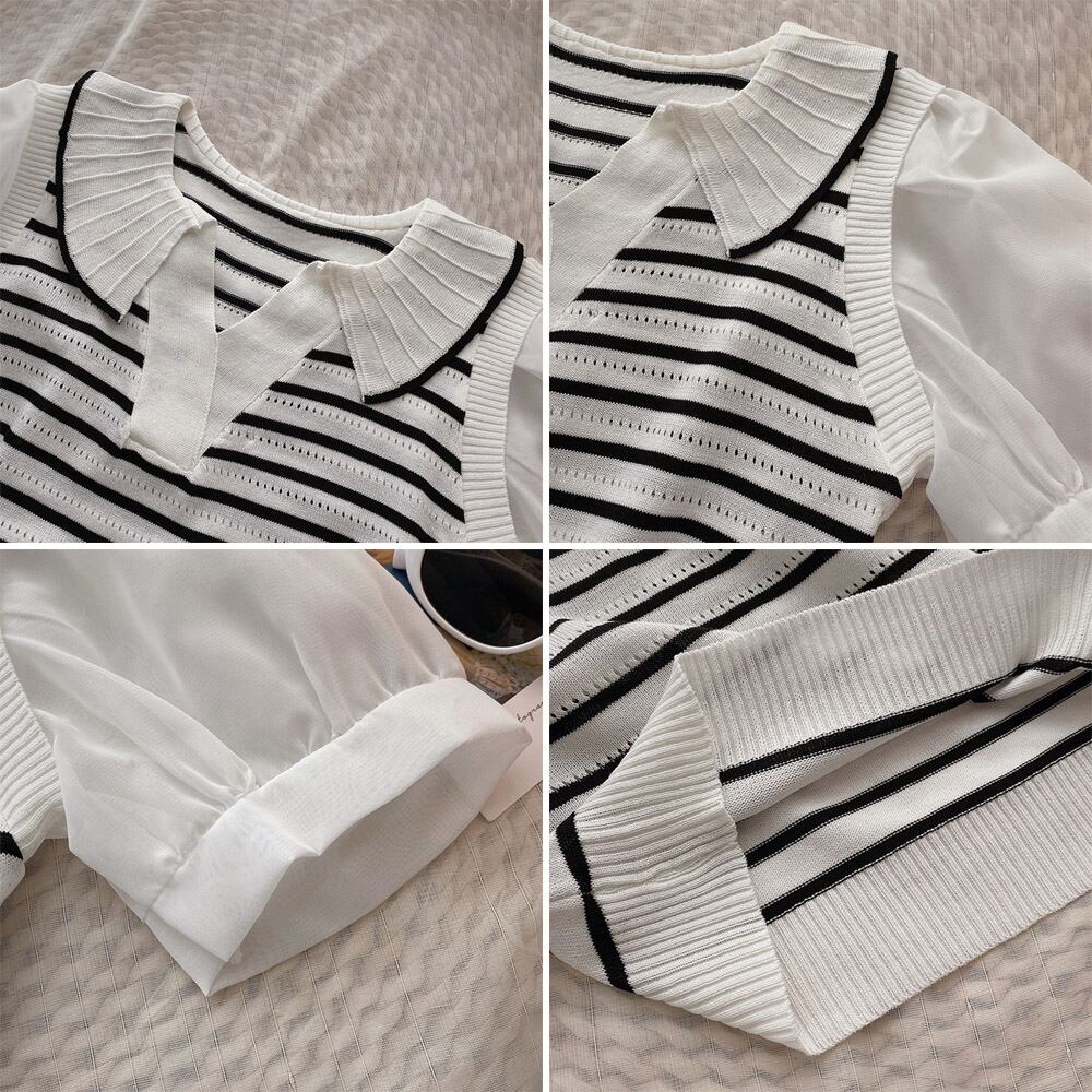 袖部分に異素材を重ねてエレガントに仕上げた襟付きのドッキングニット