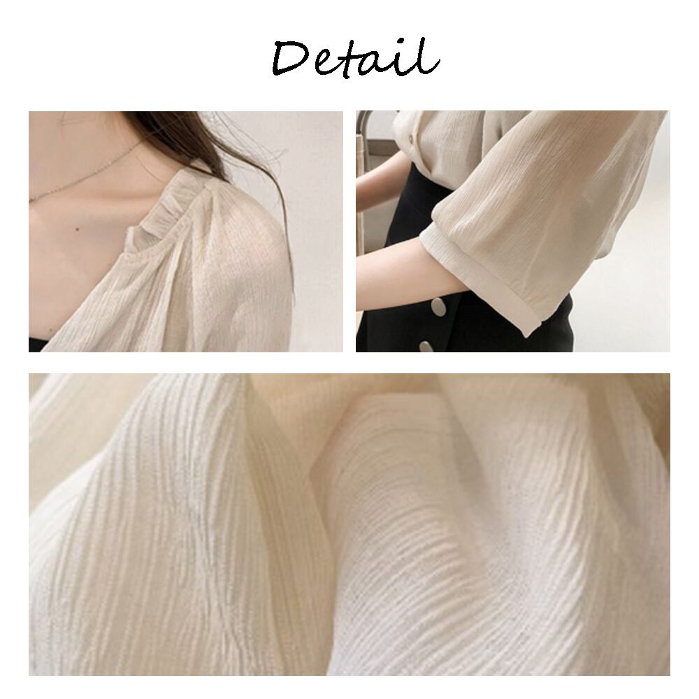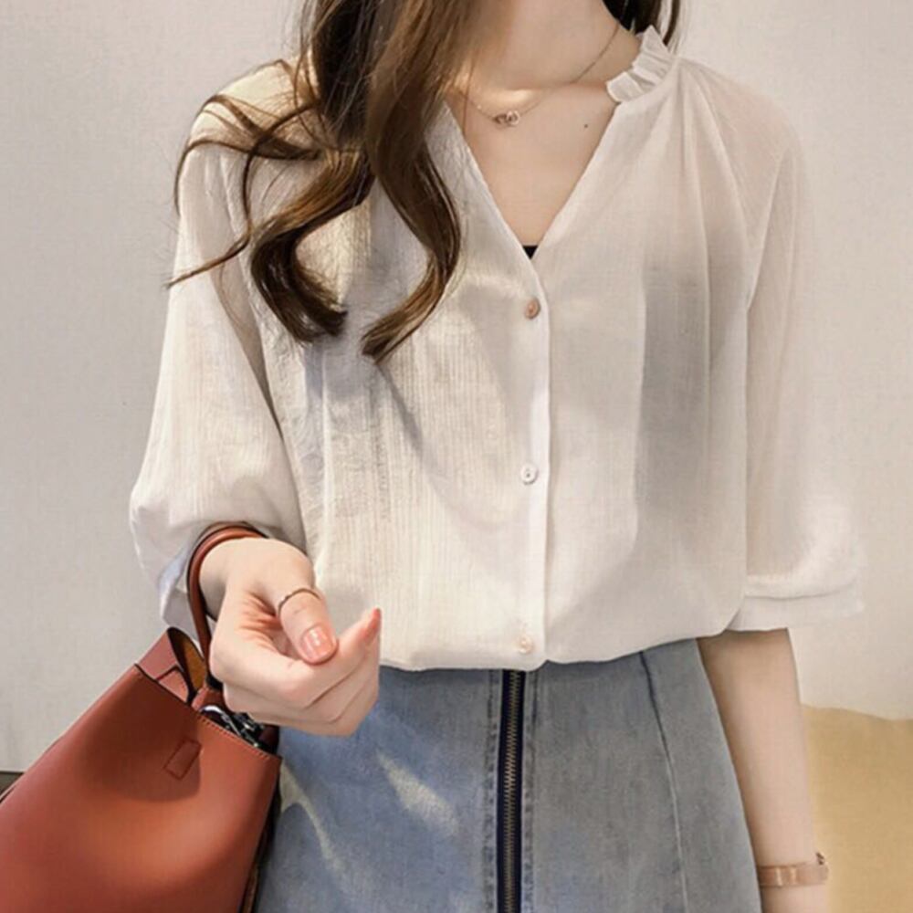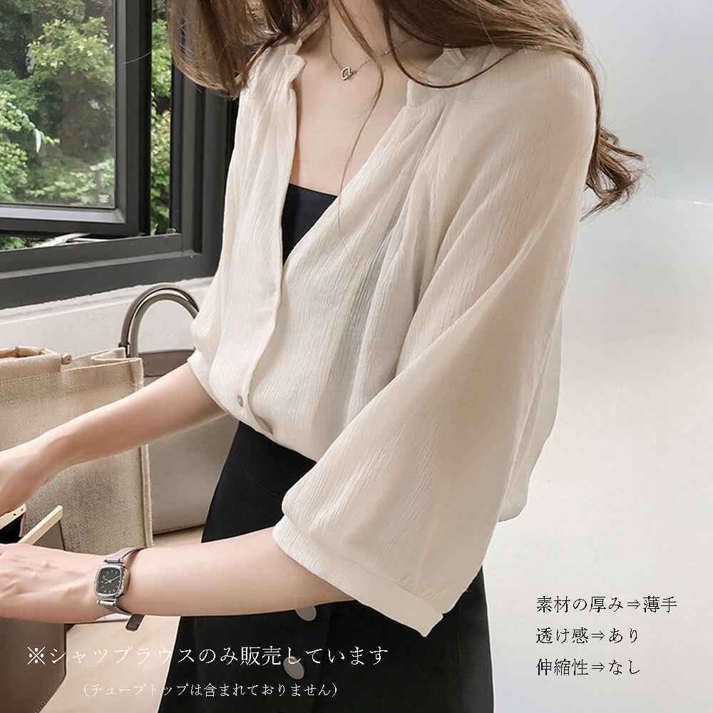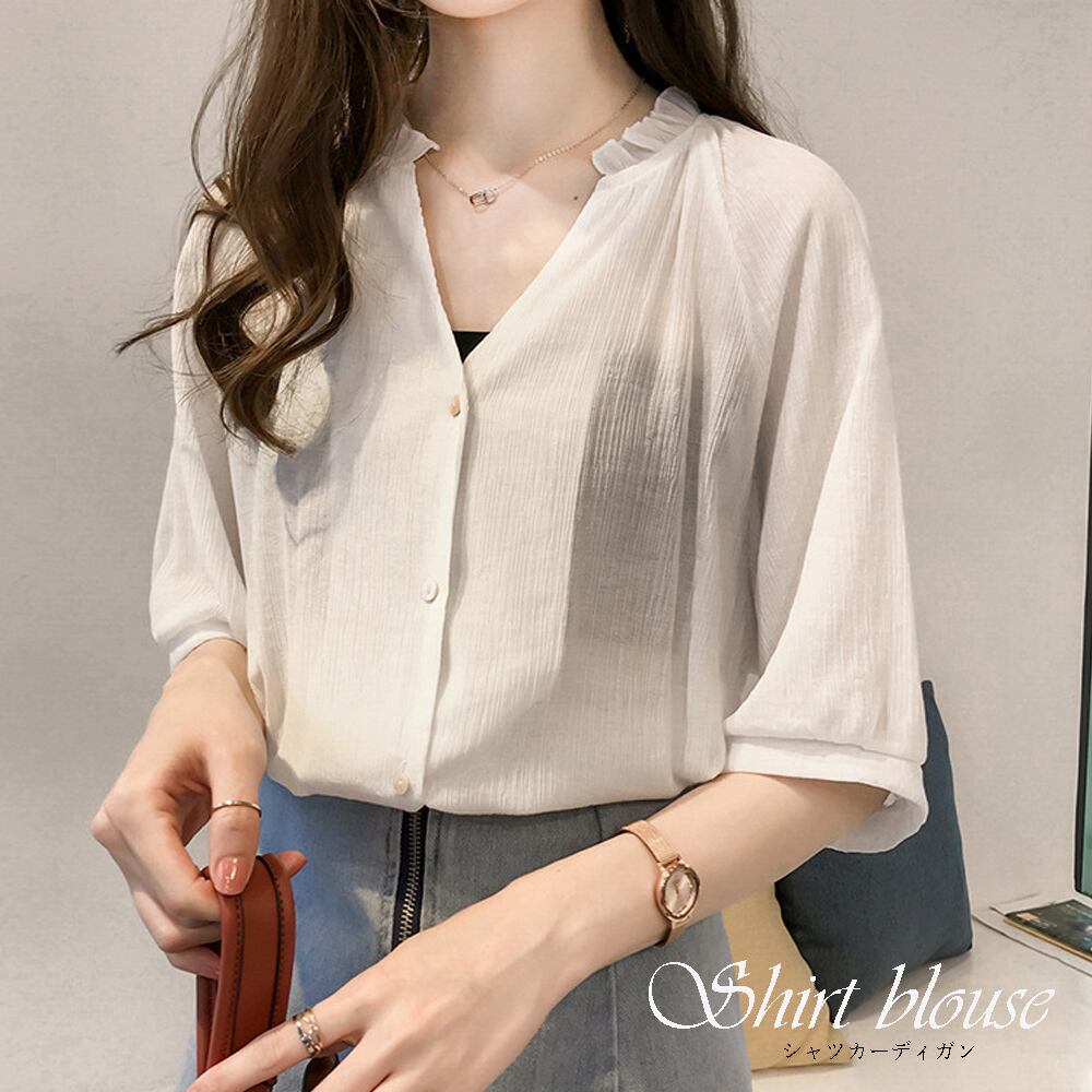 すっきりとしたVネックで、抜け感のあるシルエットを演出してくれるブラウス