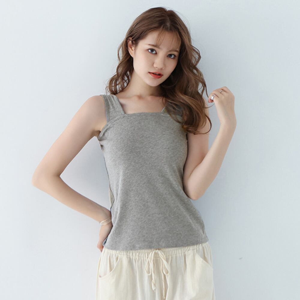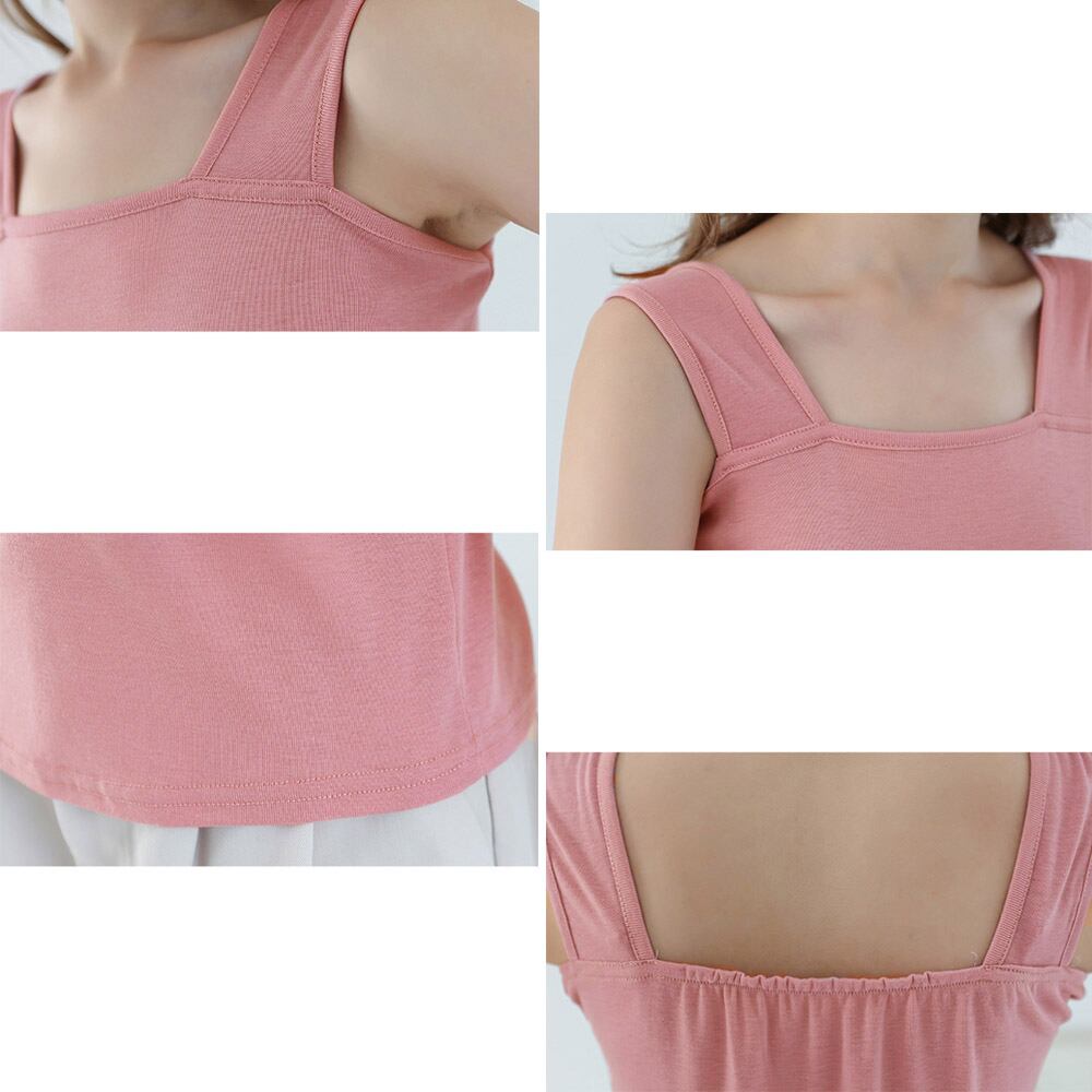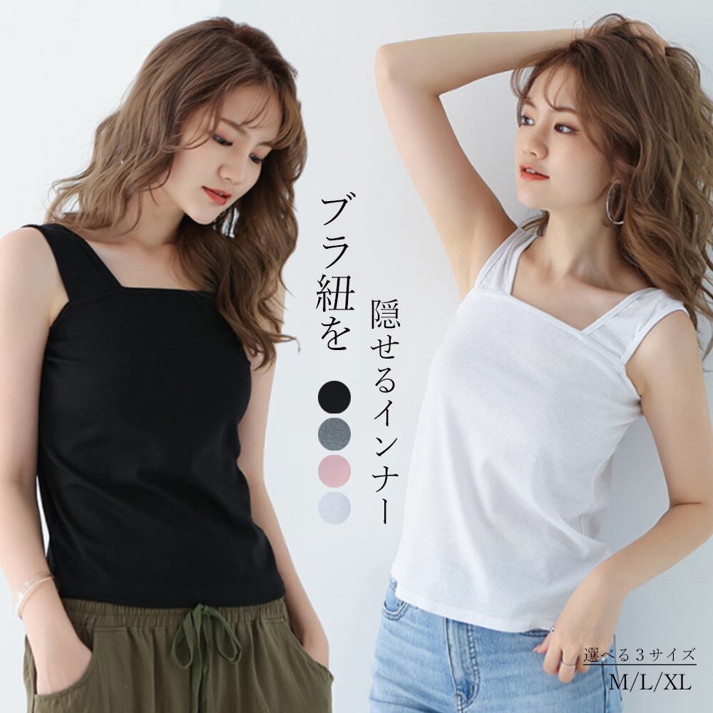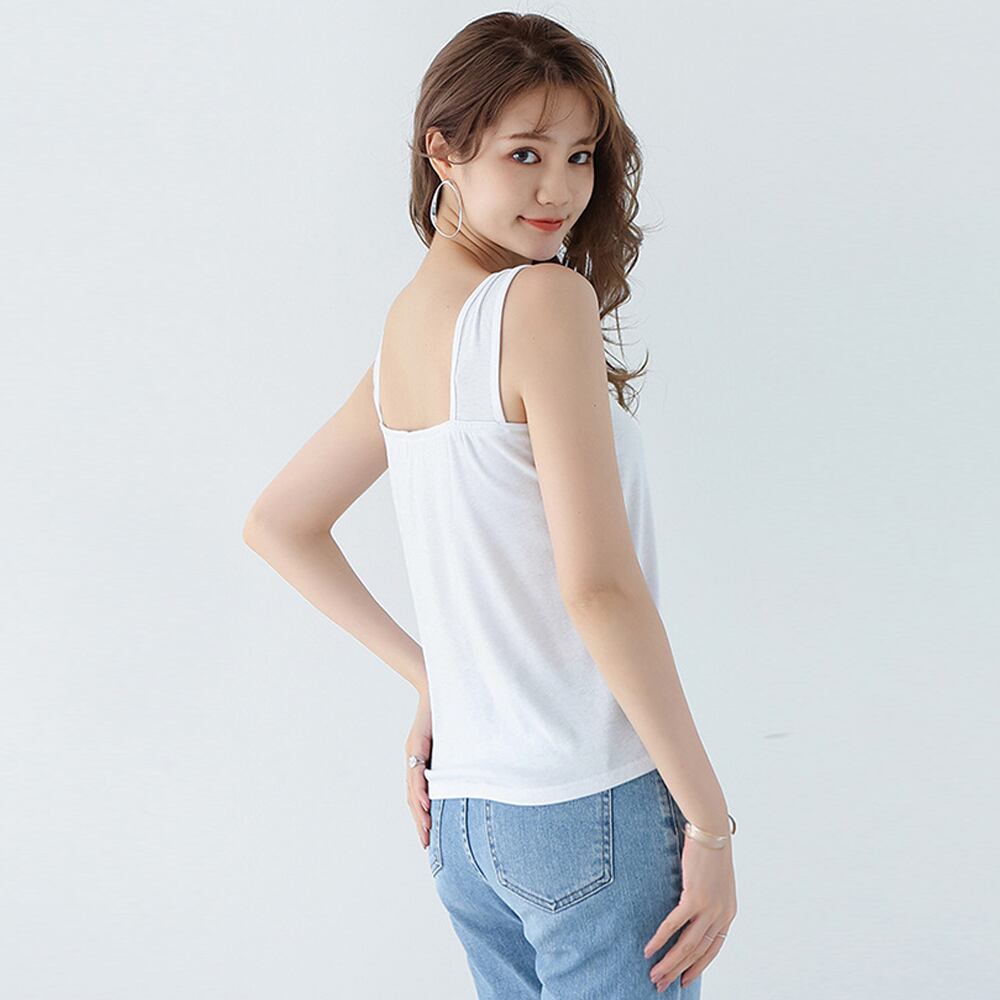 レーストップスやシアーシャツでも、太めの肩ひもでブラ紐を隠して着られるタンクトップ