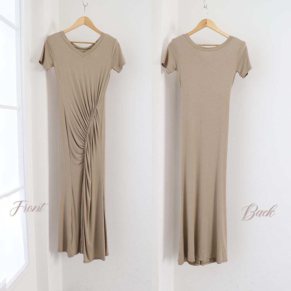 ボディラインをほど良くなぞるスッキリとしたシルエットに膝下丈で、きちんと見せできるのも嬉しいポイント