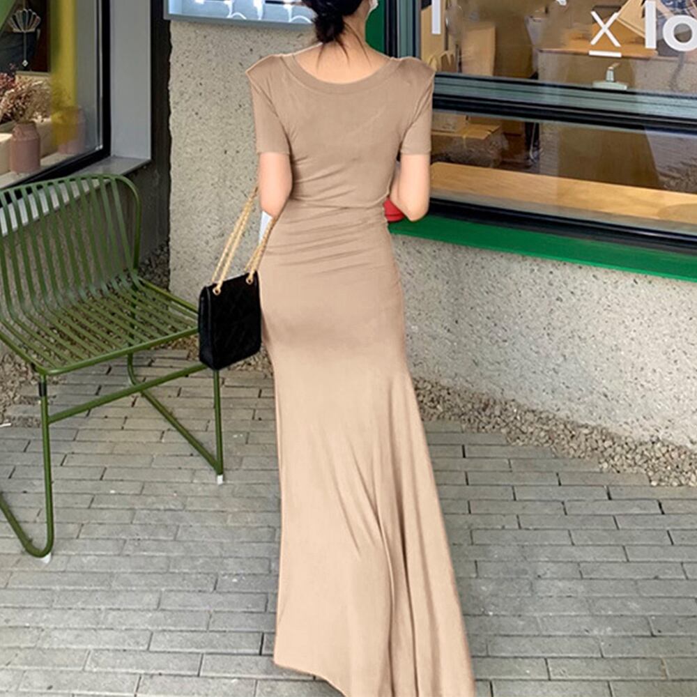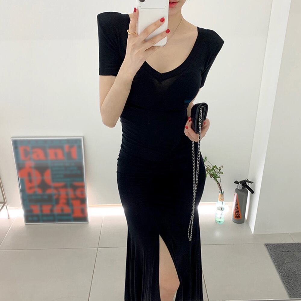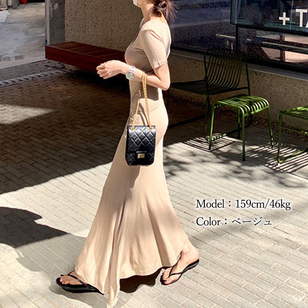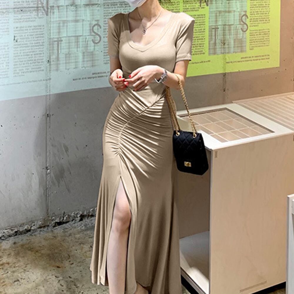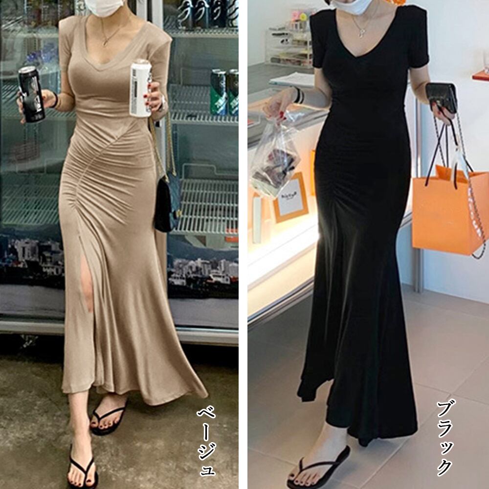 フロントに入ったディープスリットが今年らしいマーメイドタイトワンピース