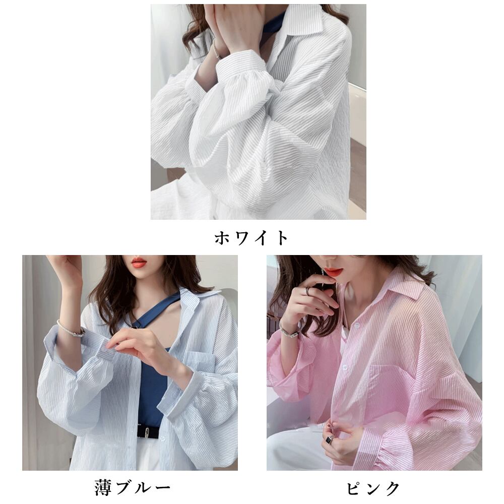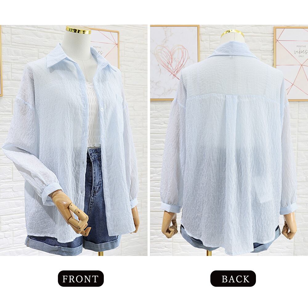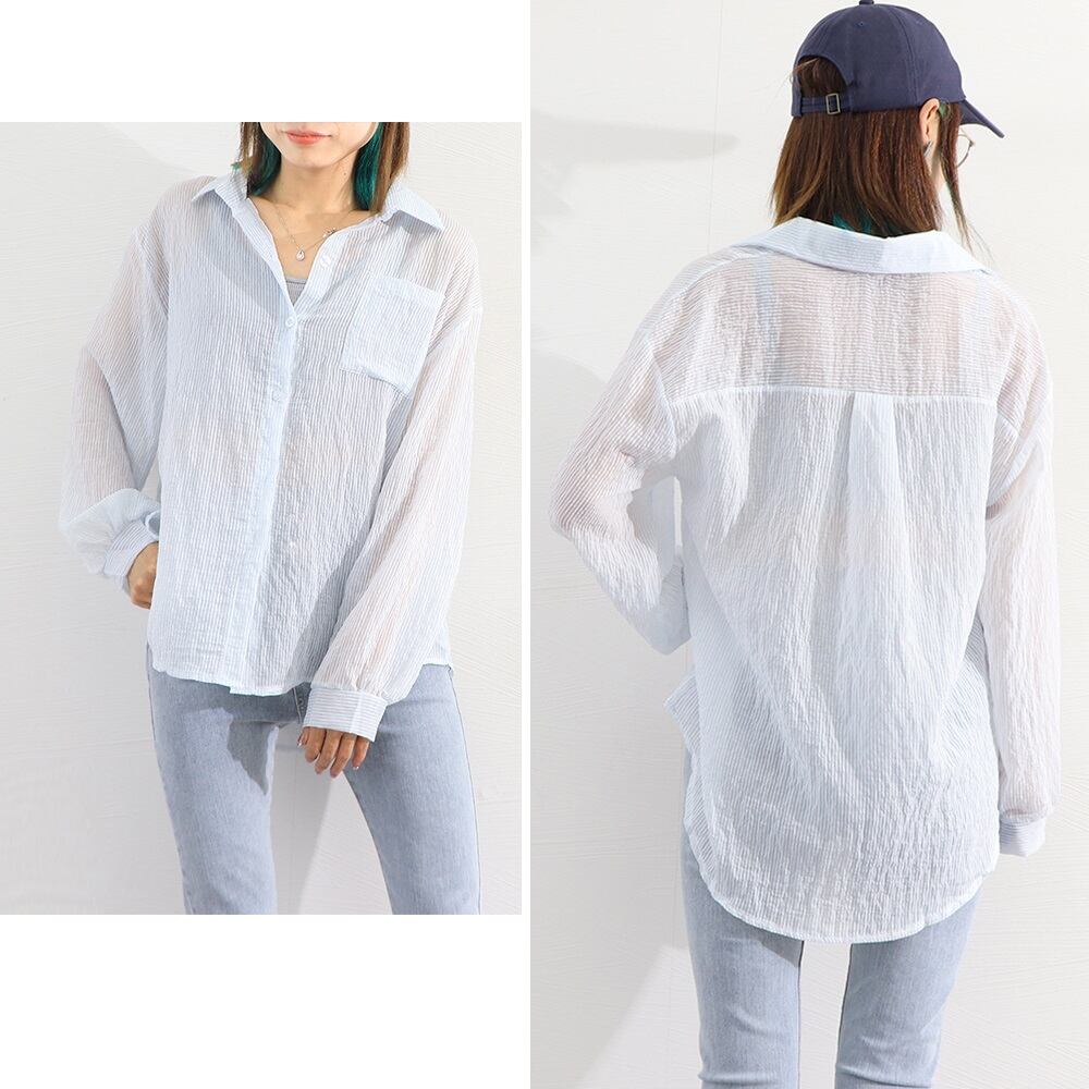 透け感が軽やかで涼しげ、前後アンバランスヘムが躍動感抜群の縦縞柄ブラウス