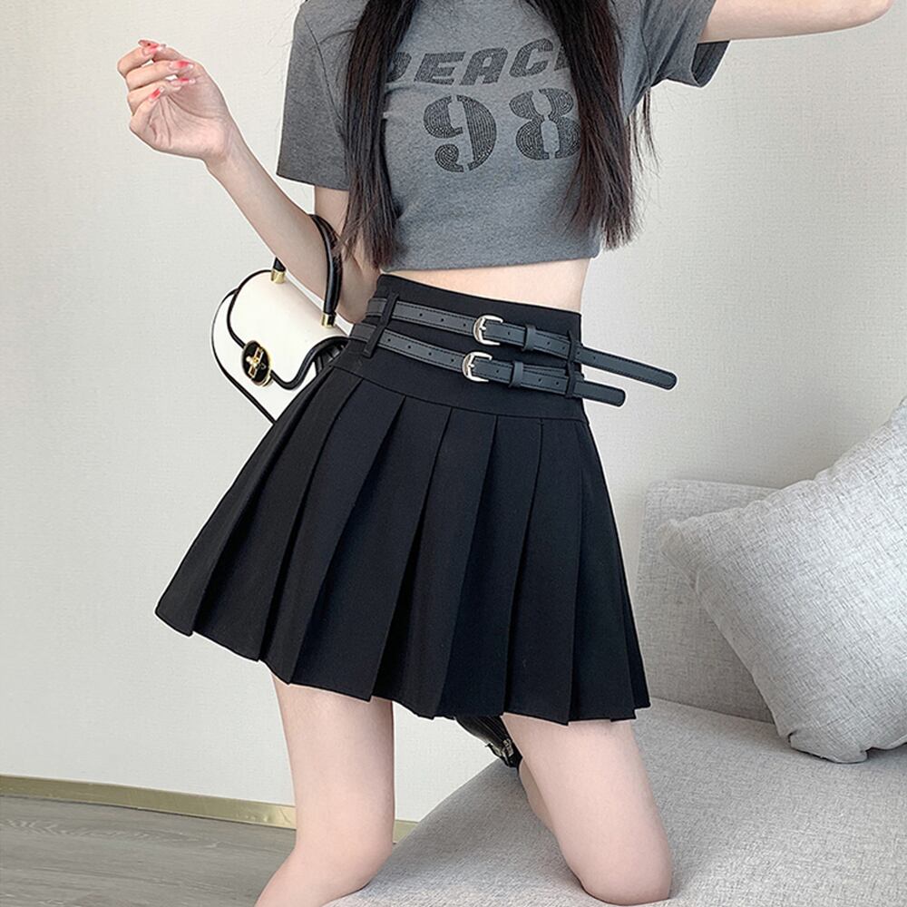 ウエストのベルトデザインが特徴のプリーツミニスカート
