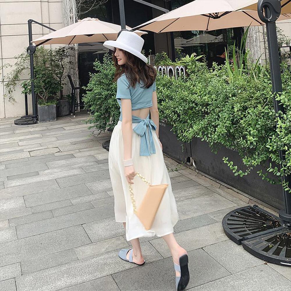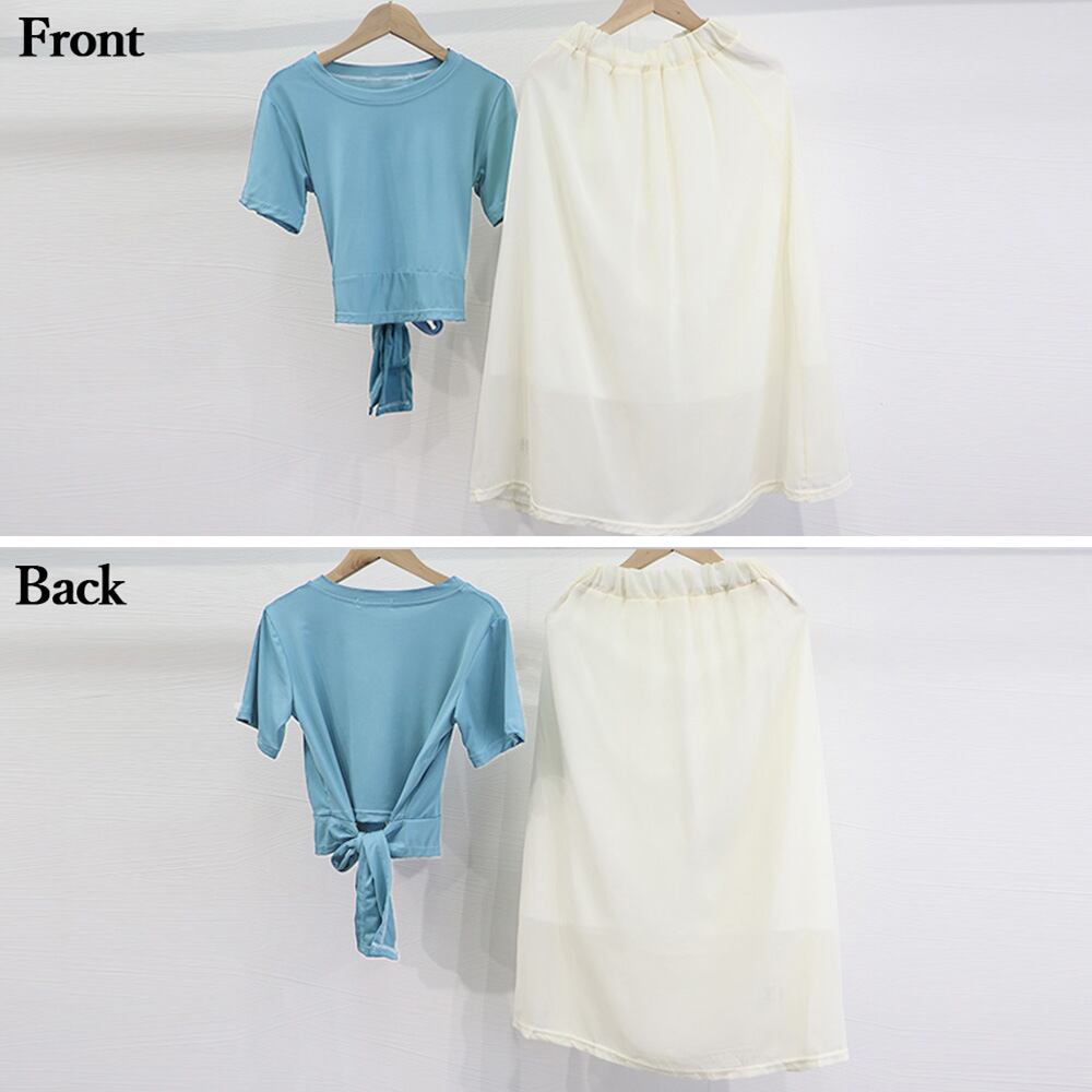 露出の高いウエストラインが特徴的なTシャツとスカートのセットです。