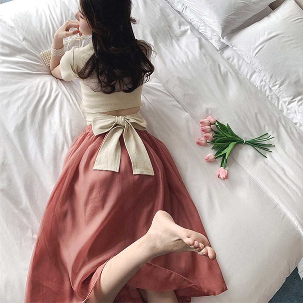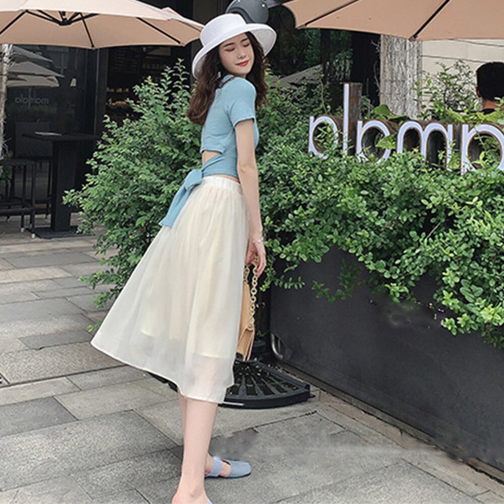 腰元のデザインがポイントのTシャツと、透け感のある優雅なスカートで、華やかなスタイルを演出します。