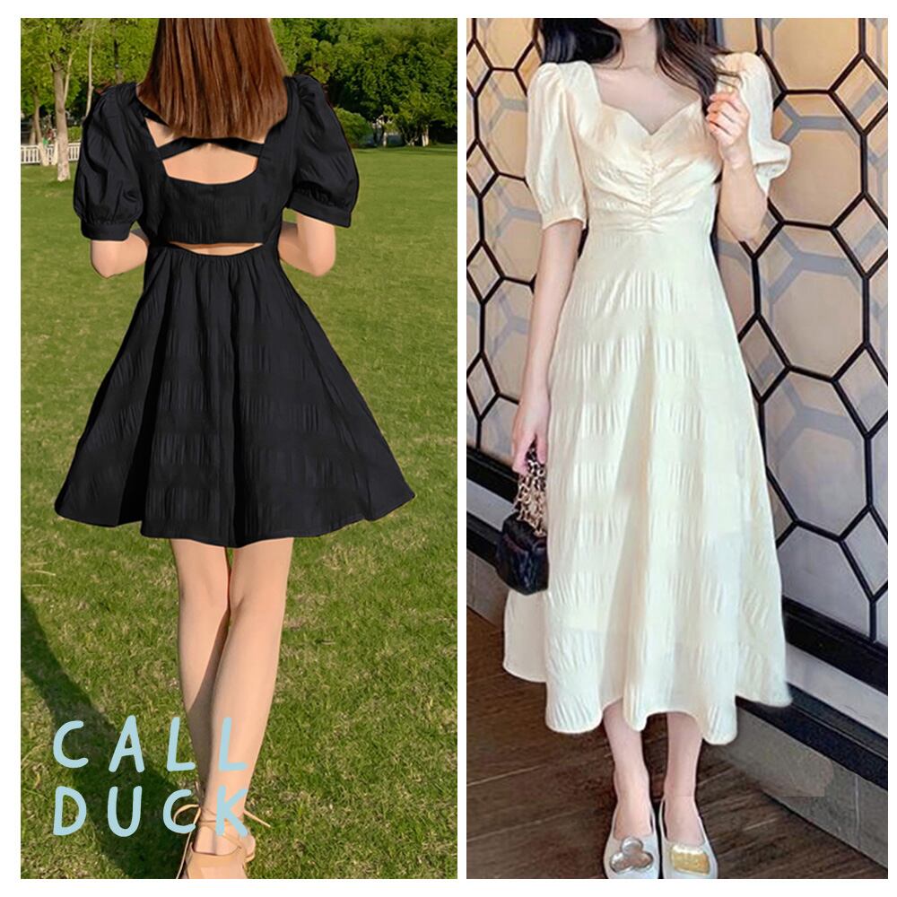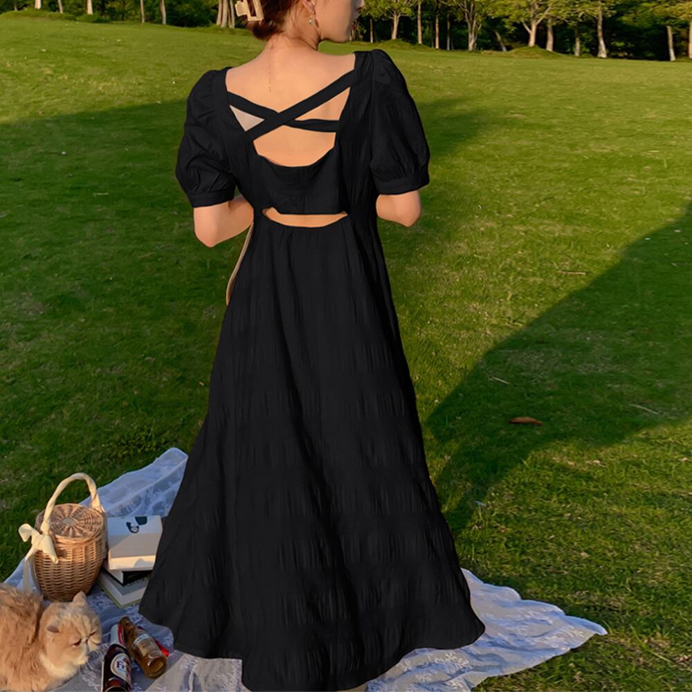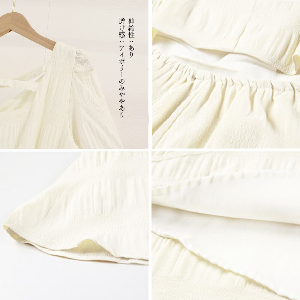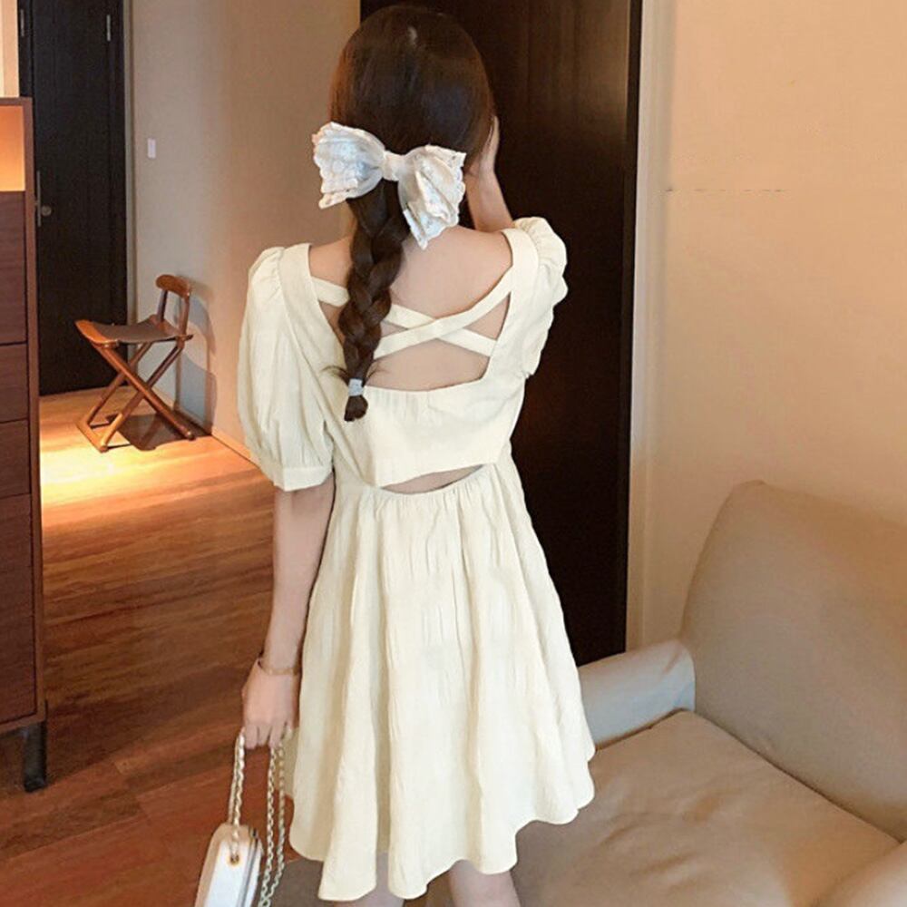 魅惑的なバックシャンと華やかなパフスリーブが印象的なワンピースです