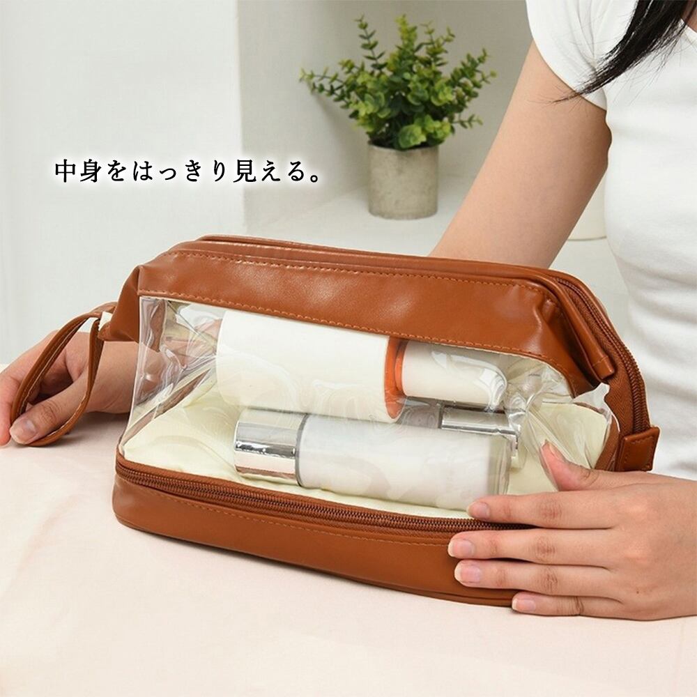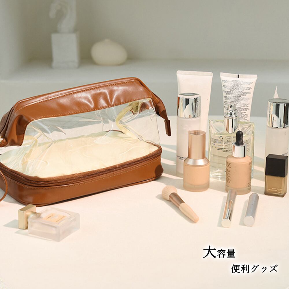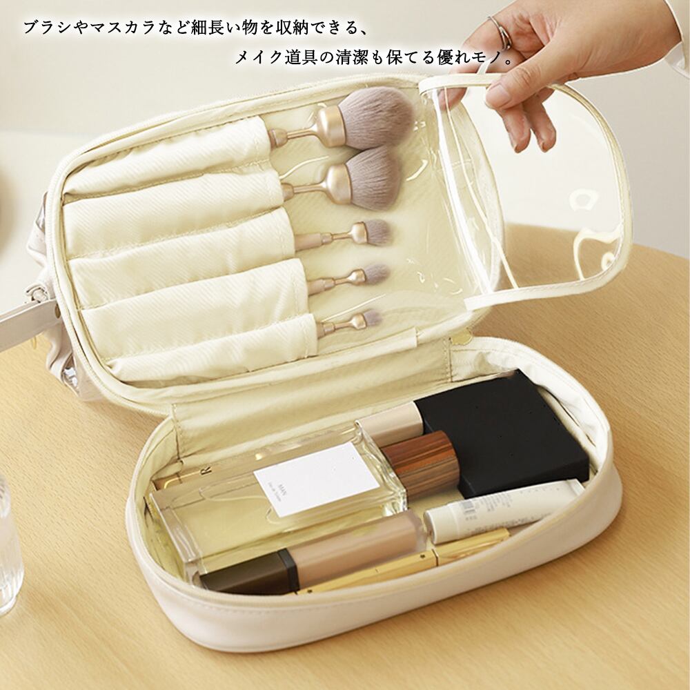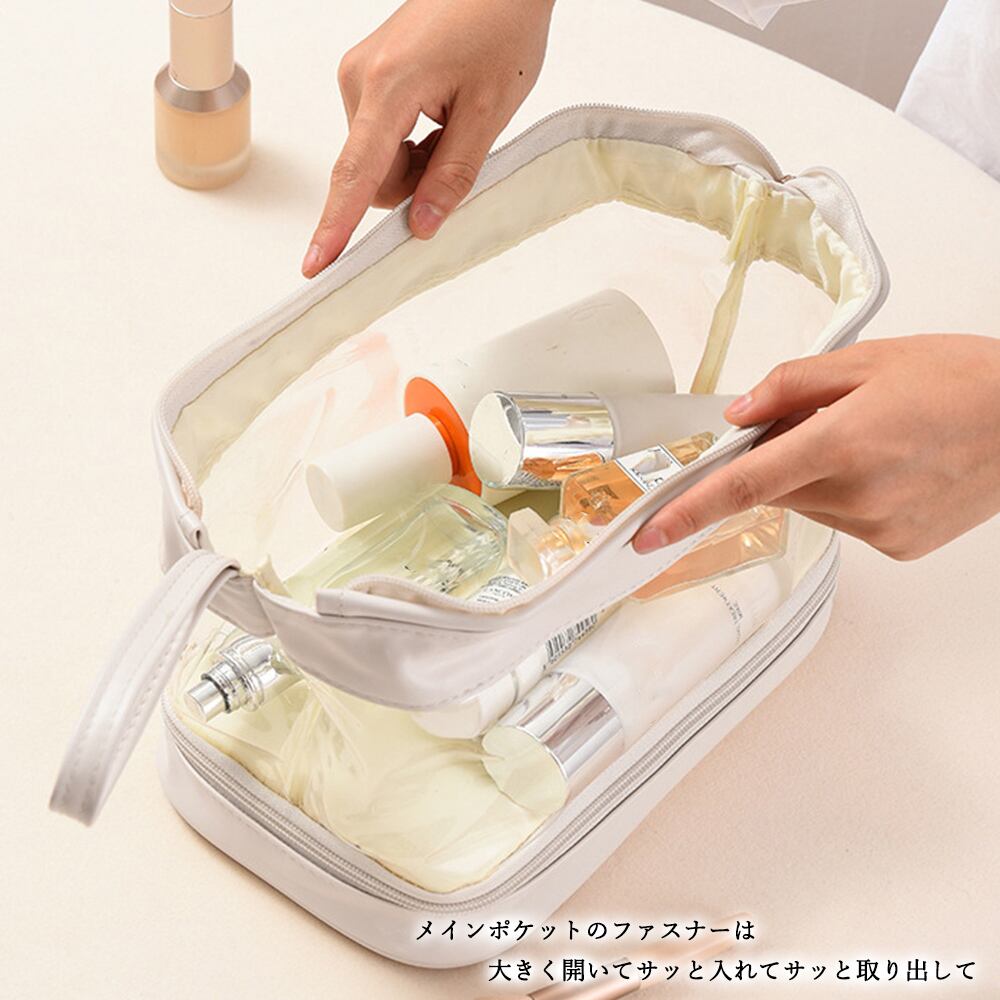上下二段に分かれ、化粧品と化粧道具を別々に収納できる便利な大容量コスメポーチ