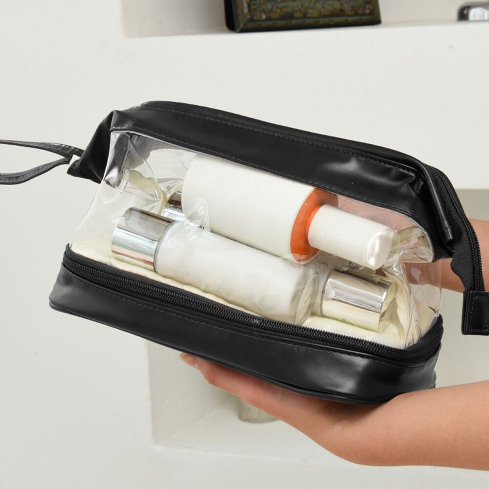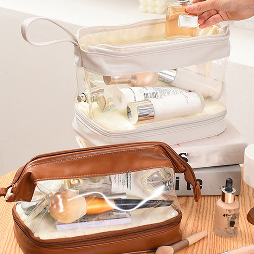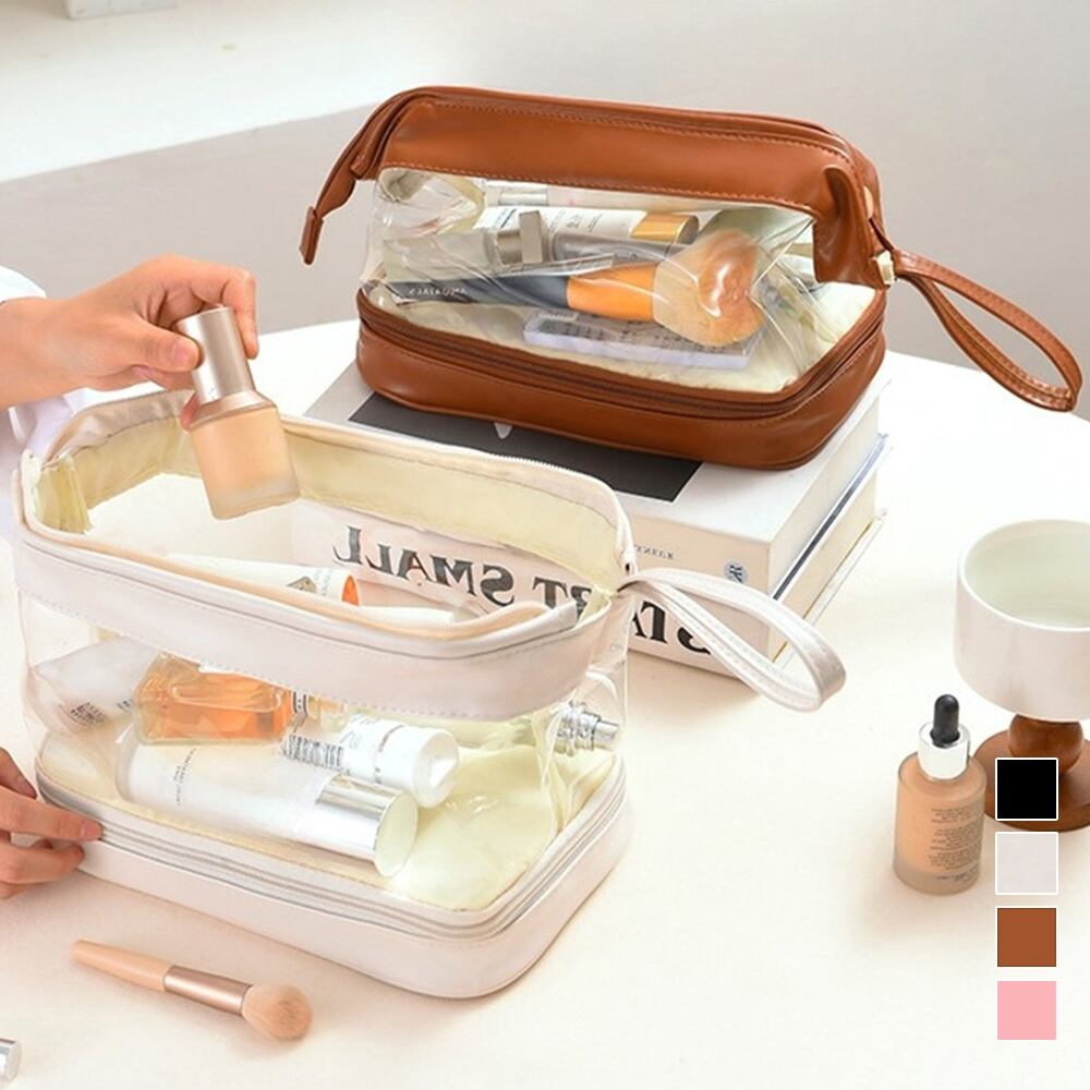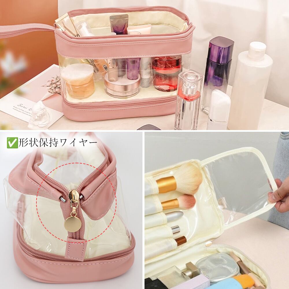 上下二段に分かれ、化粧品と化粧道具を別々に収納できる便利な大容量コスメポーチ