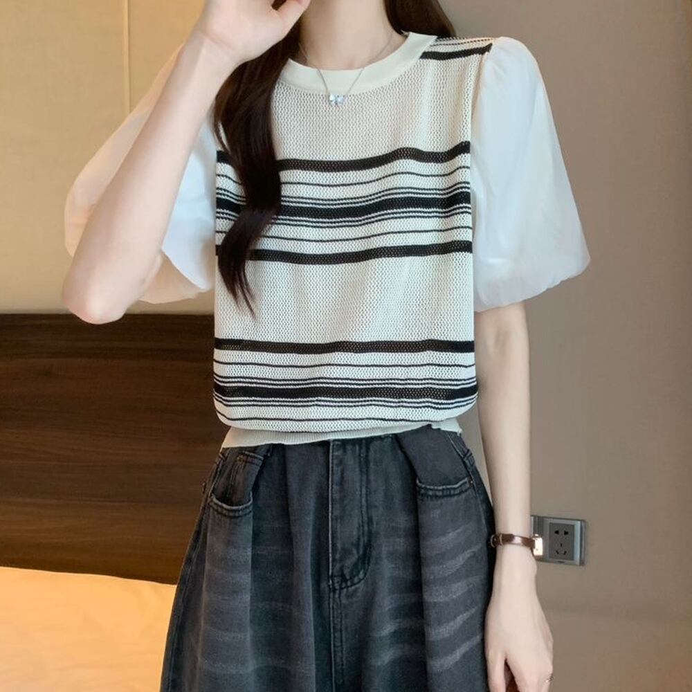 シフォンの立体的な袖が付いているので、ブラウスのような感覚で着られるきれい見えサマーニット
