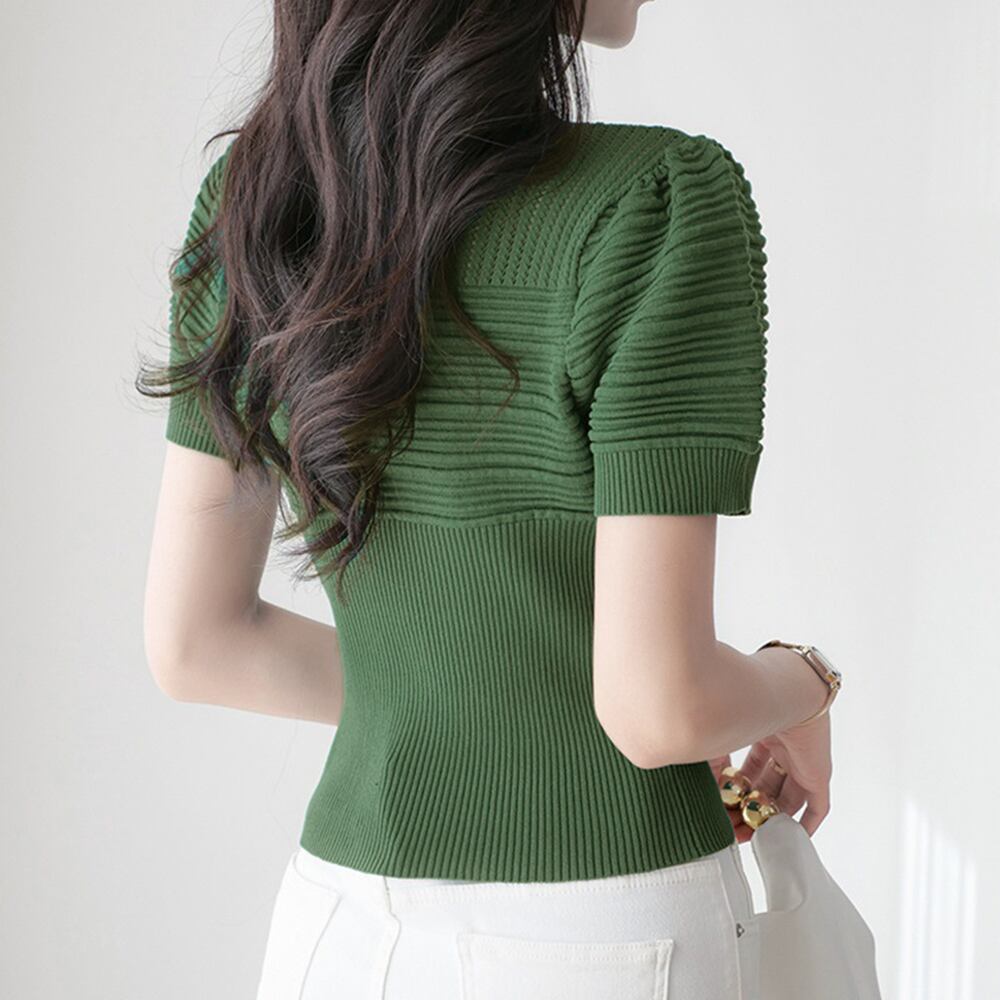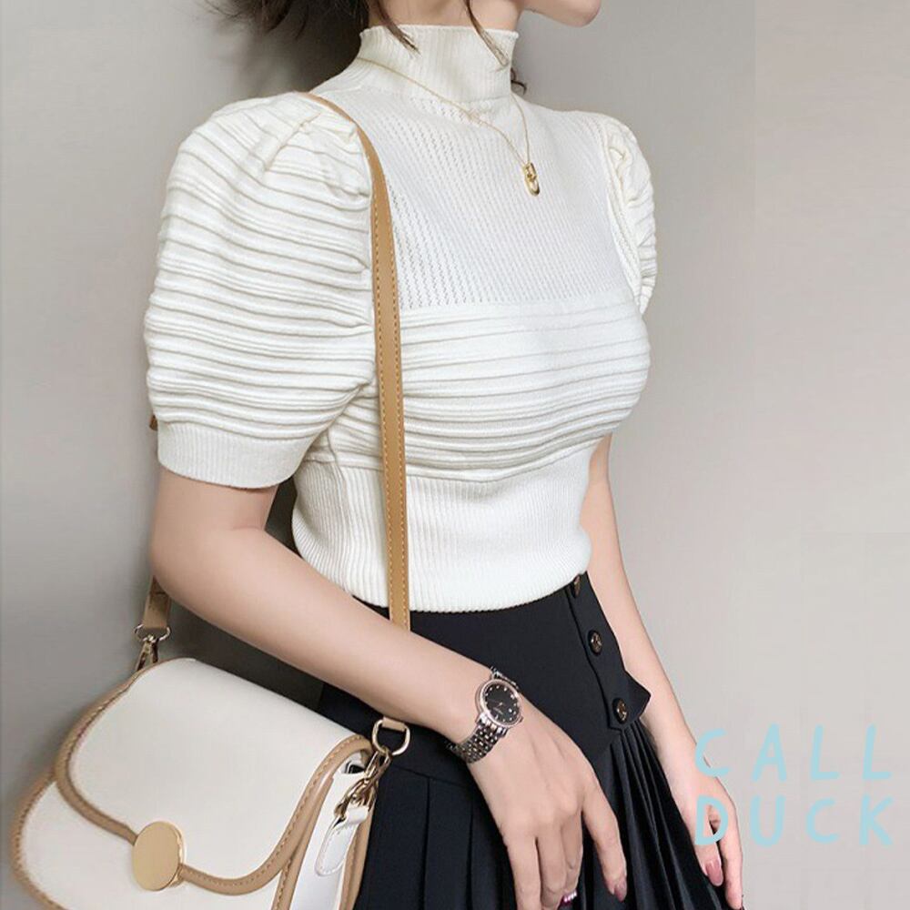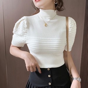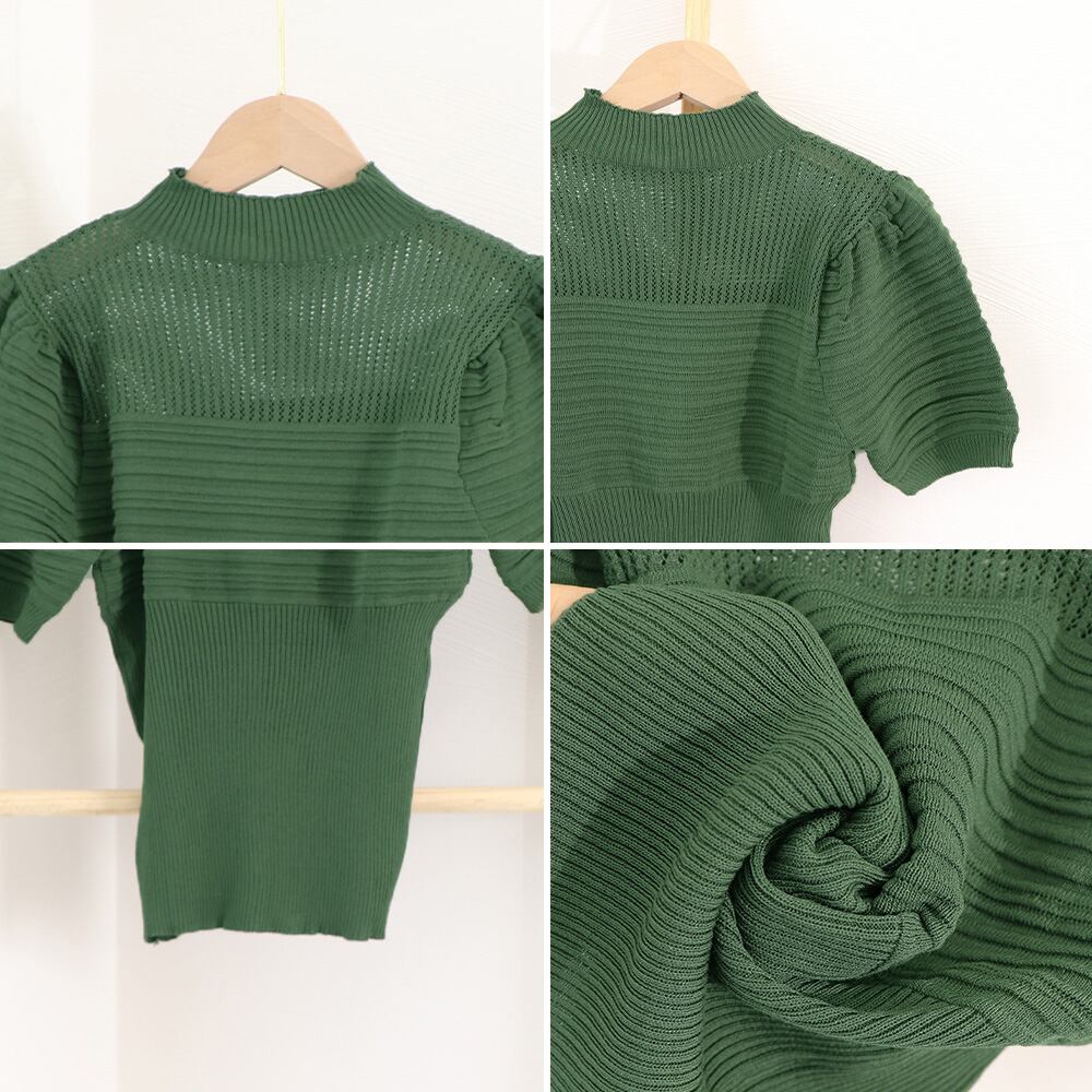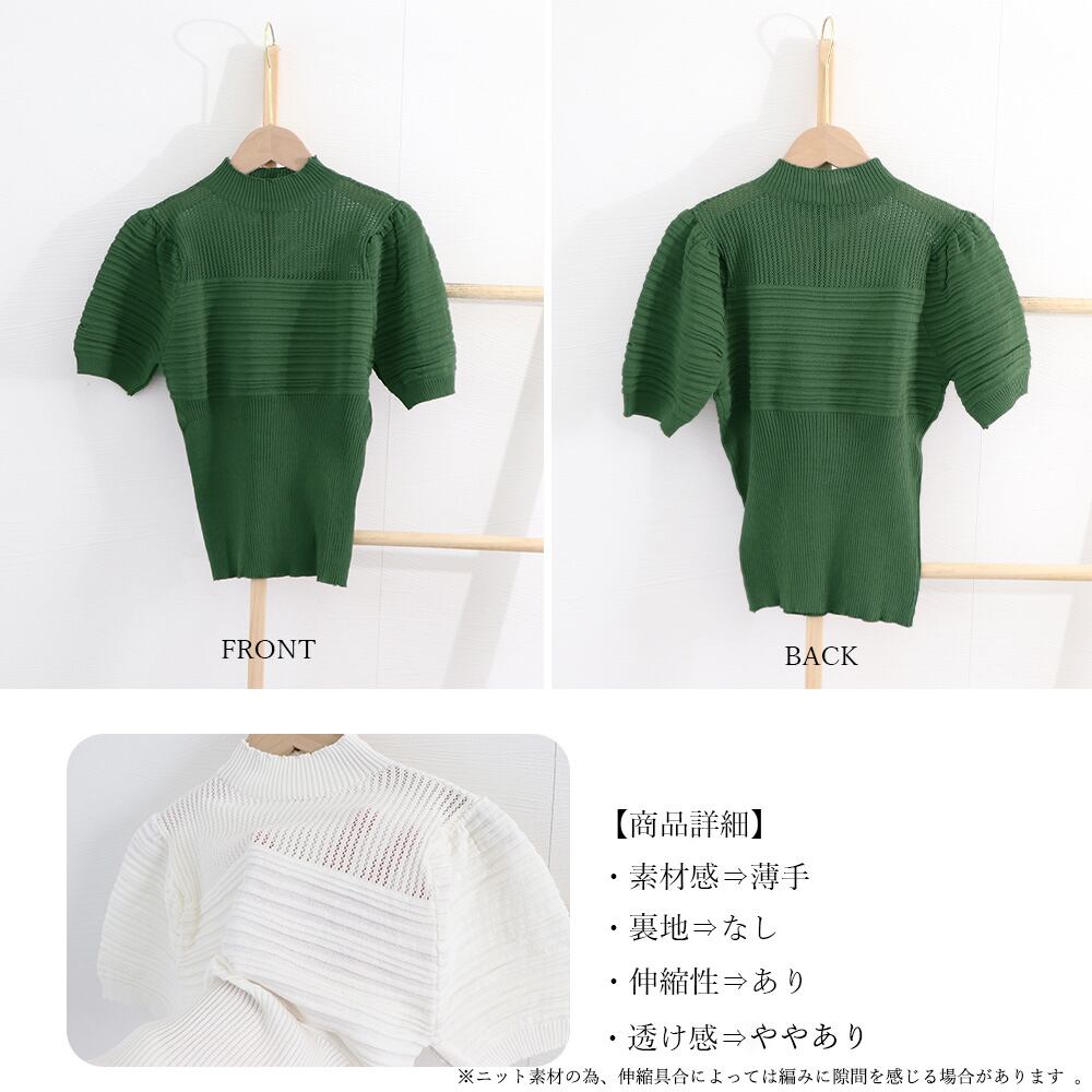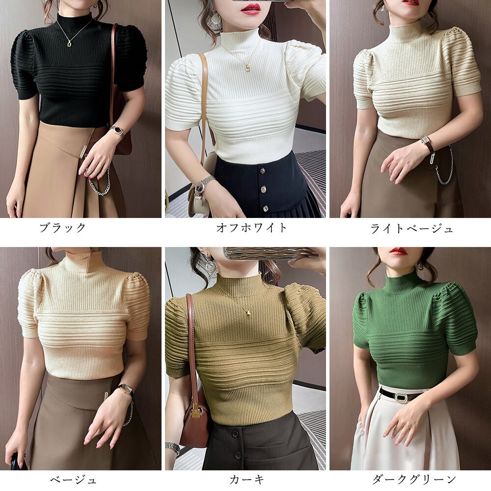パフスリーブ×ハイネックデザインが上品な印象の半袖サマーニットトップス