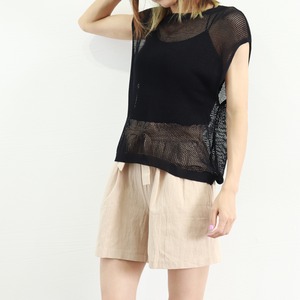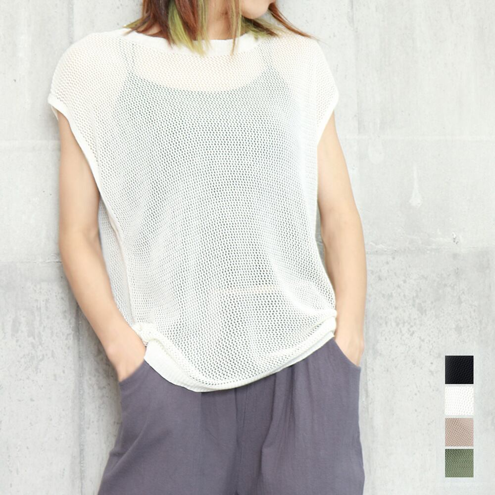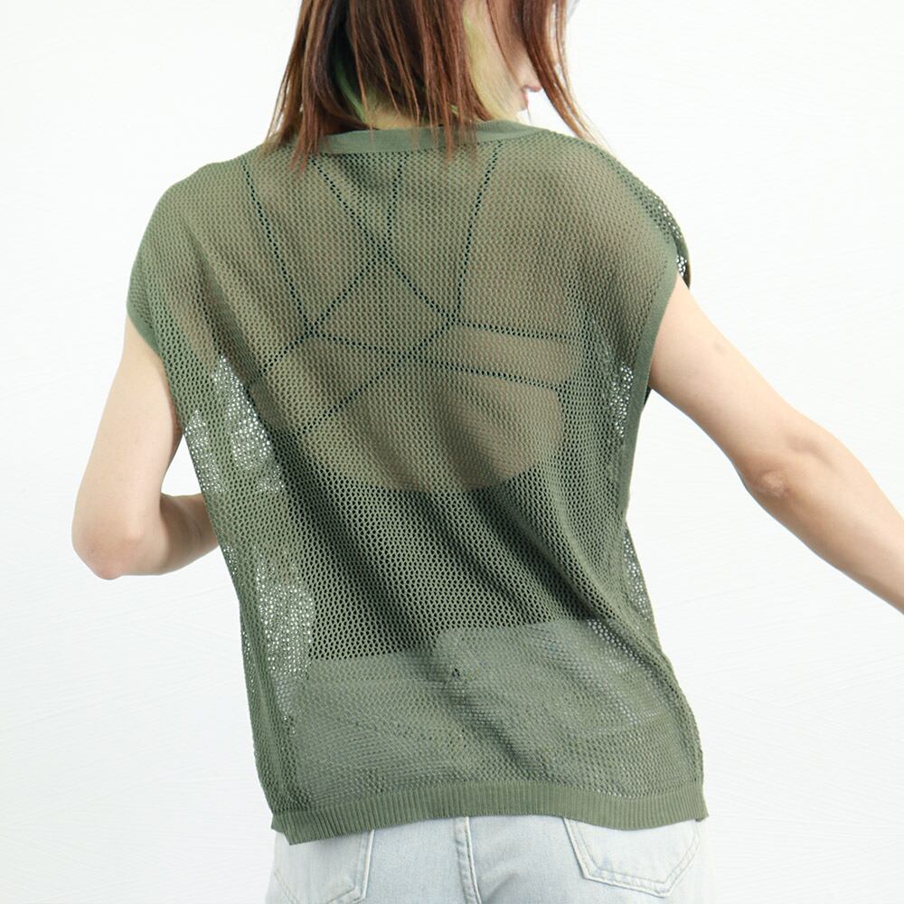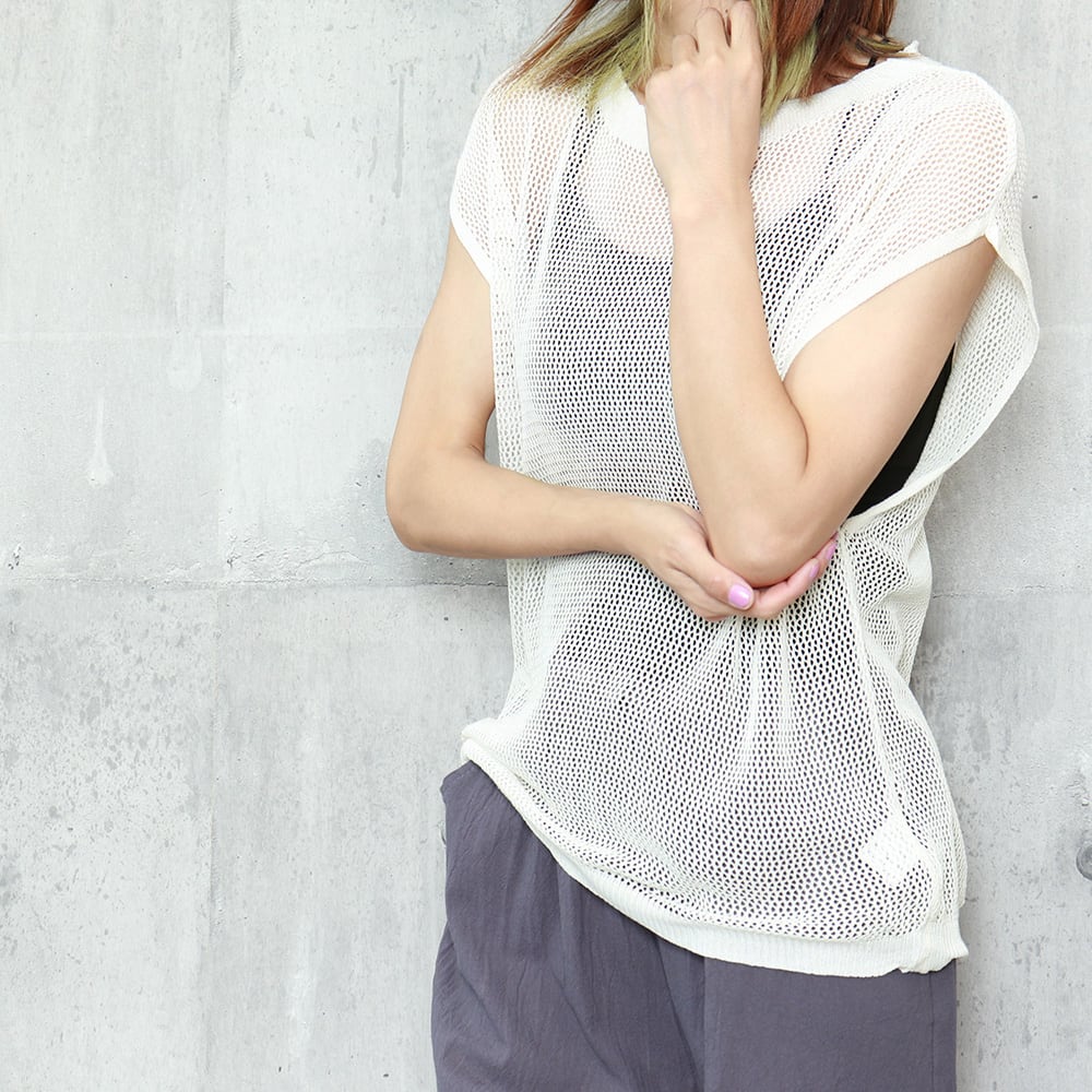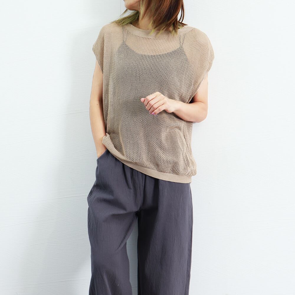 ざっくり編みで抜け感があり、夏に取り入れやすいフレンチ袖の透かし編みトップス