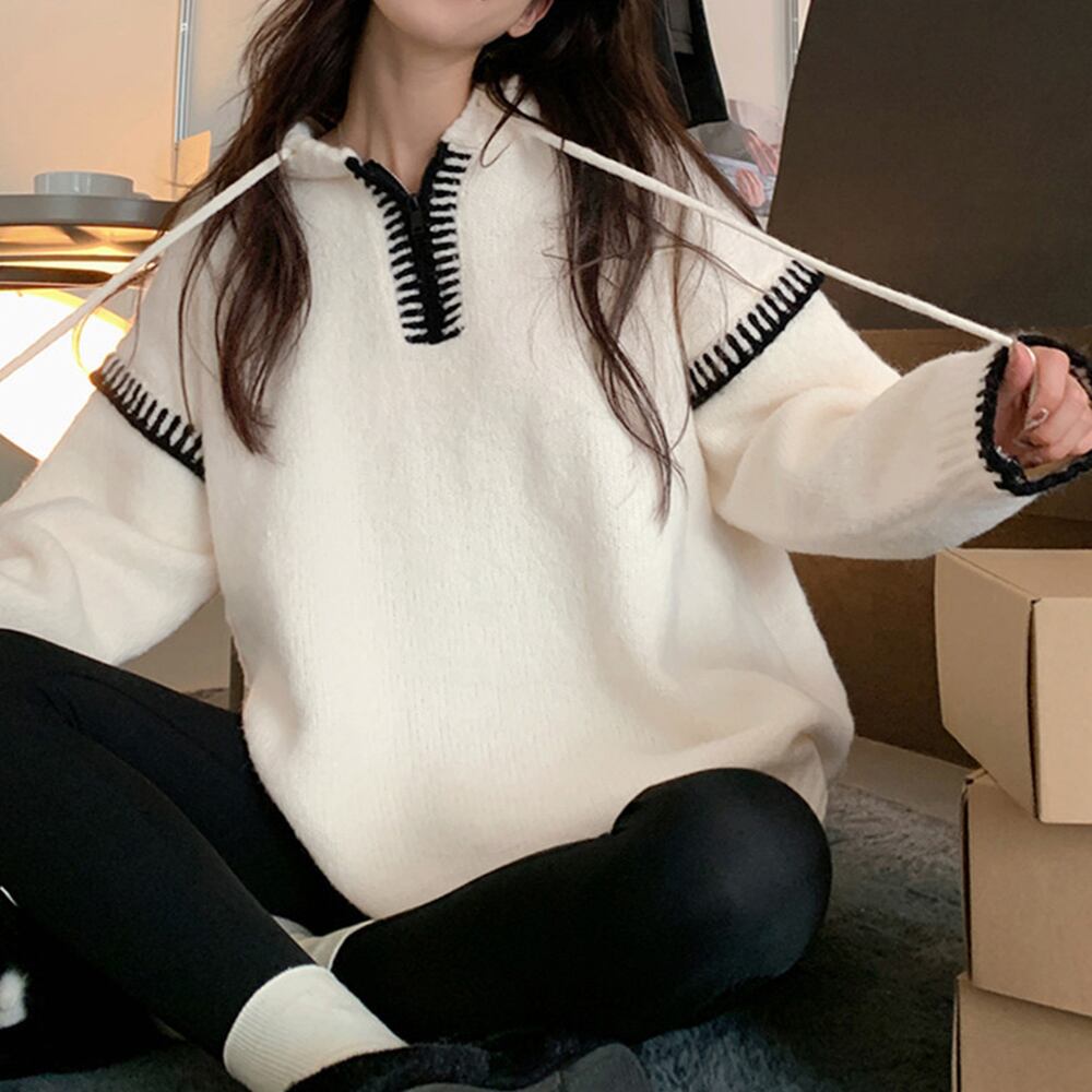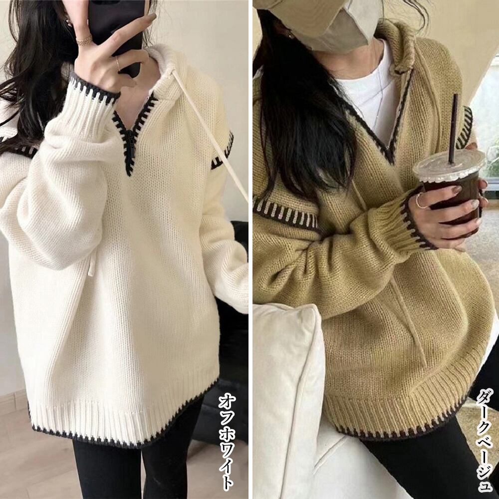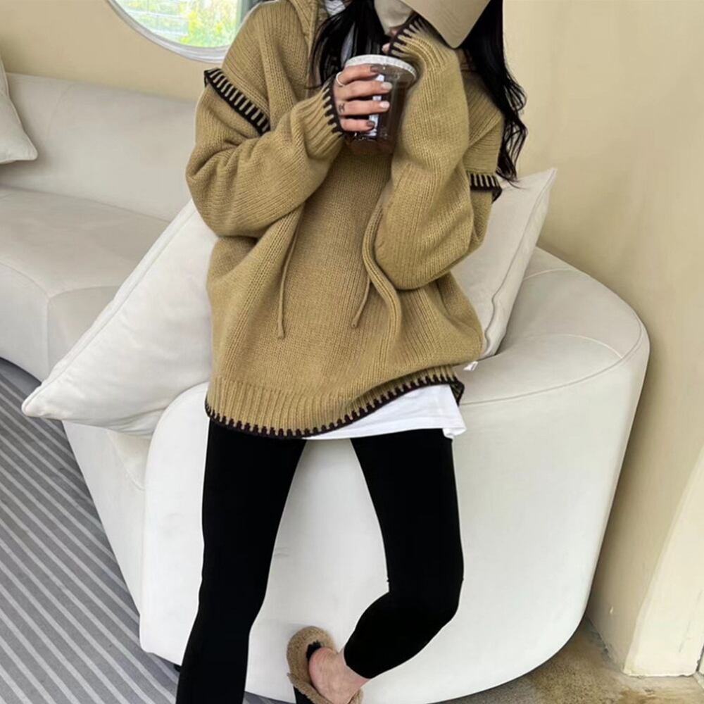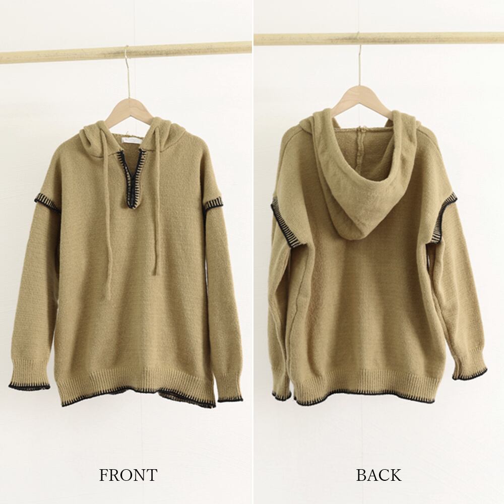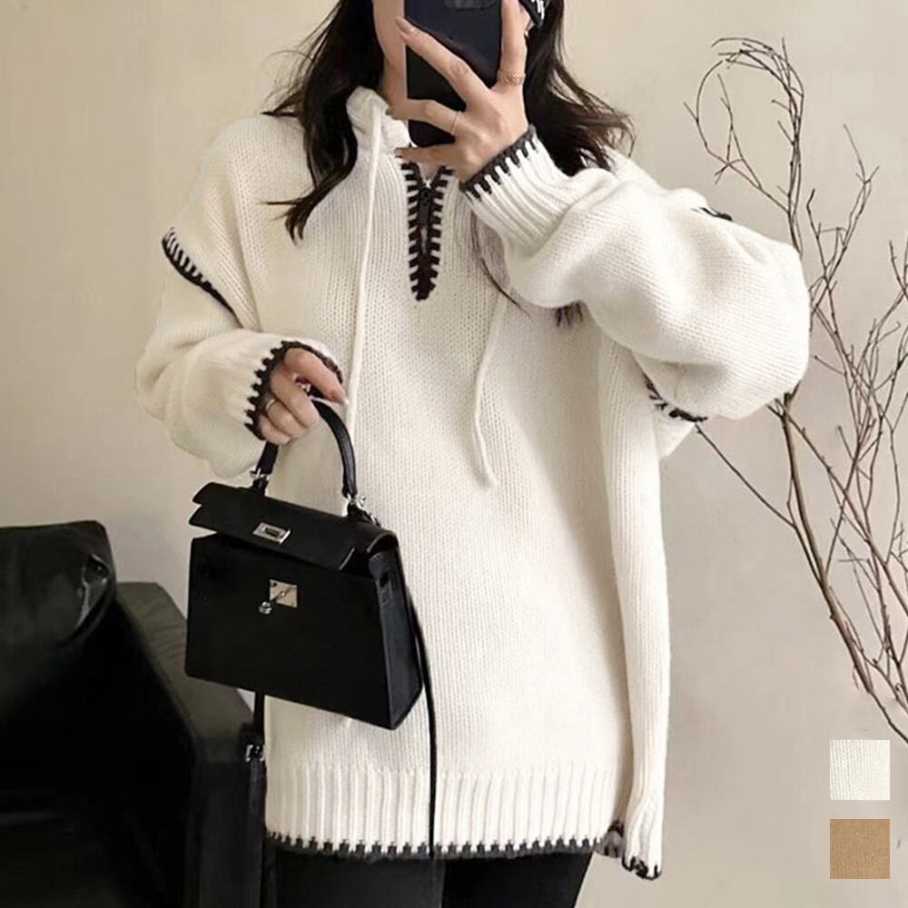 アースカラーで垢抜け間違いなし、ハーフジップが効いたルーズシルエットのニットパーカー
