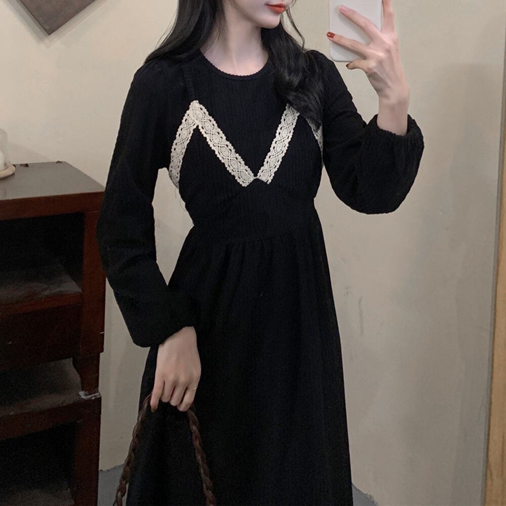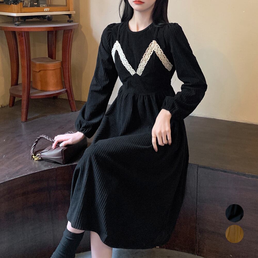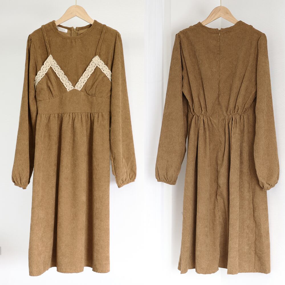 厚手の素材と重ね着風デザインは、寒い季節にも暖かさとスタイリッシュさをかなうコーデュロイワンピースです