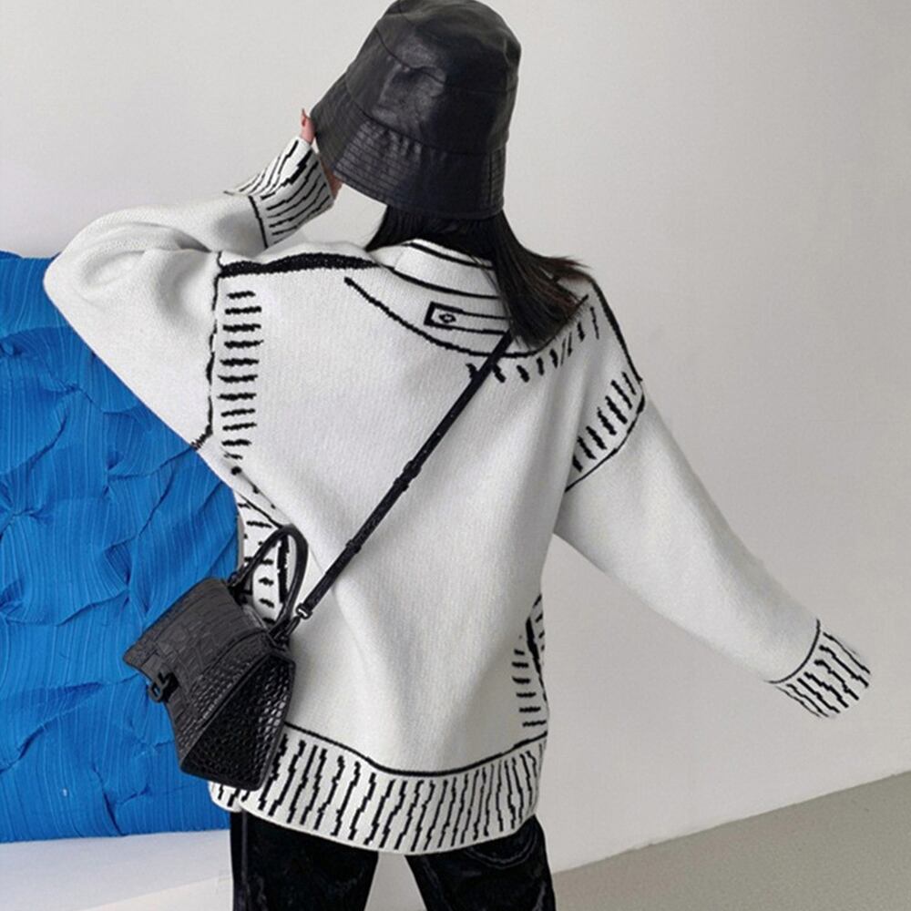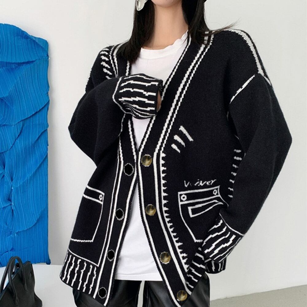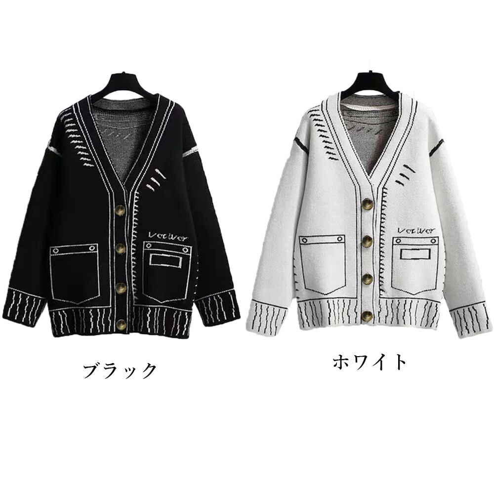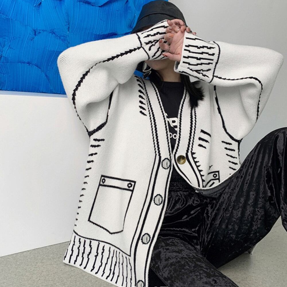 線画風イラストが個性的で他と被らない、落ち着いたモノトーンバイカラーのニットカーディガン