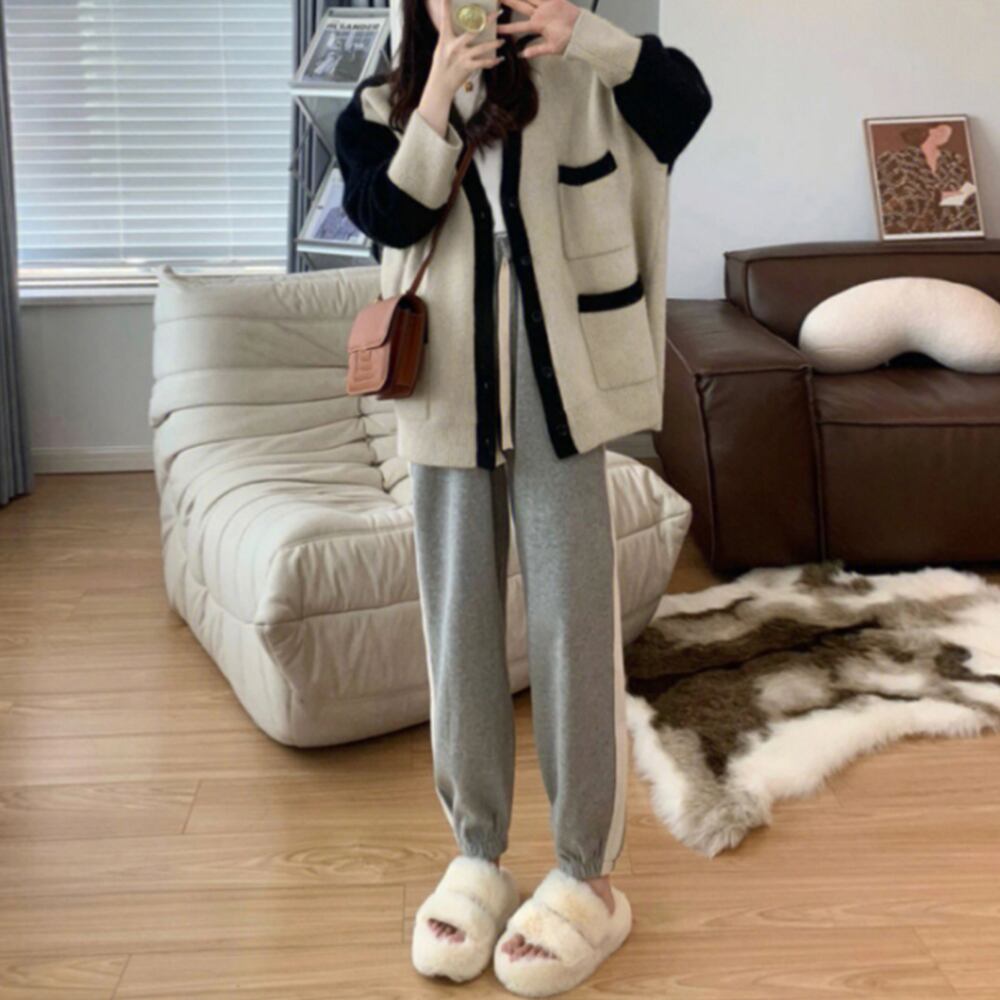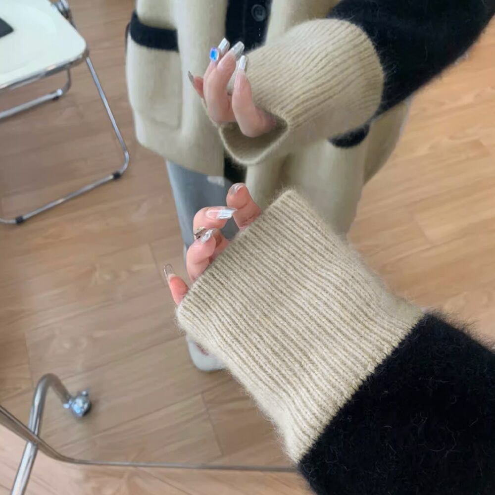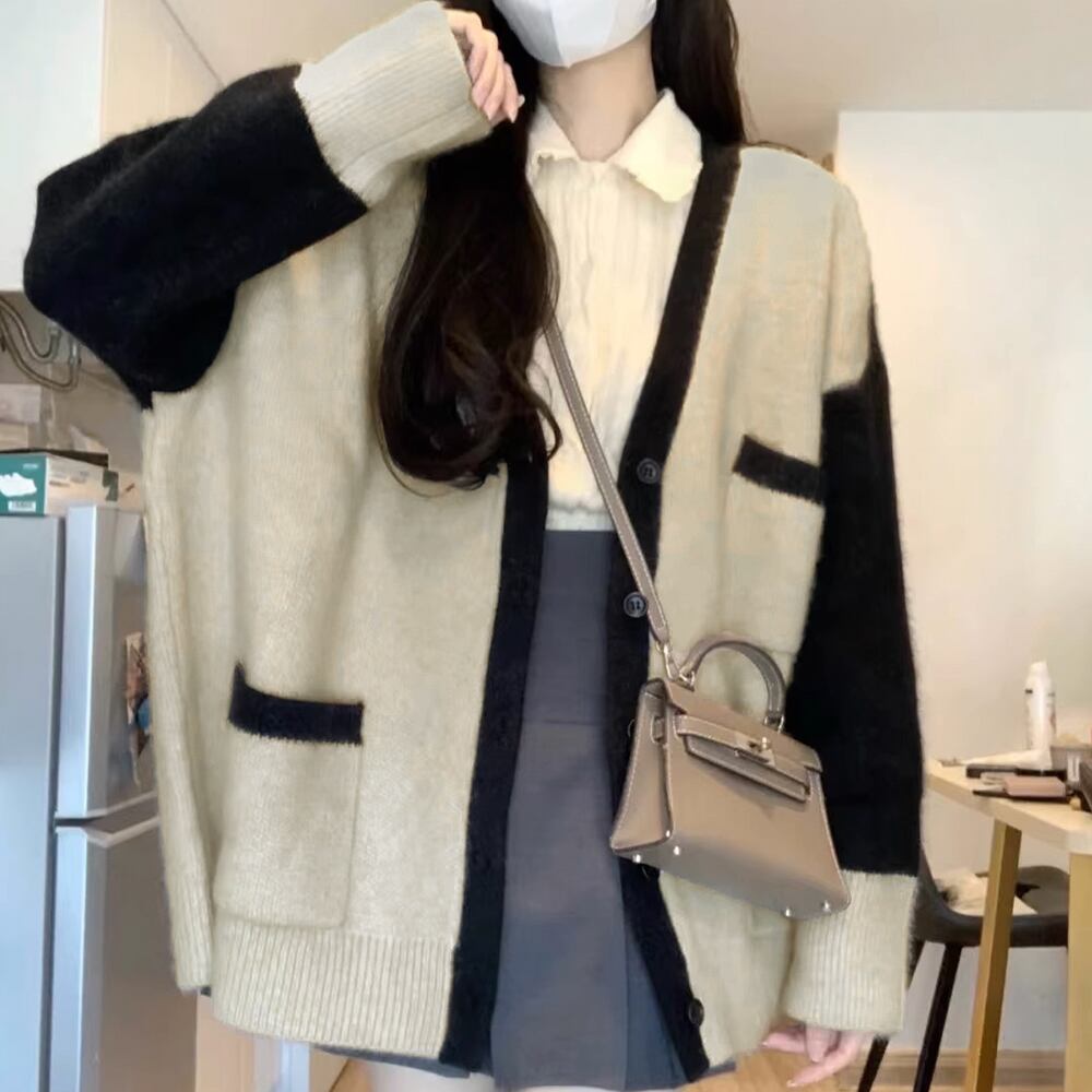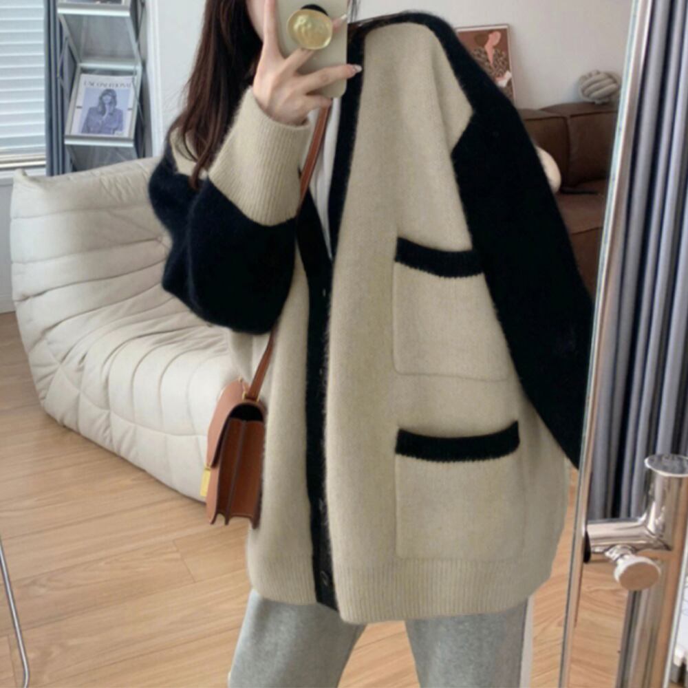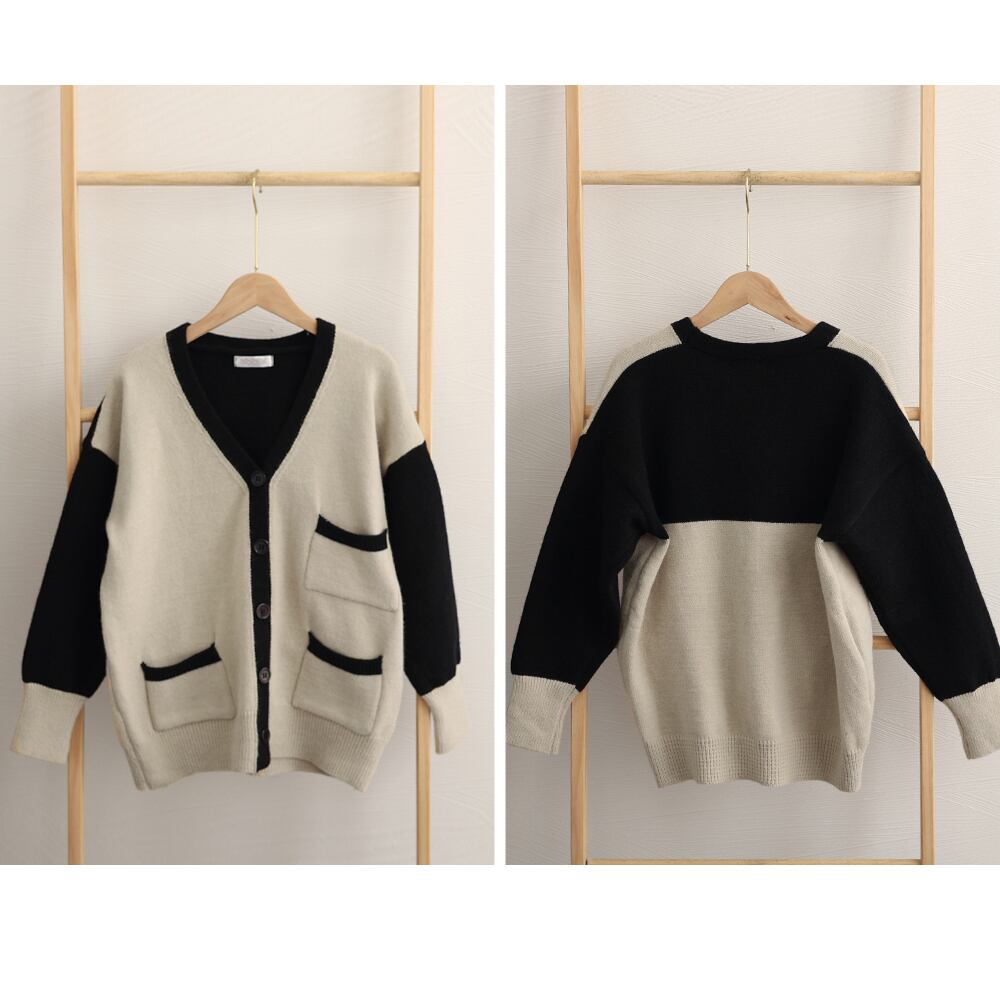 魅力的な配色デザインとゆったりとしたシルエットを楽しめるノーカラーニットカーディガンです