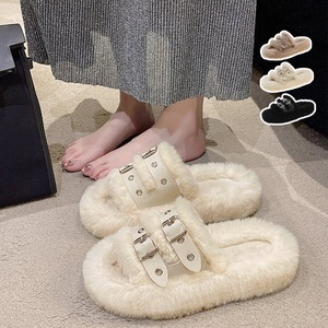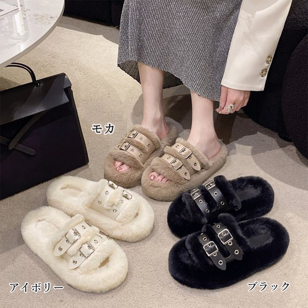 柔らかい雰囲気のファーにクールな印象のレザーベルトを加え、甘過ぎないオトナ女子の足元を華やかでカッコ良く演出