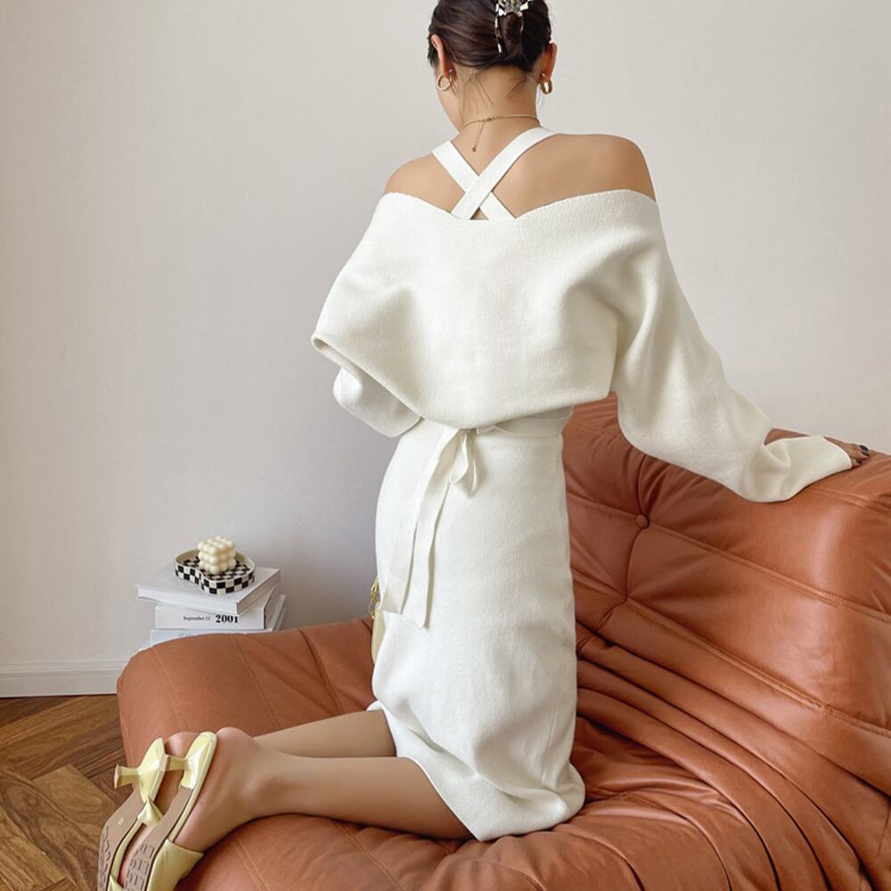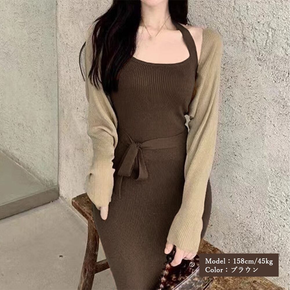 ボレロ風ショートカーデにタイトめキャミワンピがフェミニンな印象を与える韓国DESIGNのリブニット2点セット