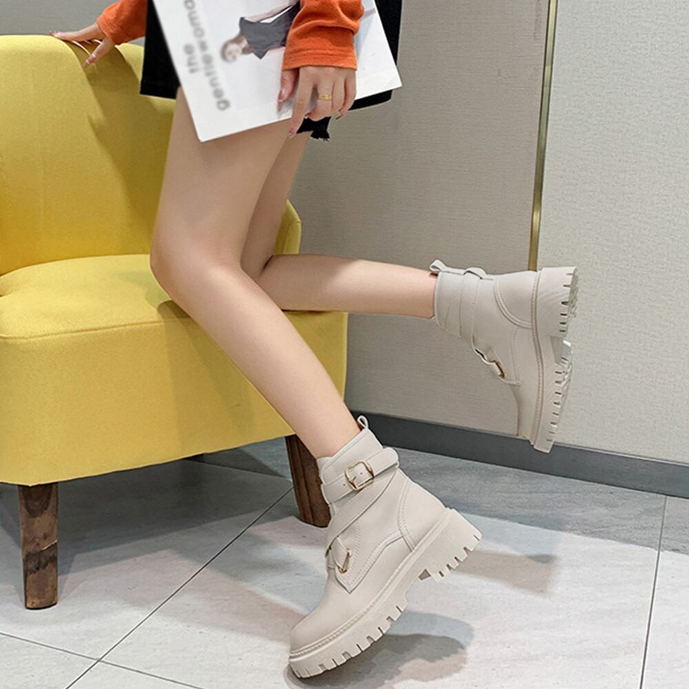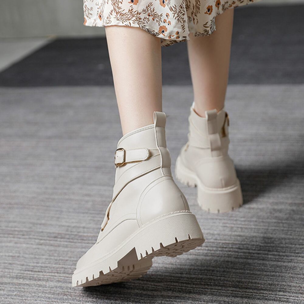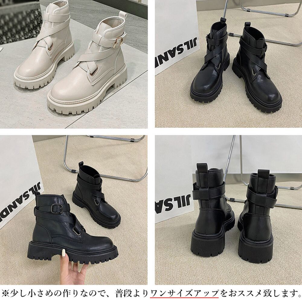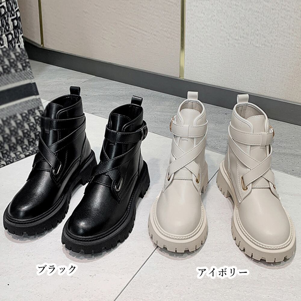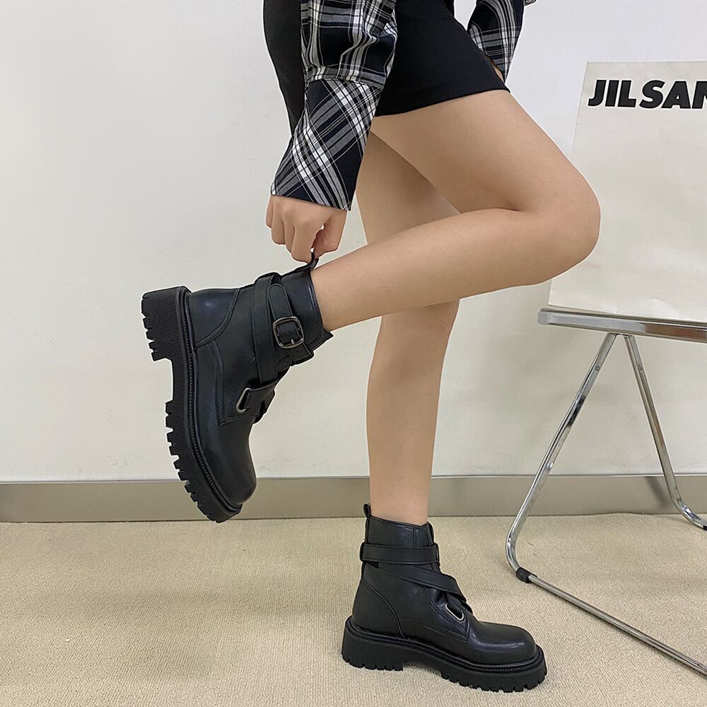 エンジニア風のメンズライクな表情に、クロスさせたダブルベルトとラウンドトゥで女性らしさをさりげなく高めたショートブーツ