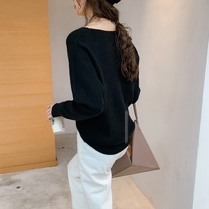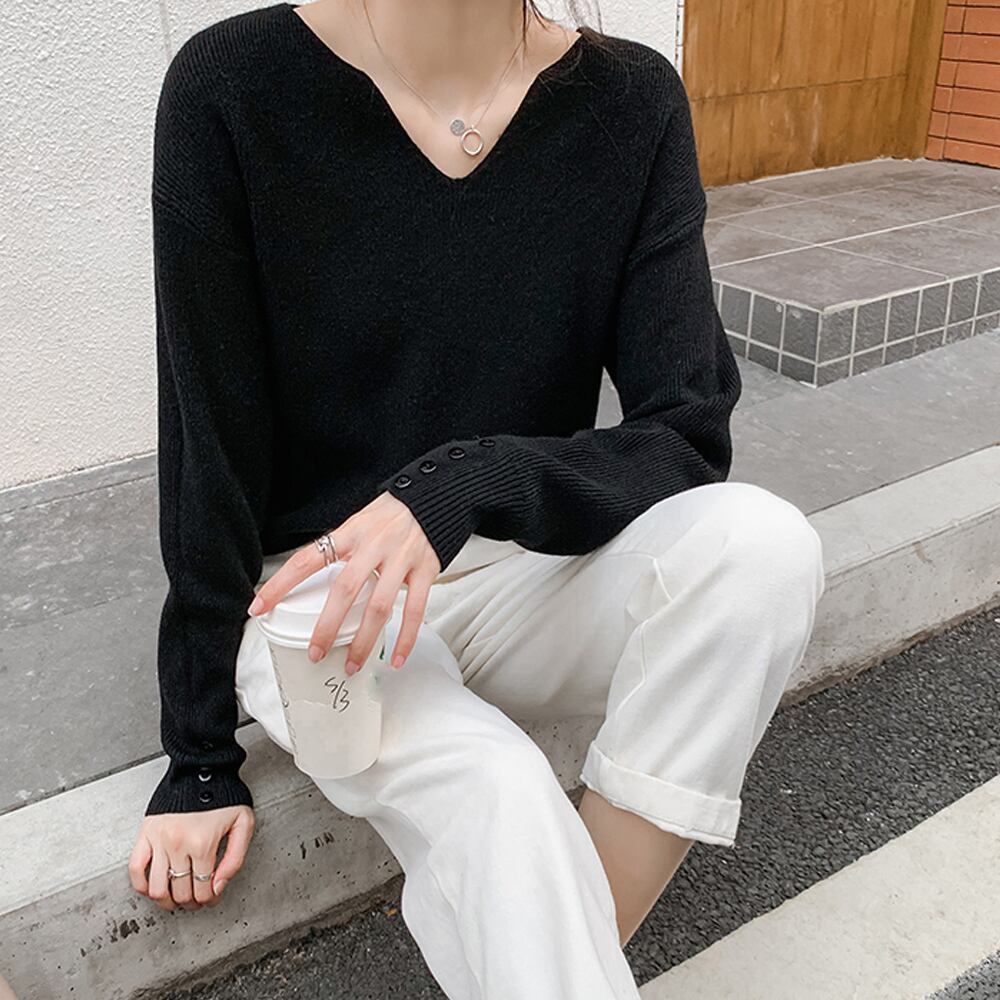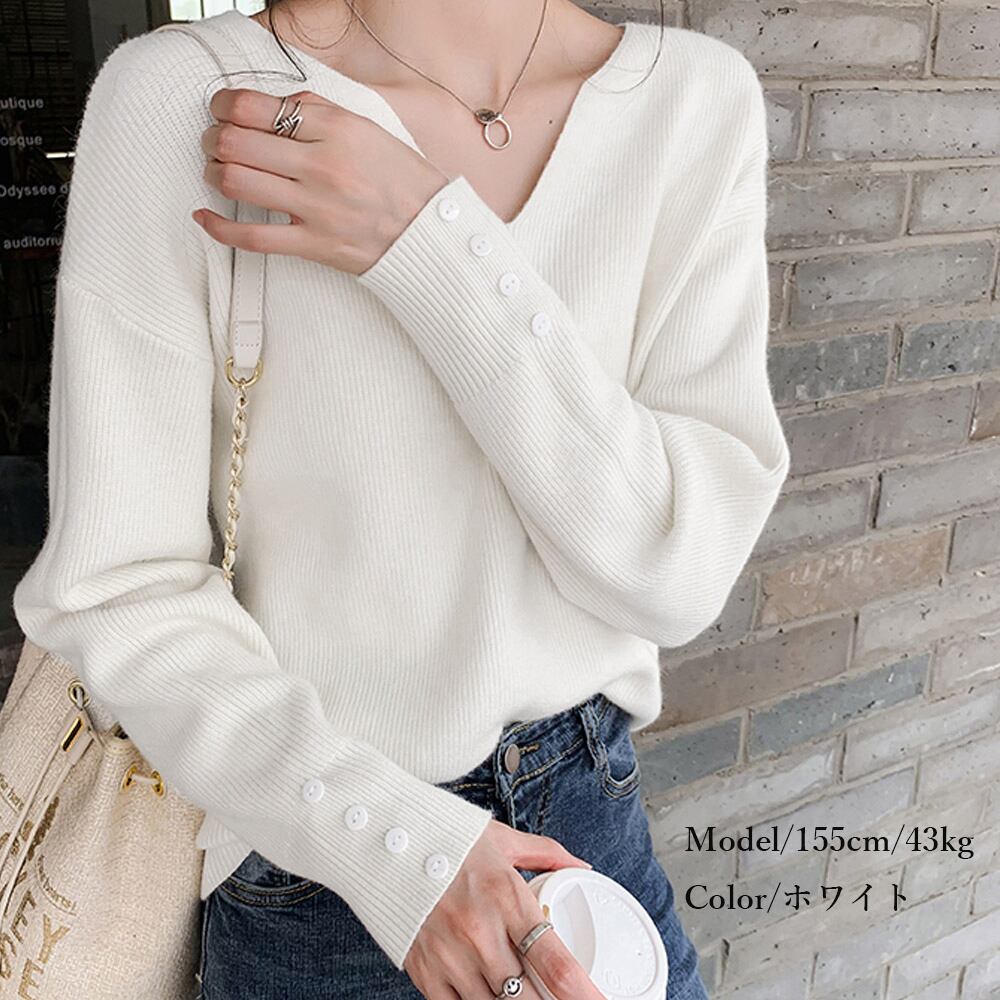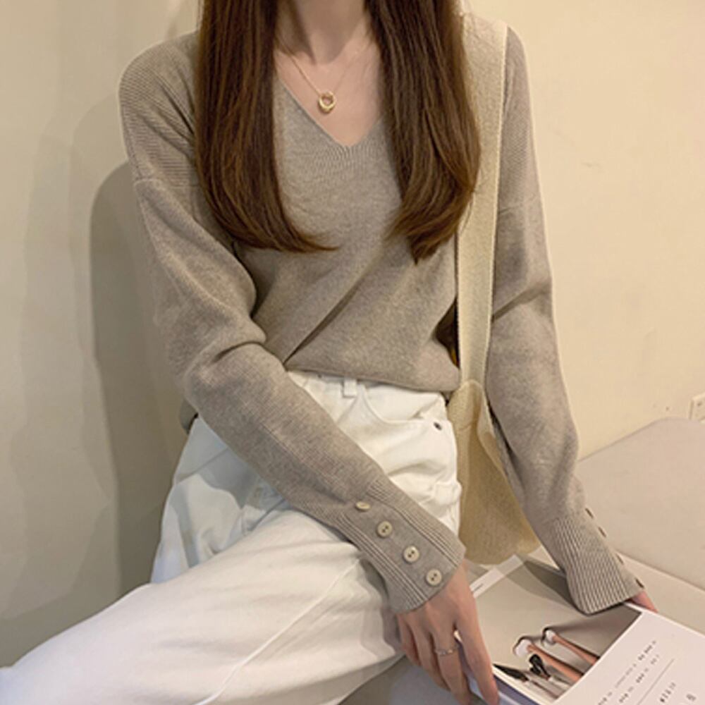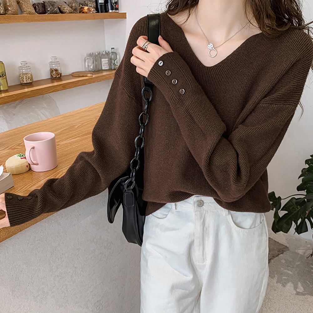 ネックラインスリットと袖にボタンをあしらった、大人っぽいのニットトップス